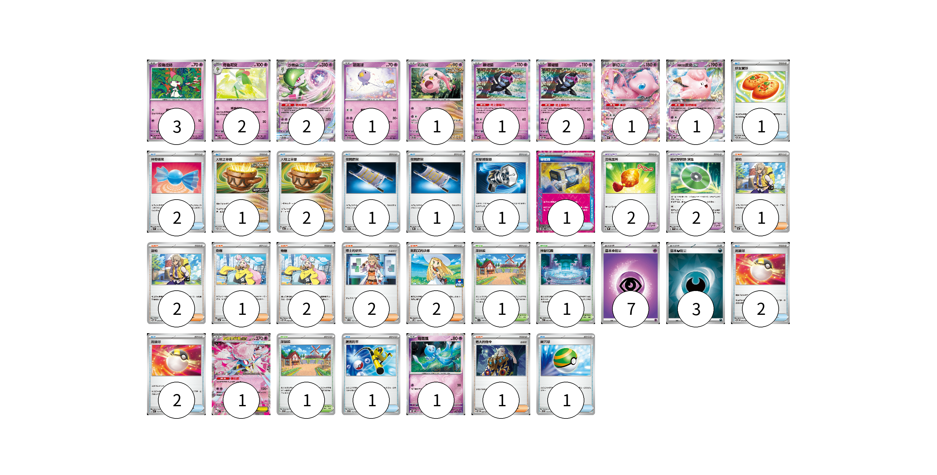 牌組構築方案 以此牌組為基礎新構築牌組 顯示卡面 顯示列表 寶可夢卡(16) 3 2 2 1 1 1 2 1 1 1 1 寶可夢道具(4) 2 2 物品卡(16) 1 2 1 2 1 1 1 1 2 2 1 1 支援者卡(11) 1 2 1 2 2 2 1 競技場卡(3) 1 1 1 能量卡(10) 7 3 寶可夢卡(16) 卡牌名稱 張數 卡牌名稱 張數 拉魯拉絲 M1S 040/063 03 奇魯莉安 M1S 041/063 02 沙奈朵ex SVTS 004/022 02 飄飄球 SVTS 005/022 01 吼叫尾 SVTS 007/022 01 願增猿 SV8a 075/187 01 願增猿 SV6 055/101 02 夢幻ex SV4a 076/190 01 莉莉艾的皮皮ex SV9 033/100 01 超級蒂安希ex MBD 006/022 01 輕飄飄 SV11W 041/086 01 寶可夢道具(4) 卡牌名稱 張數 卡牌名稱 張數 勇氣護符 SV2D 067/071 02 招式學習器 演進 SV4M 063/066 02 物品卡(16) 卡牌名稱 張數 卡牌名稱 張數 好友寶芬 SVOM 012/021 01 神奇糖果 SVK 019/042 02 大地之容器 SV-P 137/SV-P 01 大地之容器 SV4K 060/066 02 夜間擔架 SV6a 056/064 01 夜間擔架 SV8a 151/187 01 反擊捕捉器 SV8a 139/187 01 秘密箱 SV6 092/101 01 高級球 SVOM 013/021 02 高級球 SVK 018/042 02 厲害釣竿 SVF 013/038 01 巢穴球 SVF 016/038 01 支援者卡(11) 卡牌名稱 張數 卡牌名稱 張數 派帕 SV4a 180/190 01 派帕 SVOD 018/020 02 奇樹 SV4a 174/190 01 奇樹 SVOM 018/021 02 博士的研究(奧琳博士) SVD 135/139 02 莉莉艾的決意 M-P 018/M-P 02 老大的指令 SVOM 020/021 01 競技場卡(3) 卡牌名稱 張數 卡牌名稱 張數 深缽鎮 SV1a 070/073 01 神秘花園 M1S 063/063 01 深缽鎮 SVF 036/038 01 能量卡(10) 卡牌名稱 張數 卡牌名稱 張數 基本【超】能量 MBD PSY 07 基本【惡】能量 SVOM DAR 03 以此牌組為基礎新構築牌組 牌組編碼 KhbQWR-PMZgyt-wnZKcq copy 列印牌組單 牌組編碼已複製 分享至SNS