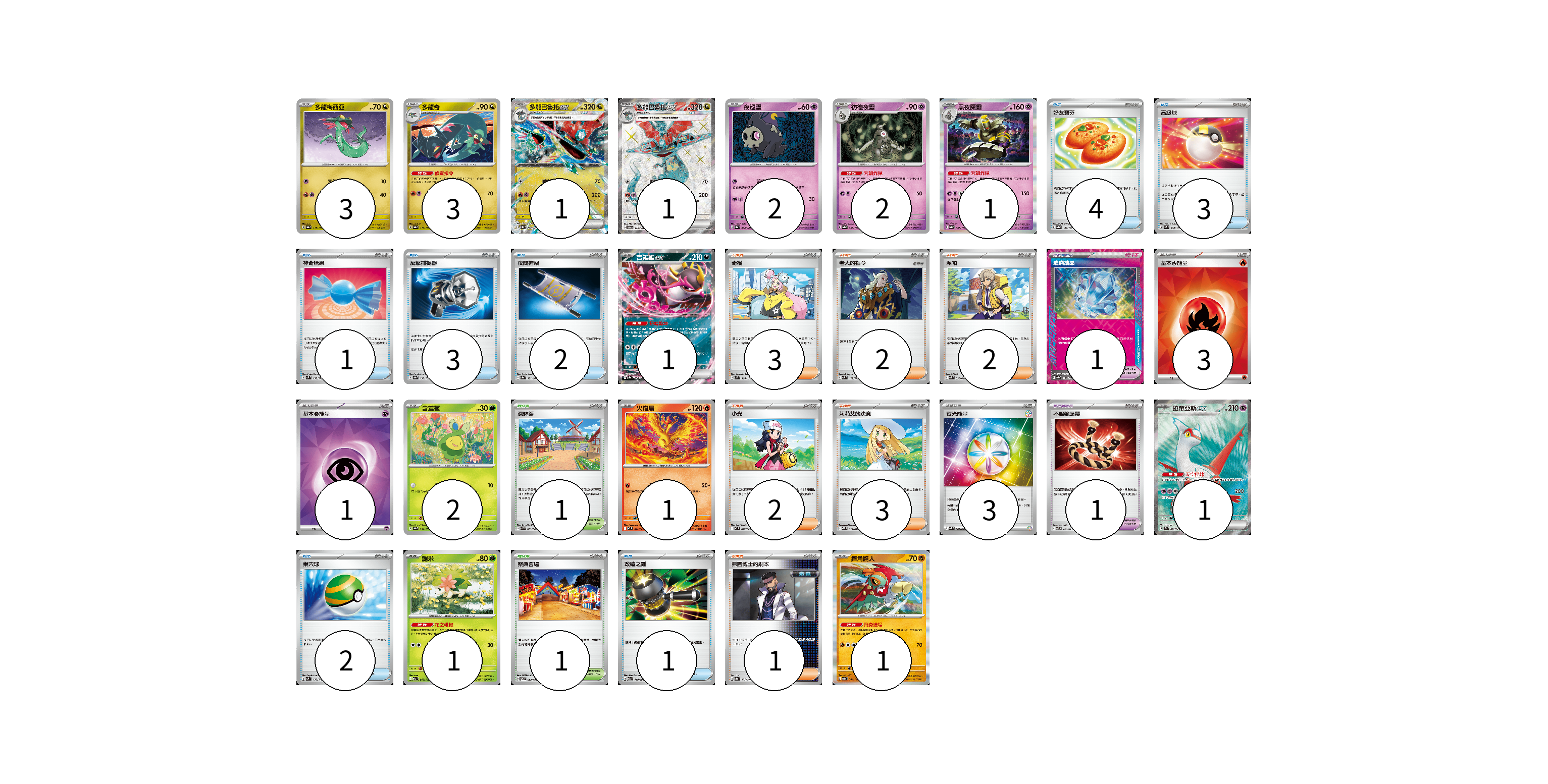 牌組構築方案 以此牌組為基礎新構築牌組 顯示卡面 顯示列表 寶可夢卡(20) 3 3 1 1 2 2 1 1 2 1 1 1 1 寶可夢道具(2) 1 1 物品卡(16) 4 3 1 3 2 2 1 支援者卡(13) 3 2 2 2 3 1 競技場卡(2) 1 1 能量卡(7) 3 1 3 寶可夢卡(20) 卡牌名稱 張數 卡牌名稱 張數 多龍梅西亞 SV8a 118/187 03 多龍奇 SV8a 119/187 03 多龍巴魯托ex SV8a 120/187 01 多龍巴魯托ex SV6 120/101 01 夜巡靈 SV8a 064/187 02 彷徨夜靈 SV8a 065/187 02 黑夜魔靈 SV8a 066/187 01 吉雉雞ex SV8a 104/187 01 含羞苞 SV8a 001/187 02 火焰鳥 M2 014/080 01 拉帝亞斯ex SV7a 078/064 01 謝米 M2a 012/193 01 摔角鷹人 SV8a 084/187 01 寶可夢道具(2) 卡牌名稱 張數 卡牌名稱 張數 璀璨結晶 SV8a 152/187 01 不服輸頭帶 SVTL 016/021 01 物品卡(16) 卡牌名稱 張數 卡牌名稱 張數 好友寶芬 SV8a 147/187 04 高級球 SVM 134/175 03 神奇糖果 SVM 135/175 01 反擊捕捉器 SV8a 139/187 03 夜間擔架 SV8a 151/187 02 巢穴球 SVM 133/175 02 改造之錘 M2a 148/193 01 支援者卡(13) 卡牌名稱 張數 卡牌名稱 張數 奇樹 SVM 160/175 03 老大的指令 SVM 172/175 02 派帕 SVK 035/042 02 小光 M2 077/080 02 莉莉艾的決意 MBD 021/022 03 弗圖博士的劇本 SV8a 175/187 01 競技場卡(2) 卡牌名稱 張數 卡牌名稱 張數 深缽鎮 SVK 039/042 01 祭典會場 SV6 099/101 01 能量卡(7) 卡牌名稱 張數 卡牌名稱 張數 基本【火】能量 SVK FIR 03 基本【超】能量 SVK PSY 01 夜光能量 SVK 042/042 03 以此牌組為基礎新構築牌組 牌組編碼 KiNQfu-VoIRsN-NeWPjP copy 列印牌組單 牌組編碼已複製 分享至SNS