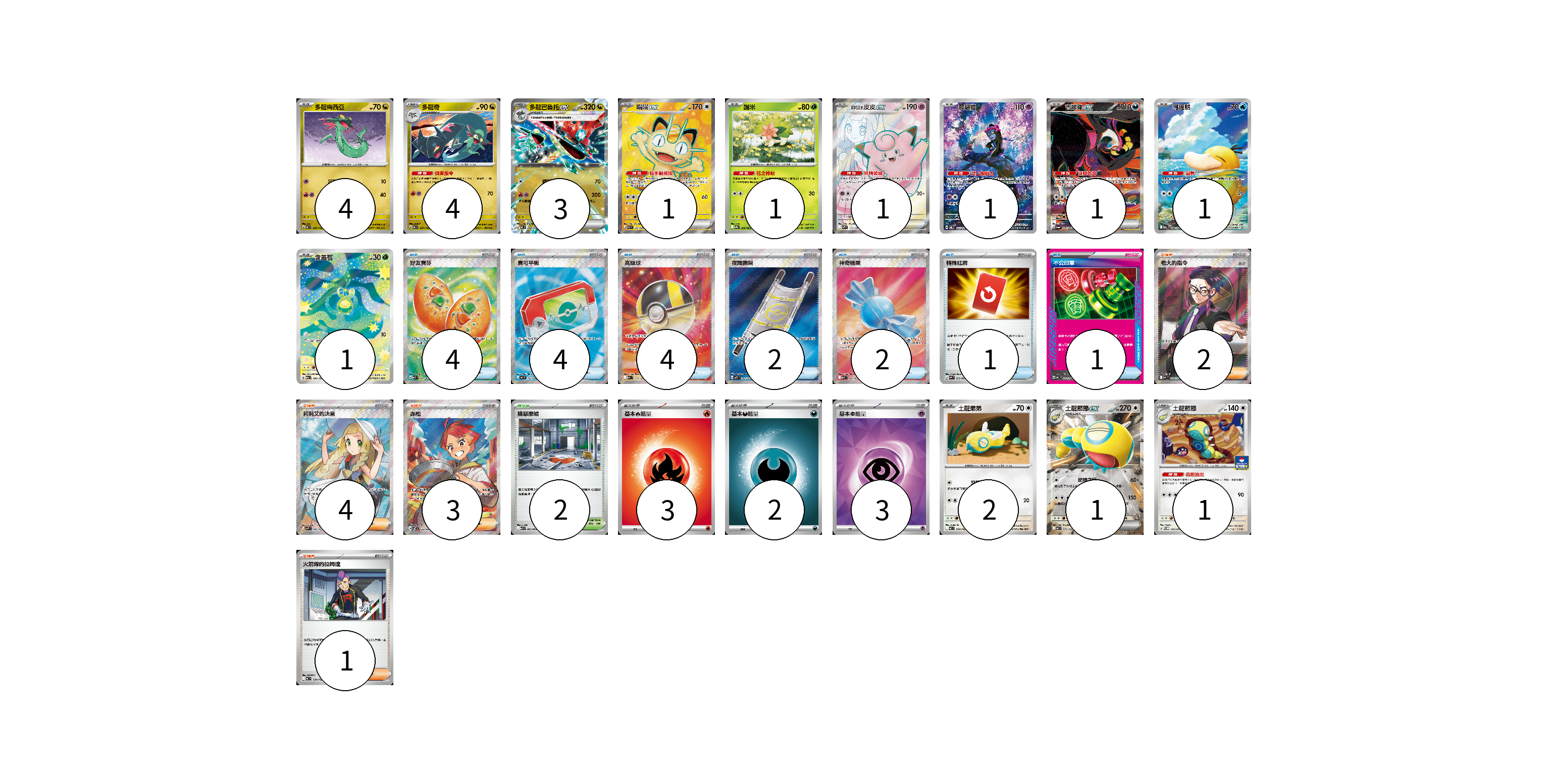 牌組構築方案 以此牌組為基礎新構築牌組 顯示卡面 顯示列表 寶可夢卡(22) 4 4 3 1 1 1 1 1 1 1 2 1 1 物品卡(18) 4 4 4 2 2 1 1 支援者卡(10) 2 4 3 1 競技場卡(2) 2 能量卡(8) 3 2 3 寶可夢卡(22) 卡牌名稱 張數 卡牌名稱 張數 多龍梅西亞 MC 546/742 04 多龍奇 MC 547/742 04 多龍巴魯托ex MC 548/742 03 喵喵ex M3 100/080 01 謝米 SV9a 006/063 01 莉莉艾的皮皮ex SV9 115/100 01 願增猿 SV6 107/101 01 吉雉雞ex SV6a 089/064 01 可達鴨 M2a 199/193 01 含羞苞 M2a 196/193 01 土龍弟弟 MC 574/742 02 土龍節節ex MC 575/742 01 土龍節節 M-P 045/M-P 01 物品卡(18) 卡牌名稱 張數 卡牌名稱 張數 好友寶芬 M1S 081/063 04 寶可平板 M3 103/080 04 高級球 M2a 216/193 04 夜間擔架 M1L 083/063 02 神奇糖果 M1S 082/063 02 特殊紅牌 M4 072/083 01 不公印章 MC 633/742 01 支援者卡(10) 卡牌名稱 張數 卡牌名稱 張數 老大的指令(烏羽) MC 760/742 02 莉莉艾的決意 M1L 086/063 04 赤松 SV7 123/102 03 火箭隊的拉姆達 MC 734/742 01 競技場卡(2) 卡牌名稱 張數 卡牌名稱 張數 險惡廢墟 M1L 063/063 02 能量卡(8) 卡牌名稱 張數 卡牌名稱 張數 基本【火】能量 MC FIR 03 基本【惡】能量 MC DAR 02 基本【超】能量 SVOD PSY 03 以此牌組為基礎新構築牌組 牌組編碼 KiqqbH-VibBxG-gzYuzF copy 列印牌組單 牌組編碼已複製 分享至SNS