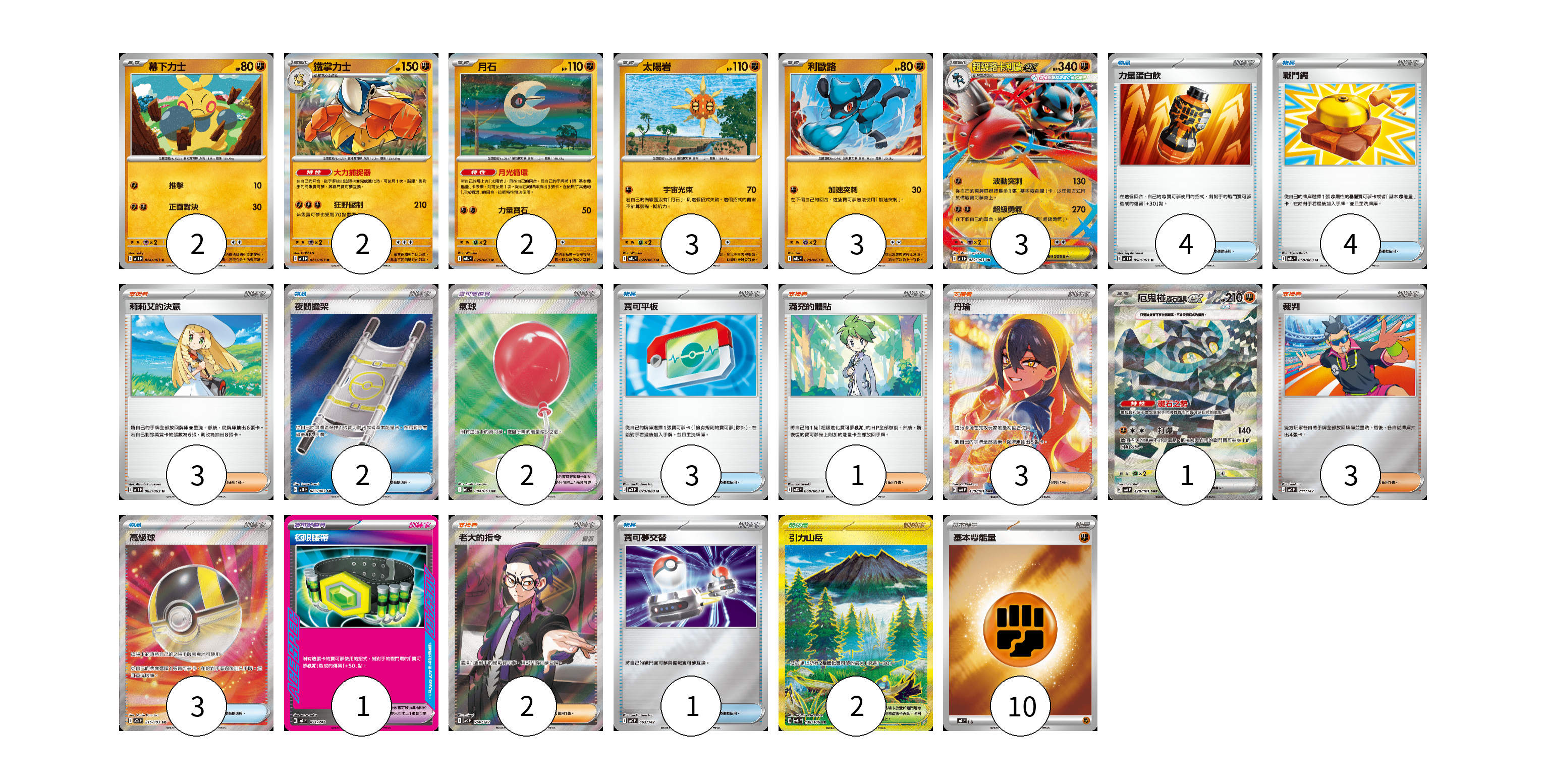 牌組構築方案 以此牌組為基礎新構築牌組 顯示卡面 顯示列表 寶可夢卡(16) 2 2 2 3 3 3 1 寶可夢道具(3) 2 1 物品卡(17) 4 4 2 3 3 1 支援者卡(12) 3 1 3 3 2 競技場卡(2) 2 能量卡(10) 10 寶可夢卡(16) 卡牌名稱 張數 卡牌名稱 張數 幕下力士 M1L 024/063 02 鐵掌力士 M1L 025/063 02 月石 M1L 026/063 02 太陽岩 M1L 027/063 03 利歐路 M1L 028/063 03 超級路卡利歐ex M1L 029/063 03 厄鬼椪 礎石面具ex SV6 128/101 01 寶可夢道具(3) 卡牌名稱 張數 卡牌名稱 張數 氣球 M1L 084/063 02 極限腰帶 MC 691/742 01 物品卡(17) 卡牌名稱 張數 卡牌名稱 張數 力量蛋白飲 M1L 058/063 04 戰鬥鑼 M1L 059/063 04 夜間擔架 M1L 083/063 02 寶可平板 M3 070/080 03 高級球 M2a 216/193 03 寶可夢交替 MC 663/742 01 支援者卡(12) 卡牌名稱 張數 卡牌名稱 張數 莉莉艾的決意 M1L 062/063 03 滿充的體貼 M1S 060/063 01 丹瑜 SV6 130/101 03 裁判 MC 711/742 03 老大的指令(烏羽) MC 760/742 02 競技場卡(2) 卡牌名稱 張數 卡牌名稱 張數 引力山岳 SV8 138/106 02 能量卡(10) 卡牌名稱 張數 卡牌名稱 張數 基本【鬥】能量 MC FIG 10 以此牌組為基礎新構築牌組 牌組編碼 KmkaUT-oStear-hmNraP copy 列印牌組單 牌組編碼已複製 分享至SNS