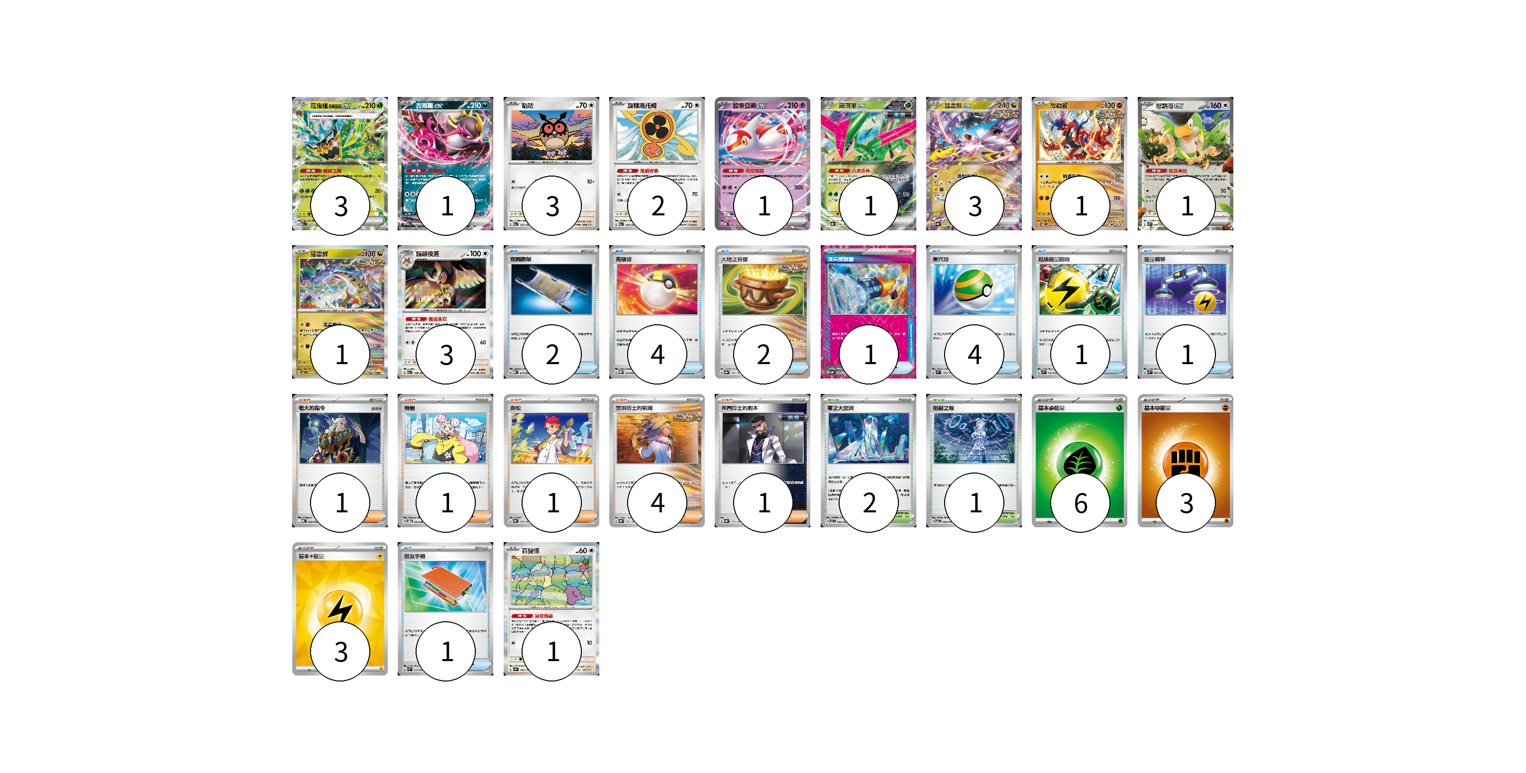 牌組構築方案 以此牌組為基礎新構築牌組 顯示卡面 顯示列表 寶可夢卡(21) 3 1 3 2 1 1 3 1 1 1 3 1 物品卡(16) 2 4 2 1 4 1 1 1 支援者卡(8) 1 1 1 4 1 競技場卡(3) 2 1 能量卡(12) 6 3 3 寶可夢卡(21) 卡牌名稱 張數 卡牌名稱 張數 厄鬼椪 碧草面具ex M2a 017/193 03 吉雉雞ex M2a 114/193 01 咕咕 M2a 137/193 03 旋轉洛托姆 M2a 139/193 02 拉帝亞斯ex MBD 003/022 01 鐵斑葉ex SV8a 016/187 01 猛雷鼓ex SV8a 124/187 03 故勒頓 SV8 069/106 01 怒鸚哥ex SVK 006/042 01 猛雷鼓 SV7 075/102 01 貓頭夜鷹 M2a 138/193 03 百變怪 SV4a 144/190 01 物品卡(16) 卡牌名稱 張數 卡牌名稱 張數 夜間擔架 MBG 017/022 02 高級球 SVQP 015/023 04 大地之容器 SV8a 143/187 02 頂尖捕捉器 SV8a 148/187 01 巢穴球 SVM 133/175 04 超級能量回收 SVK 010/042 01 能量轉移 SVK 008/042 01 朋友手冊 SVK 014/042 01 支援者卡(8) 卡牌名稱 張數 卡牌名稱 張數 老大的指令 MBD 020/022 01 奇樹 SVOD 016/020 01 赤松 SV8a 163/187 01 奧琳博士的氣魄 SV8a 167/187 04 弗圖博士的劇本 SV8a 175/187 01 競技場卡(3) 卡牌名稱 張數 卡牌名稱 張數 零之大空洞 SV7 102/102 02 阻礙之塔 SV6 100/101 01 能量卡(12) 卡牌名稱 張數 卡牌名稱 張數 基本【草】能量 M-P GRA 06 基本【鬥】能量 M-P FIG 03 基本【雷】能量 SVQP LIG 03 以此牌組為基礎新構築牌組 牌組編碼 KnYHGC-oZradi-kjOsmZ copy 列印牌組單 牌組編碼已複製 分享至SNS