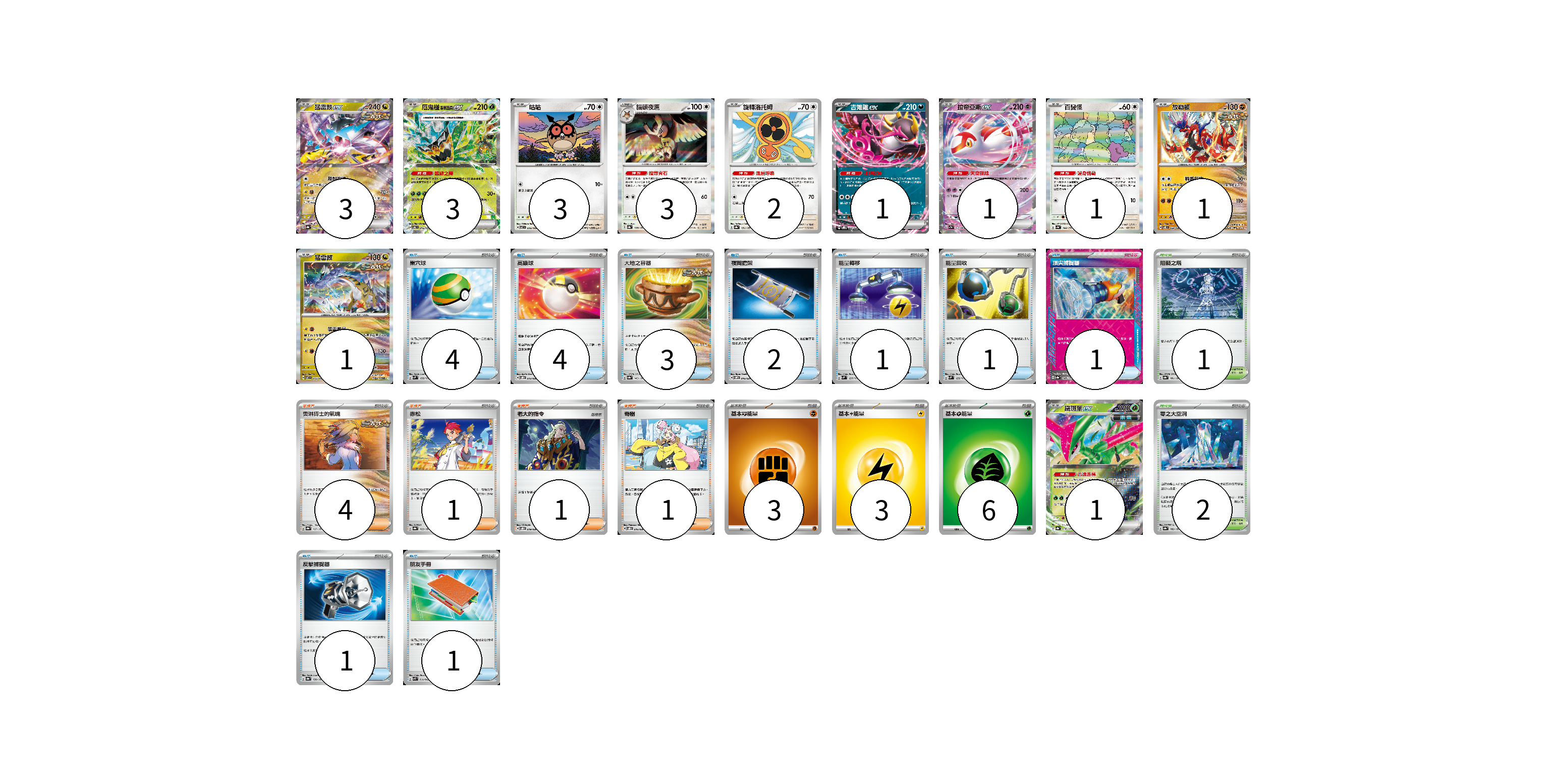 牌組構築方案 以此牌組為基礎新構築牌組 顯示卡面 顯示列表 寶可夢卡(20) 3 3 3 3 2 1 1 1 1 1 1 物品卡(18) 4 4 3 2 1 1 1 1 1 支援者卡(7) 4 1 1 1 競技場卡(3) 1 2 能量卡(12) 3 3 6 寶可夢卡(20) 卡牌名稱 張數 卡牌名稱 張數 猛雷鼓ex SV8a 124/187 03 厄鬼椪 碧草面具ex SV6 016/101 03 咕咕 SV7 076/102 03 貓頭夜鷹 SV8a 128/187 03 旋轉洛托姆 SV8a 131/187 02 吉雉雞ex SVOD 004/020 01 拉帝亞斯ex SV7a 019/064 01 百變怪 SV4a 144/190 01 故勒頓 SV8 069/106 01 猛雷鼓 SV7 075/102 01 鐵斑葉ex SV8a 016/187 01 物品卡(18) 卡牌名稱 張數 卡牌名稱 張數 巢穴球 SVM 133/175 04 高級球 SVOD 012/020 04 大地之容器 SV8a 143/187 03 夜間擔架 SVOM 016/021 02 能量轉移 SVM 127/175 01 能量回收 SVM 125/175 01 頂尖捕捉器 SV8a 148/187 01 反擊捕捉器 SV8a 139/187 01 朋友手冊 SVK 014/042 01 支援者卡(7) 卡牌名稱 張數 卡牌名稱 張數 奧琳博士的氣魄 SV8a 167/187 04 赤松 SV8a 163/187 01 老大的指令 SVOD 019/020 01 奇樹 SVOD 016/020 01 競技場卡(3) 卡牌名稱 張數 卡牌名稱 張數 阻礙之塔 SV8a 181/187 01 零之大空洞 SV8a 182/187 02 能量卡(12) 卡牌名稱 張數 卡牌名稱 張數 基本【鬥】能量 SVD FIG 03 基本【雷】能量 SVF LIG 03 基本【草】能量 SVF GRA 06 以此牌組為基礎新構築牌組 牌組編碼 KngBNV-xNrHTt-jtkLEu copy 列印牌組單 牌組編碼已複製 分享至SNS