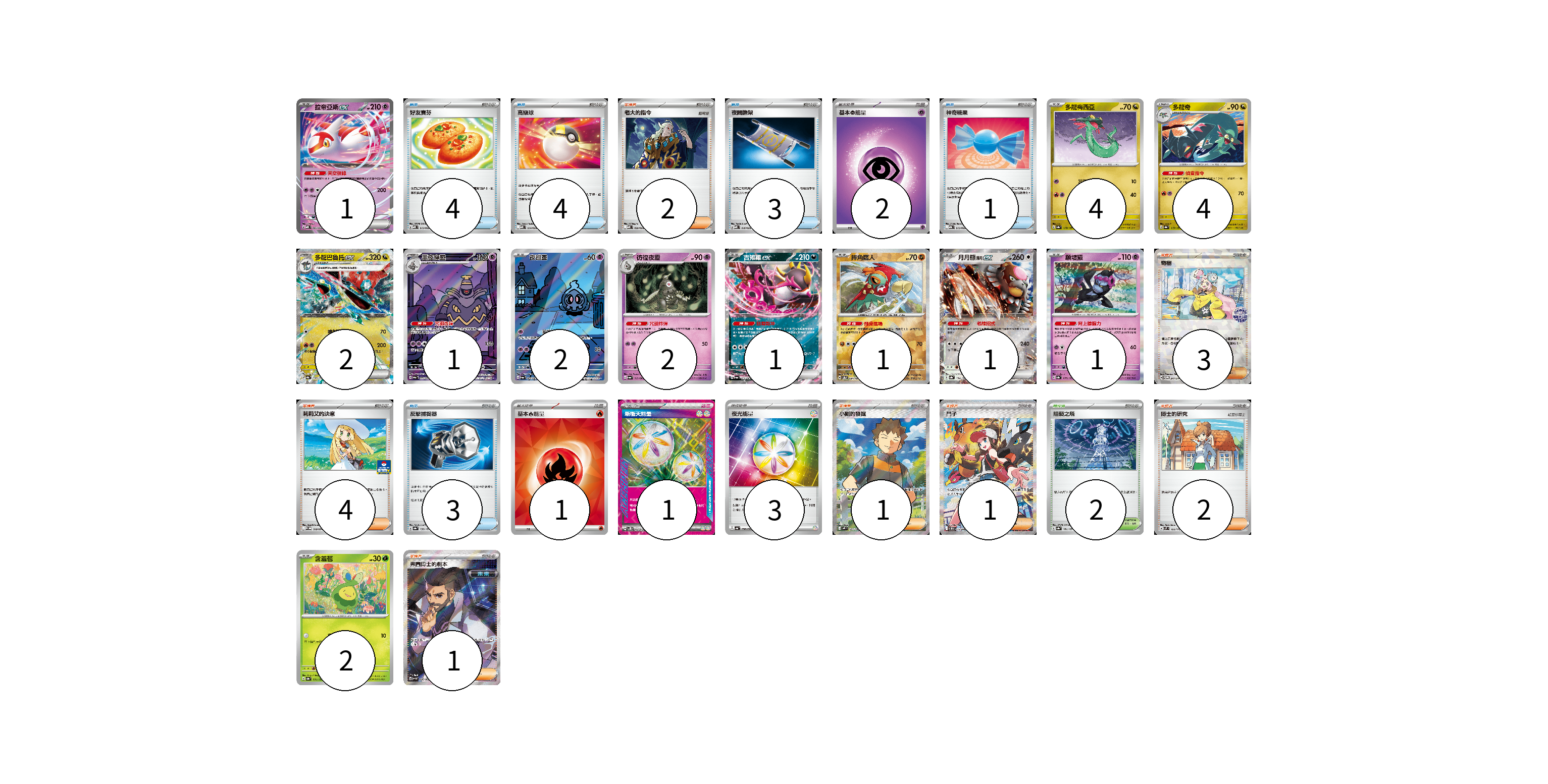 牌組構築方案 以此牌組為基礎新構築牌組 顯示卡面 顯示列表 寶可夢卡(22) 1 4 4 2 1 2 2 1 1 1 1 2 物品卡(15) 4 4 3 1 3 支援者卡(14) 2 3 4 1 1 2 1 競技場卡(2) 2 能量卡(7) 2 1 1 3 寶可夢卡(22) 卡牌名稱 張數 卡牌名稱 張數 拉帝亞斯ex MBD 003/022 01 多龍梅西亞 SV8a 118/187 04 多龍奇 SV8a 119/187 04 多龍巴魯托ex SV8a 120/187 02 黑夜魔靈 SV6a 070/064 01 夜巡靈 SV6a 068/064 02 彷徨夜靈 SV6a 019/064 02 吉雉雞ex SV6a 038/064 01 摔角鷹人 SV8a 084/187 01 月月熊 赫月ex SV8a 134/187 01 願增猿 SV8a 075/187 01 含羞苞 SV8a 001/187 02 物品卡(15) 卡牌名稱 張數 卡牌名稱 張數 好友寶芬 MBD 013/022 04 高級球 MBD 014/022 04 夜間擔架 MBD 016/022 03 神奇糖果 MBG 013/022 01 反擊捕捉器 SV8a 139/187 03 支援者卡(14) 卡牌名稱 張數 卡牌名稱 張數 老大的指令 MBD 020/022 02 奇樹 SV-P 247/SV-P 03 莉莉艾的決意 M-P 018/M-P 04 小剛的發掘 SV9 123/100 01 鬥子 SV11W 173/086 01 博士的研究 SVM 166/175 02 弗圖博士的劇本 SV4M 086/066 01 競技場卡(2) 卡牌名稱 張數 卡牌名稱 張數 阻礙之塔 SV8a 181/187 02 能量卡(7) 卡牌名稱 張數 卡牌名稱 張數 基本【超】能量 MBD PSY 02 基本【火】能量 SVQL FIR 01 新衝天能量 SV5K 071/071 01 夜光能量 SV4a 190/190 03 以此牌組為基礎新構築牌組 牌組編碼 KnrGef-yiLLRX-IXrRLN copy 列印牌組單 牌組編碼已複製 分享至SNS