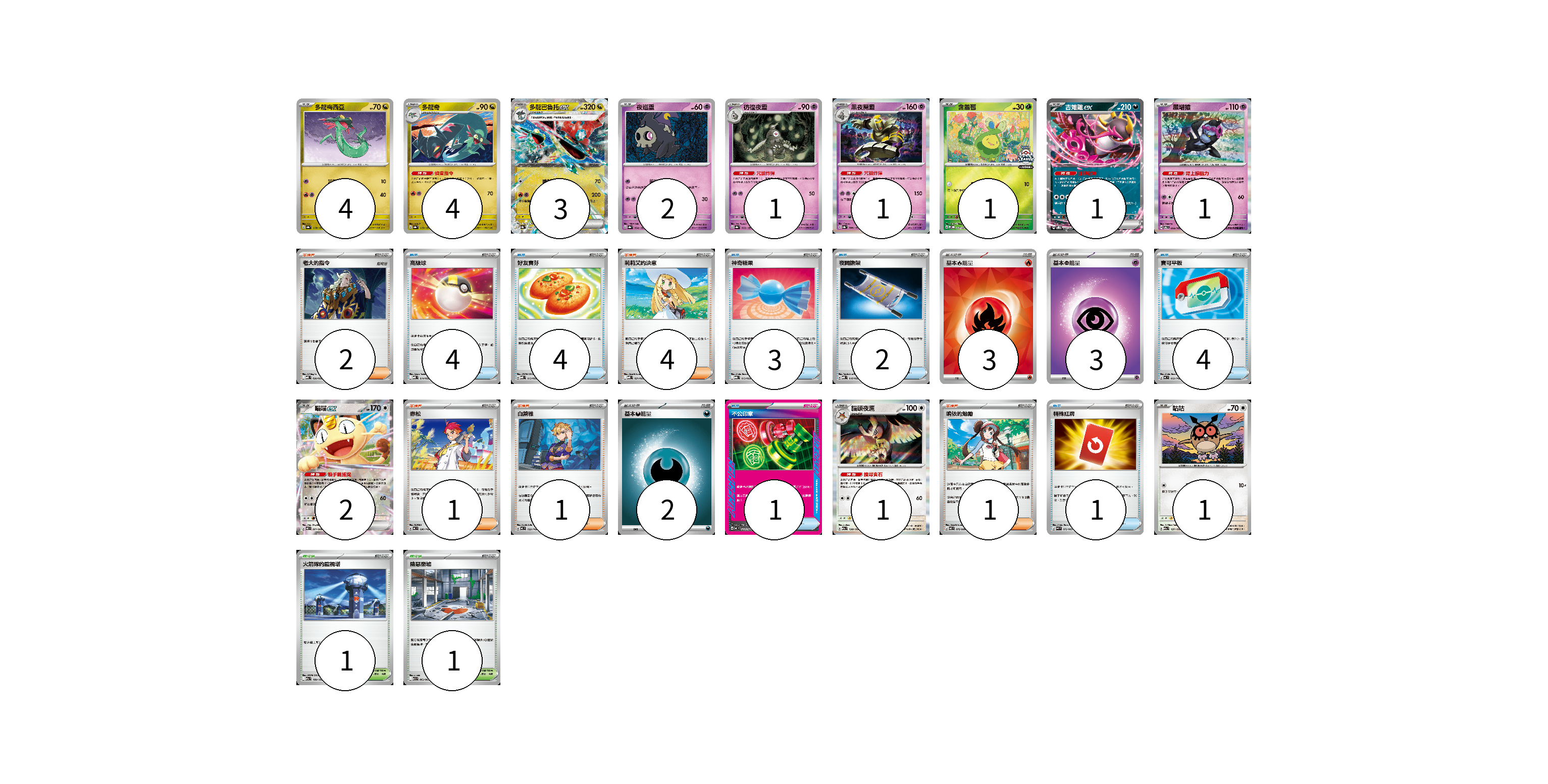 牌組構築方案 以此牌組為基礎新構築牌組 顯示卡面 顯示列表 寶可夢卡(22) 4 4 3 2 1 1 1 1 1 2 1 1 物品卡(19) 4 4 3 2 4 1 1 支援者卡(9) 2 4 1 1 1 競技場卡(2) 1 1 能量卡(8) 3 3 2 寶可夢卡(22) 卡牌名稱 張數 卡牌名稱 張數 多龍梅西亞 SV8a 118/187 04 多龍奇 SV8a 119/187 04 多龍巴魯托ex SV8a 120/187 03 夜巡靈 SV8a 064/187 02 彷徨夜靈 SV8a 065/187 01 黑夜魔靈 SV8a 066/187 01 含羞苞 M-P 037/M-P 01 吉雉雞ex SVOD 004/020 01 願增猿 SV6 055/101 01 喵喵ex M3 061/080 02 貓頭夜鷹 M2a 138/193 01 咕咕 M2a 137/193 01 物品卡(19) 卡牌名稱 張數 卡牌名稱 張數 高級球 MBD 014/022 04 好友寶芬 MBD 013/022 04 神奇糖果 MBG 013/022 03 夜間擔架 MBD 016/022 02 寶可平板 MC 662/742 04 不公印章 MC 633/742 01 特殊紅牌 M4 072/083 01 支援者卡(9) 卡牌名稱 張數 卡牌名稱 張數 老大的指令 MBD 020/022 02 莉莉艾的決意 MBD 021/022 04 赤松 MC 696/742 01 白蕾雅 MC 722/742 01 鳴依的勉勵 M3 075/080 01 競技場卡(2) 卡牌名稱 張數 卡牌名稱 張數 火箭隊的監視塔 M2a 189/193 01 險惡廢墟 M1L 063/063 01 能量卡(8) 卡牌名稱 張數 卡牌名稱 張數 基本【火】能量 SVQL FIR 03 基本【超】能量 M-P PSY 03 基本【惡】能量 MC DAR 02 以此牌組為基礎新構築牌組 牌組編碼 KoLBOX-gDDwDk-NWOjEy copy 列印牌組單 牌組編碼已複製 分享至SNS