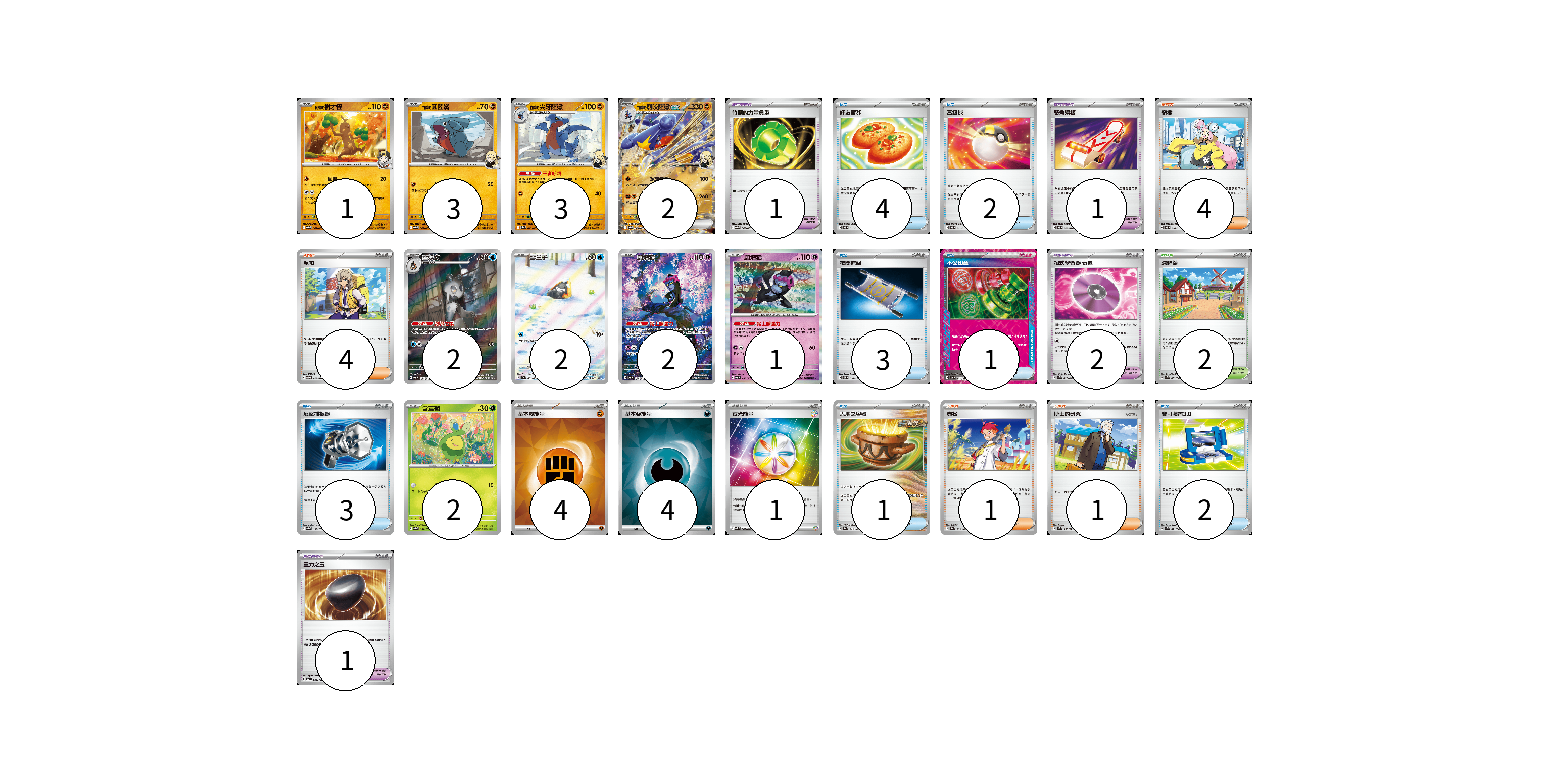 牌組構築方案 以此牌組為基礎新構築牌組 顯示卡面 顯示列表 寶可夢卡(18) 1 3 3 2 2 2 2 1 2 寶可夢道具(5) 1 1 2 1 物品卡(16) 4 2 3 1 3 1 2 支援者卡(10) 4 4 1 1 競技場卡(2) 2 能量卡(9) 4 4 1 寶可夢卡(18) 卡牌名稱 張數 卡牌名稱 張數 <阿響的>樹才怪 SV9a 041/063 01 <竹蘭的>圓陸鯊 SV9a 042/063 03 <竹蘭的>尖牙陸鯊 SV9a 043/063 03 <竹蘭的>烈咬陸鯊ex SV9a 044/063 02 雪妖女 SV6 104/101 02 雪童子 SV3a 063/062 02 願增猿 SV6 107/101 02 願增猿 SV6 055/101 01 含羞苞 SV8a 001/187 02 寶可夢道具(5) 卡牌名稱 張數 卡牌名稱 張數 竹蘭的力量負重 SV9a 060/063 01 緊急滑板 SVOD 015/020 01 招式學習器 衰退 SVK 026/042 02 重力之玉 SV7 095/102 01 物品卡(16) 卡牌名稱 張數 卡牌名稱 張數 好友寶芬 SVOD 011/020 04 高級球 SVOD 012/020 02 夜間擔架 SVOM 016/021 03 不公印章 SV5a 053/066 01 反擊捕捉器 SV8a 139/187 03 大地之容器 SV8a 143/187 01 寶可裝置3.0 SVK 021/042 02 支援者卡(10) 卡牌名稱 張數 卡牌名稱 張數 奇樹 SVOD 016/020 04 派帕 SVOD 018/020 04 赤松 SV8a 163/187 01 博士的研究 SVM 165/175 01 競技場卡(2) 卡牌名稱 張數 卡牌名稱 張數 深缽鎮 SVK 039/042 02 能量卡(9) 卡牌名稱 張數 卡牌名稱 張數 基本【鬥】能量 SVK FIG 04 基本【惡】能量 SVK DAR 04 夜光能量 SVK 042/042 01 以此牌組為基礎新構築牌組 牌組編碼 KqdzBZ-ZrmOza-CxYWnO copy 列印牌組單 牌組編碼已複製 分享至SNS