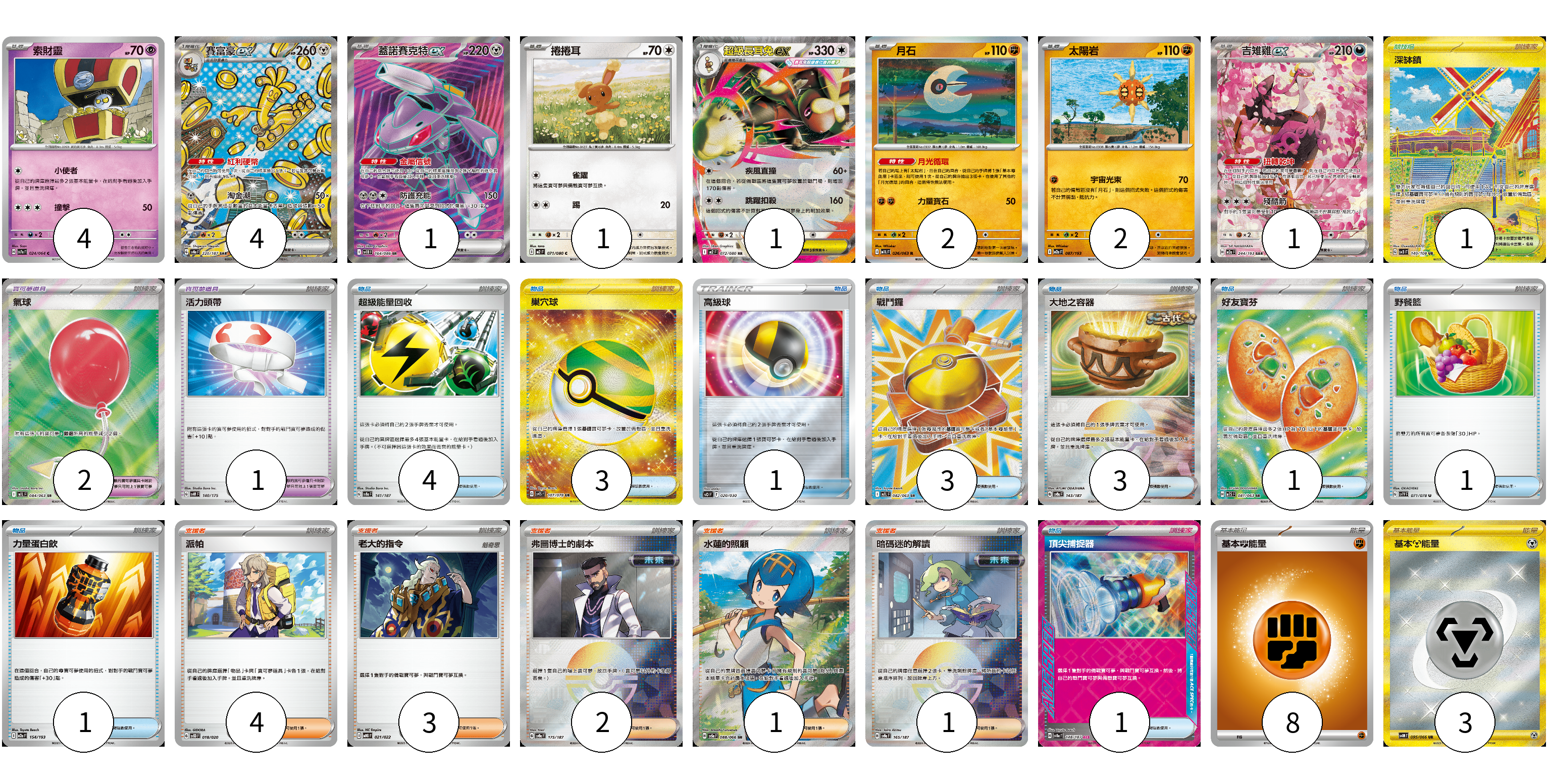 牌組構築方案 以此牌組為基礎新構築牌組 顯示卡面 顯示列表 寶可夢卡(16) 4 4 1 1 1 2 2 1 寶可夢道具(3) 2 1 物品卡(18) 4 3 1 3 3 1 1 1 1 支援者卡(11) 4 3 2 1 1 競技場卡(1) 1 能量卡(11) 8 3 寶可夢卡(16) 卡牌名稱 張數 卡牌名稱 張數 索財靈 SV7a 024/064 04 賽富豪ex SV8a 220/187 04 蓋諾賽克特ex SV11B 164/086 01 捲捲耳 M2 071/080 01 超級長耳兔ex M2 072/080 01 月石 M1L 026/063 02 太陽岩 M2a 087/193 02 吉雉雞ex M2a 244/193 01 寶可夢道具(3) 卡牌名稱 張數 卡牌名稱 張數 氣球 M1L 084/063 02 活力頭帶 SVM 140/175 01 物品卡(18) 卡牌名稱 張數 卡牌名稱 張數 超級能量回收 SV8a 141/187 04 巢穴球 SV1S 107/078 03 高級球 SO 020/030 01 戰鬥鑼 M1L 082/063 03 大地之容器 SV8a 143/187 03 好友寶芬 M1S 081/063 01 野餐籃 SV1V 071/078 01 力量蛋白飲 M2a 154/193 01 頂尖捕捉器 SV8a 148/187 01 支援者卡(11) 卡牌名稱 張數 卡牌名稱 張數 派帕 SVOD 018/020 04 老大的指令 MBG 021/022 03 弗圖博士的劇本 SV8a 175/187 02 水蓮的照顧 SV5a 088/066 01 暗碼迷的解讀 SV8a 165/187 01 競技場卡(1) 卡牌名稱 張數 卡牌名稱 張數 深缽鎮 SV3 140/108 01 能量卡(11) 卡牌名稱 張數 卡牌名稱 張數 基本【鬥】能量 M-P FIG 08 基礎【鋼】能量 SV4M 095/066 03 以此牌組為基礎新構築牌組 牌組編碼 KrNdxo-rpABVc-rXKlYl copy 列印牌組單 牌組編碼已複製 分享至SNS