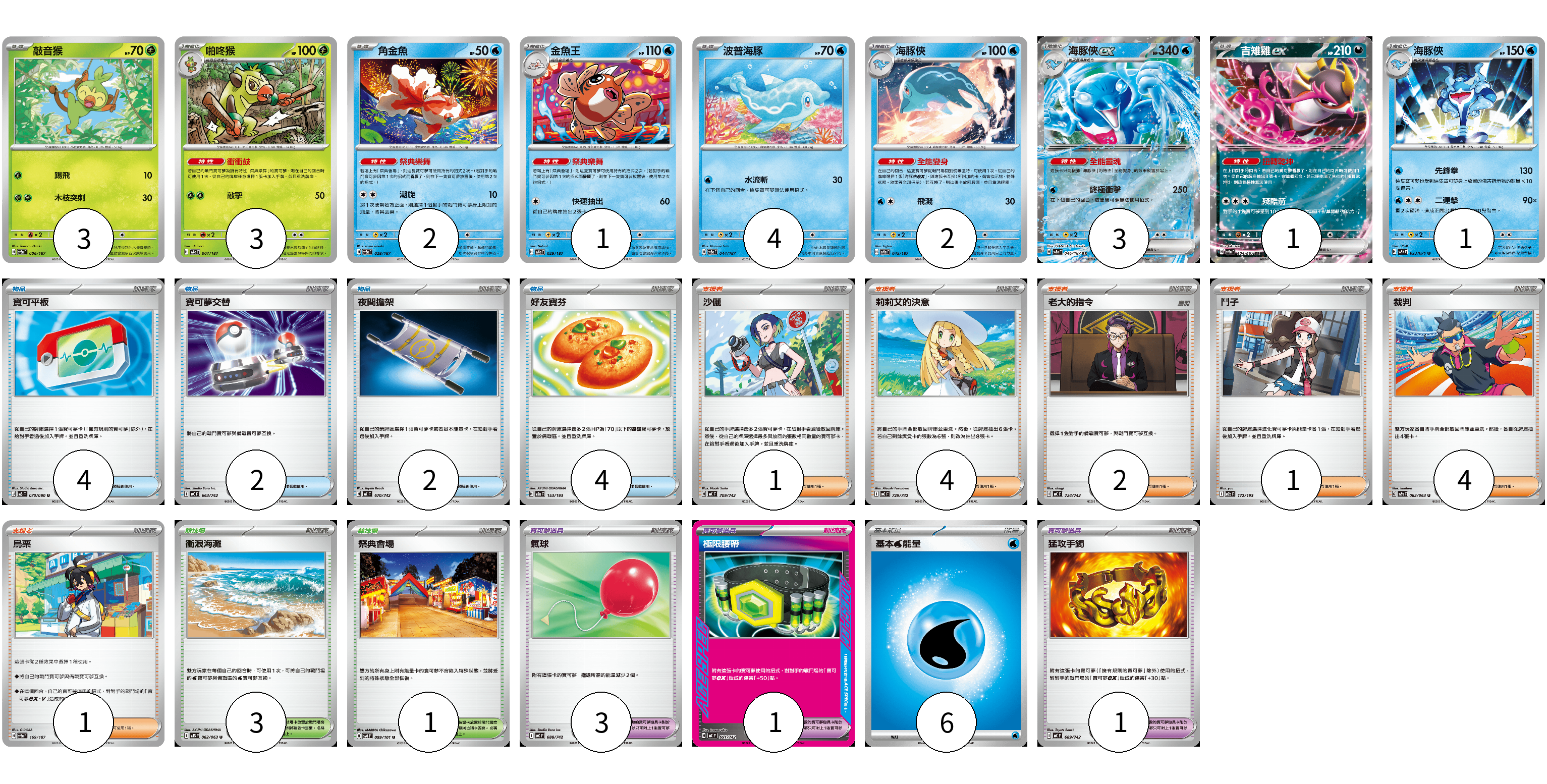 牌組構築方案 以此牌組為基礎新構築牌組 顯示卡面 顯示列表 寶可夢卡(20) 3 3 2 1 4 2 3 1 1 寶可夢道具(5) 3 1 1 物品卡(12) 4 2 2 4 支援者卡(13) 1 4 2 1 4 1 競技場卡(4) 3 1 能量卡(6) 6 寶可夢卡(20) 卡牌名稱 張數 卡牌名稱 張數 敲音猴 SV8a 006/187 03 啪咚猴 SV8a 007/187 03 角金魚 SV8a 028/187 02 金魚王 SV8a 029/187 01 波普海豚 SV8a 044/187 04 海豚俠 SV8a 045/187 02 海豚俠ex SV8a 046/187 03 吉雉雞ex SV8a 104/187 01 海豚俠 SV5K 023/071 01 寶可夢道具(5) 卡牌名稱 張數 卡牌名稱 張數 氣球 MC 688/742 03 極限腰帶 MC 691/742 01 猛攻手鐲 MC 689/742 01 物品卡(12) 卡牌名稱 張數 卡牌名稱 張數 寶可平板 M3 070/080 04 寶可夢交替 MC 663/742 02 夜間擔架 MC 670/742 02 好友寶芬 M2a 153/193 04 支援者卡(13) 卡牌名稱 張數 卡牌名稱 張數 沙儷 MC 709/742 01 莉莉艾的決意 MC 729/742 04 老大的指令 MC 724/742 02 鬥子 M2a 172/193 01 裁判 SV9a 062/063 04 烏栗 SV8a 169/187 01 競技場卡(4) 卡牌名稱 張數 卡牌名稱 張數 衝浪海灘 M1S 062/063 03 祭典會場 SV6 099/101 01 能量卡(6) 卡牌名稱 張數 卡牌名稱 張數 基本【水】能量 MC WAT 06 以此牌組為基礎新構築牌組 牌組編碼 KrWiVv-zmkYmp-XpqMIY copy 列印牌組單 牌組編碼已複製 分享至SNS