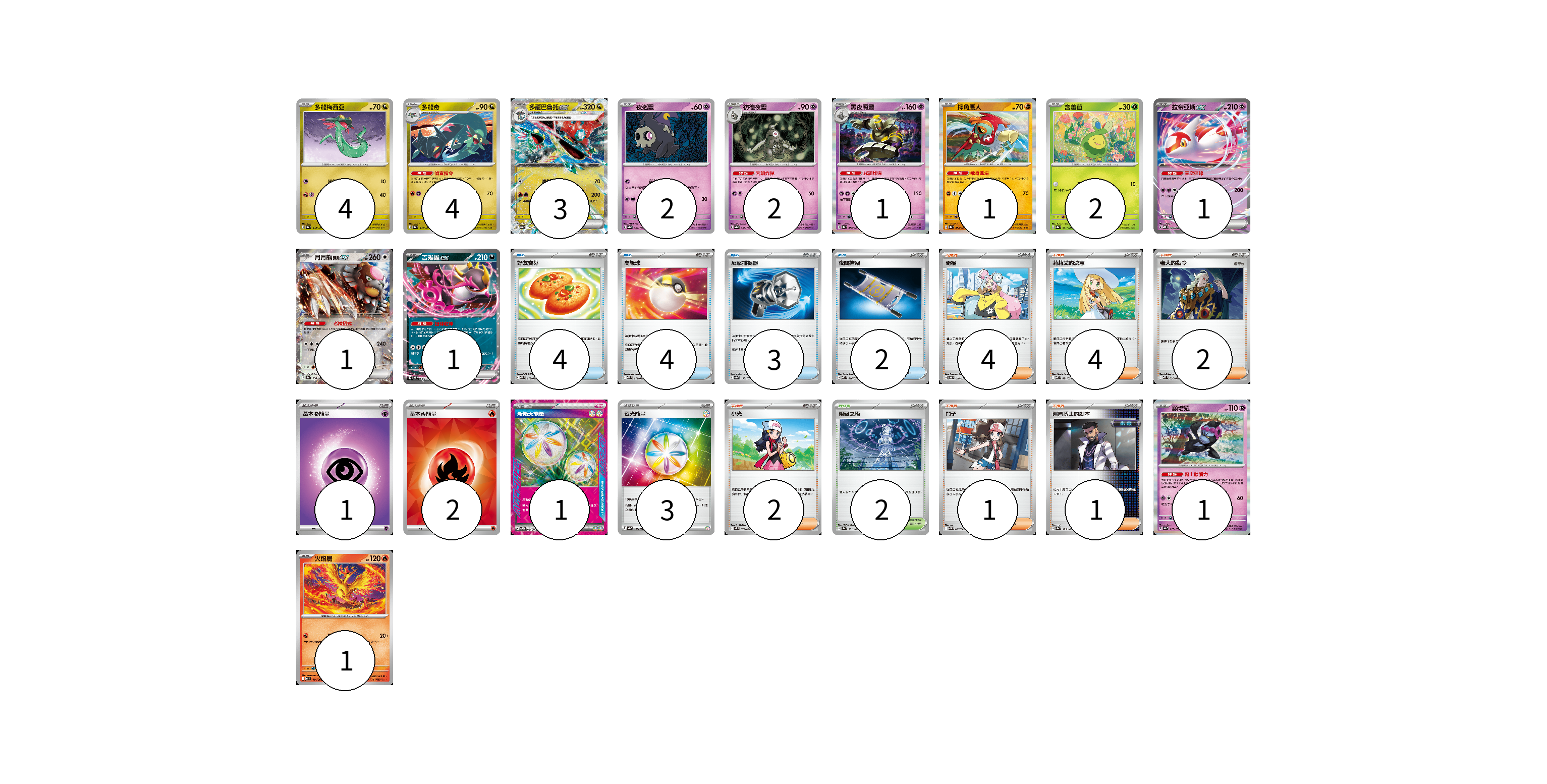 牌組構築方案 以此牌組為基礎新構築牌組 顯示卡面 顯示列表 寶可夢卡(24) 4 4 3 2 2 1 1 2 1 1 1 1 1 物品卡(13) 4 4 3 2 支援者卡(14) 4 4 2 2 1 1 競技場卡(2) 2 能量卡(7) 1 2 1 3 寶可夢卡(24) 卡牌名稱 張數 卡牌名稱 張數 多龍梅西亞 SV8a 118/187 04 多龍奇 SV8a 119/187 04 多龍巴魯托ex SV8a 120/187 03 夜巡靈 SV8a 064/187 02 彷徨夜靈 SV8a 065/187 02 黑夜魔靈 SV8a 066/187 01 摔角鷹人 SV8a 084/187 01 含羞苞 SV8a 001/187 02 拉帝亞斯ex MBD 003/022 01 月月熊 赫月ex SV8a 134/187 01 吉雉雞ex SVOD 004/020 01 願增猿 SV8a 075/187 01 火焰鳥 M2 014/080 01 物品卡(13) 卡牌名稱 張數 卡牌名稱 張數 好友寶芬 MBD 013/022 04 高級球 MBD 014/022 04 反擊捕捉器 SV8a 139/187 03 夜間擔架 MBD 016/022 02 支援者卡(14) 卡牌名稱 張數 卡牌名稱 張數 奇樹 SVOD 016/020 04 莉莉艾的決意 MBD 021/022 04 老大的指令 MBD 020/022 02 小光 M2 077/080 02 鬥子 SV11W 085/086 01 弗圖博士的劇本 SV8a 175/187 01 競技場卡(2) 卡牌名稱 張數 卡牌名稱 張數 阻礙之塔 SV8a 181/187 02 能量卡(7) 卡牌名稱 張數 卡牌名稱 張數 基本【超】能量 MBD PSY 01 基本【火】能量 SVQL FIR 02 新衝天能量 SV5K 071/071 01 夜光能量 SV4a 190/190 03 以此牌組為基礎新構築牌組 牌組編碼 KubtrX-BbdZTt-CqmsLk copy 列印牌組單 牌組編碼已複製 分享至SNS