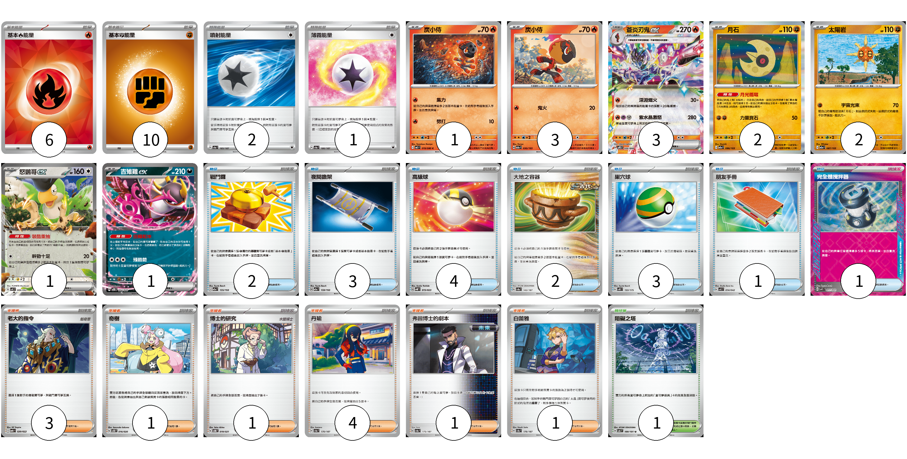 牌組構築方案 以此牌組為基礎新構築牌組 顯示卡面 顯示列表 寶可夢卡(13) 1 3 3 2 2 1 1 物品卡(16) 2 3 4 2 3 1 1 支援者卡(11) 3 1 1 4 1 1 競技場卡(1) 1 能量卡(19) 6 10 2 1 寶可夢卡(13) 卡牌名稱 張數 卡牌名稱 張數 炭小侍 M2 019/080 01 炭小侍 M2a 030/193 03 蒼炎刃鬼ex SVPS 006/008 03 月石 M2a 086/193 02 太陽岩 M2a 087/193 02 怒鸚哥ex SVK 006/042 01 吉雉雞ex SVOD 004/020 01 物品卡(16) 卡牌名稱 張數 卡牌名稱 張數 戰鬥鑼 M2a 155/193 02 夜間擔架 M2a 159/193 03 高級球 SVQP 015/023 04 大地之容器 SV8a 143/187 02 巢穴球 SVM 133/175 03 朋友手冊 SVK 014/042 01 完全體攪拌器 SVK 017/042 01 支援者卡(11) 卡牌名稱 張數 卡牌名稱 張數 老大的指令 MBD 020/022 03 奇樹 SVOD 016/020 01 博士的研究 SVOM 019/021 01 丹瑜 SV8a 170/187 04 弗圖博士的劇本 SV8a 175/187 01 白蕾雅 SV8a 176/187 01 競技場卡(1) 卡牌名稱 張數 卡牌名稱 張數 阻礙之塔 SV6 100/101 01 能量卡(19) 卡牌名稱 張數 卡牌名稱 張數 基本【火】能量 SVQL FIR 06 基本【鬥】能量 M-P FIG 10 噴射能量 SV8a 185/187 02 薄霧能量 SV8a 186/187 01 以此牌組為基礎新構築牌組 牌組編碼 KvEqWo-aISvtJ-gdxsgM copy 列印牌組單 牌組編碼已複製 分享至SNS