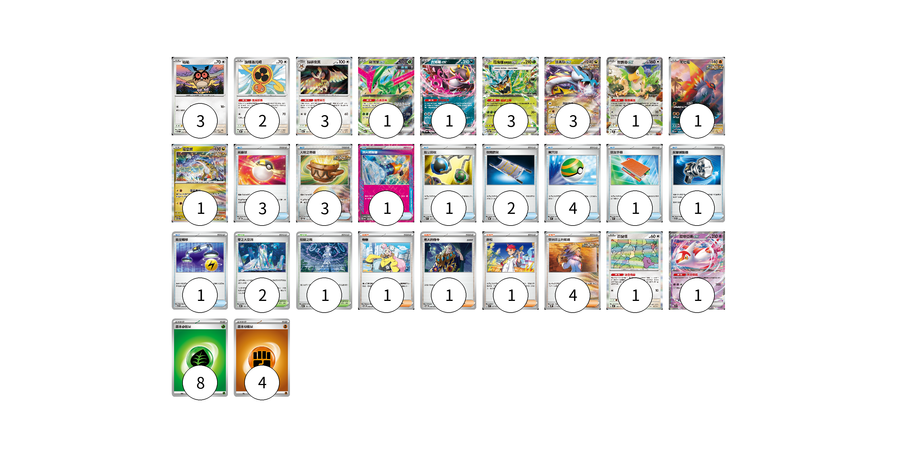 牌組構築方案 以此牌組為基礎新構築牌組 顯示卡面 顯示列表 寶可夢卡(21) 3 2 3 1 1 3 3 1 1 1 1 1 物品卡(17) 3 3 1 1 2 4 1 1 1 支援者卡(7) 1 1 1 4 競技場卡(3) 2 1 能量卡(12) 8 4 寶可夢卡(21) 卡牌名稱 張數 卡牌名稱 張數 咕咕 SV7 076/102 03 旋轉洛托姆 SV8a 131/187 02 貓頭夜鷹 SV8a 128/187 03 鐵斑葉ex SV8a 016/187 01 吉雉雞ex SV8a 104/187 01 厄鬼椪 碧草面具ex SV6 016/101 03 猛雷鼓ex SV5K 053/071 03 怒鸚哥ex SV2P 065/071 01 爬地翅 SV4K 074/066 01 猛雷鼓 SV7 075/102 01 百變怪 SV4a 144/190 01 拉帝亞斯ex SV7a 019/064 01 物品卡(17) 卡牌名稱 張數 卡牌名稱 張數 高級球 SVOD 012/020 03 大地之容器 SV8a 143/187 03 頂尖捕捉器 SV8a 148/187 01 能量回收 SVM 125/175 01 夜間擔架 SV8a 151/187 02 巢穴球 SVM 133/175 04 朋友手冊 SVK 014/042 01 反擊捕捉器 SVTS 009/022 01 能量轉移 SVTR 010/021 01 支援者卡(7) 卡牌名稱 張數 卡牌名稱 張數 奇樹 SVOM 018/021 01 老大的指令 SVOD 019/020 01 赤松 SVK 027/042 01 奧琳博士的氣魄 SVHK 017/022 04 競技場卡(3) 卡牌名稱 張數 卡牌名稱 張數 零之大空洞 SV8a 182/187 02 阻礙之塔 SV8a 181/187 01 能量卡(12) 卡牌名稱 張數 卡牌名稱 張數 基本【草】能量 SVD GRA 08 基本【鬥】能量 SVD FIG 04 以此牌組為基礎新構築牌組 牌組編碼 KwyBwB-StuWOR-MnAhTV copy 列印牌組單 牌組編碼已複製 分享至SNS