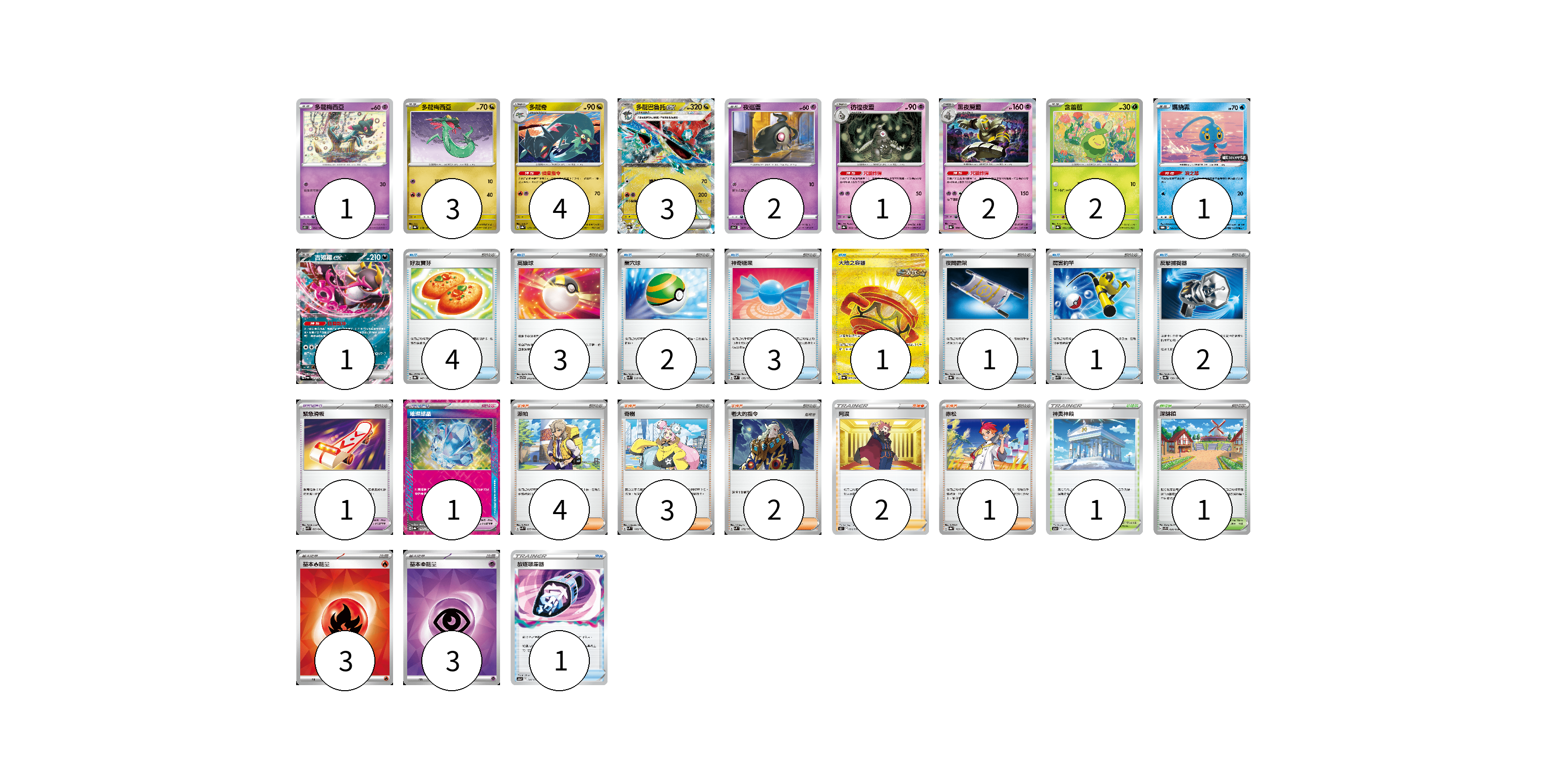 牌組構築方案 以此牌組為基礎新構築牌組 顯示卡面 顯示列表 寶可夢卡(20) 1 3 4 3 2 1 2 2 1 1 寶可夢道具(2) 1 1 物品卡(18) 4 3 2 3 1 1 1 2 1 支援者卡(12) 4 3 2 2 1 競技場卡(2) 1 1 能量卡(6) 3 3 寶可夢卡(20) 卡牌名稱 張數 卡牌名稱 張數 多龍梅西亞 S11 052/100 01 多龍梅西亞 SV8a 118/187 03 多龍奇 SV8a 119/187 04 多龍巴魯托ex SV8a 120/187 03 夜巡靈 S12a 057/172 02 彷徨夜靈 SV8a 065/187 01 黑夜魔靈 SV8a 066/187 02 含羞苞 SV8a 001/187 02 瑪納霏 SV-P 135/SV-P 01 吉雉雞ex SV6a 038/064 01 寶可夢道具(2) 卡牌名稱 張數 卡牌名稱 張數 緊急滑板 SVK 023/042 01 璀璨結晶 SV8a 152/187 01 物品卡(18) 卡牌名稱 張數 卡牌名稱 張數 好友寶芬 SV8a 147/187 04 高級球 SVTG 013/019 03 巢穴球 SVK 016/042 02 神奇糖果 SVM 135/175 03 大地之容器 SV6a 093/064 01 夜間擔架 SV8a 151/187 01 厲害釣竿 SVK 011/042 01 反擊捕捉器 SV8a 139/187 02 放逐吸塵器 S12a 144/172 01 支援者卡(12) 卡牌名稱 張數 卡牌名稱 張數 派帕 SVK 035/042 04 奇樹 SVM 160/175 03 老大的指令 SVM 172/175 02 阿渡 S12 096/098 02 赤松 SV8a 163/187 01 競技場卡(2) 卡牌名稱 張數 卡牌名稱 張數 神奧神殿 S12a 169/172 01 深缽鎮 SVF 036/038 01 能量卡(6) 卡牌名稱 張數 卡牌名稱 張數 基本【火】能量 SVK FIR 03 基本【超】能量 SVK PSY 03 以此牌組為基礎新構築牌組 牌組編碼 KzVulV-szBSyo-pEhKyA copy 列印牌組單 牌組編碼已複製 分享至SNS