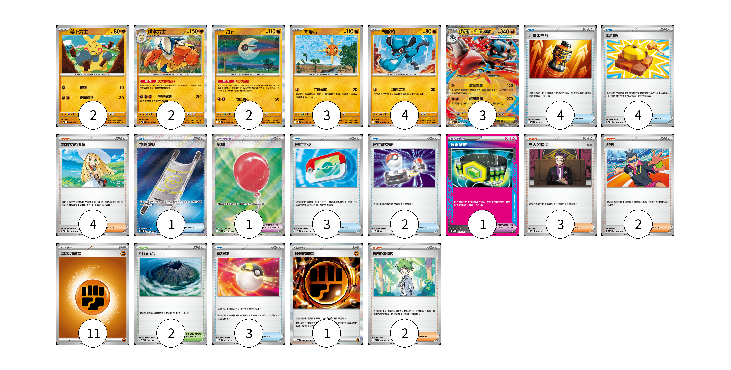 牌組構築方案 以此牌組為基礎新構築牌組 顯示卡面 顯示列表 寶可夢卡(16) 2 2 2 3 4 3 寶可夢道具(2) 1 1 物品卡(17) 4 4 1 3 2 3 支援者卡(11) 4 3 2 2 競技場卡(2) 2 能量卡(12) 11 1 寶可夢卡(16) 卡牌名稱 張數 卡牌名稱 張數 幕下力士 M1L 024/063 02 鐵掌力士 M1L 025/063 02 月石 M1L 026/063 02 太陽岩 M1L 027/063 03 利歐路 M1L 028/063 04 超級路卡利歐ex M1L 029/063 03 寶可夢道具(2) 卡牌名稱 張數 卡牌名稱 張數 氣球 M1L 084/063 01 極限腰帶 MC 691/742 01 物品卡(17) 卡牌名稱 張數 卡牌名稱 張數 力量蛋白飲 M1L 058/063 04 戰鬥鑼 M1L 059/063 04 夜間擔架 M1L 083/063 01 寶可平板 M3 070/080 03 寶可夢交替 MC 663/742 02 高級球 MBD 014/022 03 支援者卡(11) 卡牌名稱 張數 卡牌名稱 張數 莉莉艾的決意 M1L 062/063 04 老大的指令 MC 724/742 03 裁判 SV9a 062/063 02 滿充的體貼 M1S 060/063 02 競技場卡(2) 卡牌名稱 張數 卡牌名稱 張數 引力山岳 M2a 183/193 02 能量卡(12) 卡牌名稱 張數 卡牌名稱 張數 基本【鬥】能量 MC FIG 11 硬岩【鬥】能量 M3 080/080 01 以此牌組為基礎新構築牌組 牌組編碼 LAiUmK-BvGYzY-qRsDbV copy 列印牌組單 牌組編碼已複製 分享至SNS