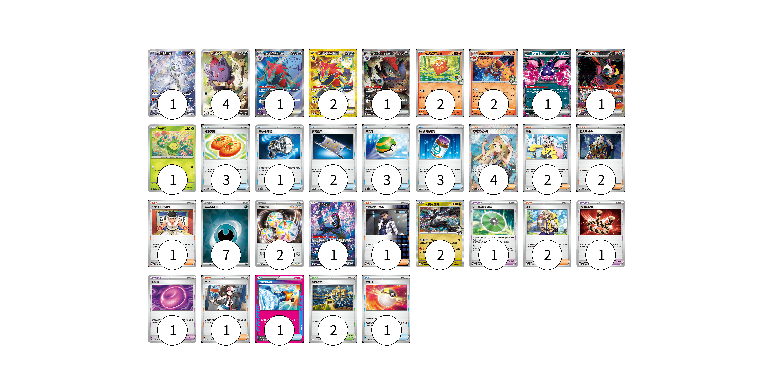 牌組構築方案 以此牌組為基礎新構築牌組 顯示卡面 顯示列表 寶可夢卡(19) 1 4 1 2 1 2 2 1 1 1 1 2 寶可夢道具(3) 1 1 1 物品卡(14) 3 1 2 3 3 1 1 支援者卡(13) 4 2 2 1 1 2 1 競技場卡(2) 2 能量卡(9) 7 2 寶可夢卡(19) 卡牌名稱 張數 卡牌名稱 張數 N的萊希拉姆 SV9 109/100 01 N的索羅亞 SV9 108/100 04 N的索羅亞克ex SV9 117/100 01 N的索羅亞克ex SV9 131/100 02 N的索羅亞克ex SV9 127/100 01 N的火紅不倒翁 SV9 015/100 02 N的達摩狒狒 SV9 016/100 02 桃歹郎ex MBG 009/022 01 吉雉雞ex SV6a 089/064 01 含羞苞 SV8a 001/187 01 願增猿 SV6 107/101 01 N的捷克羅姆 M2a 129/193 02 寶可夢道具(3) 卡牌名稱 張數 卡牌名稱 張數 招式學習器 演進 SV8a 160/187 01 不服輸頭帶 SV4a 168/190 01 鎖鏈糬 SV8a 154/187 01 物品卡(14) 卡牌名稱 張數 卡牌名稱 張數 好友寶芬 MBD 013/022 03 反擊捕捉器 SV8a 139/187 01 夜間擔架 SV8a 151/187 02 巢穴球 SVM 133/175 03 N的PP提升劑 SV9 089/100 03 頂尖捕捉器 MBG 014/022 01 高級球 MBD 014/022 01 支援者卡(13) 卡牌名稱 張數 卡牌名稱 張數 莉莉艾的決意 M1L 086/063 04 奇樹 SVOM 018/021 02 老大的指令 MBG 021/022 02 空手道王的演練 SVM 143/175 01 弗圖博士的劇本 SV8a 175/187 01 派帕 SVK 035/042 02 鬥子 M2a 172/193 01 競技場卡(2) 卡牌名稱 張數 卡牌名稱 張數 N的城堡 M2a 181/193 02 能量卡(9) 卡牌名稱 張數 卡牌名稱 張數 基本【惡】能量 SVOM DAR 07 反轉能量 SVD 139/139 02 以此牌組為基礎新構築牌組 牌組編碼 LCZUky-LlvYxY-oQJldi copy 列印牌組單 牌組編碼已複製 分享至SNS