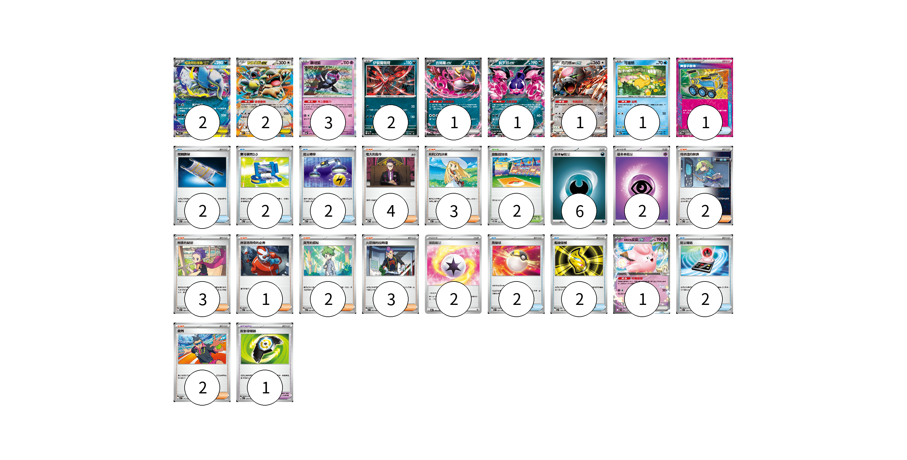 牌組構築方案 以此牌組為基礎新構築牌組 顯示卡面 顯示列表 寶可夢卡(14) 2 2 3 2 1 1 1 1 1 寶可夢道具(1) 1 物品卡(13) 1 2 2 2 2 2 2 支援者卡(20) 4 3 2 3 1 2 3 2 競技場卡(2) 2 能量卡(10) 6 2 2 寶可夢卡(14) 卡牌名稱 張數 卡牌名稱 張數 超級阿勃梭魯ex M1L 038/063 02 超級袋獸ex M1S 051/063 02 願增猿 SV8a 075/187 03 伊裴爾塔爾 MC 481/742 02 吉雉雞ex MC 489/742 01 桃歹郎ex SV8a 105/187 01 月月熊 赫月 ex MC 625/742 01 可達鴨 M2a 032/193 01 莉莉艾的皮皮ex MC 287/742 01 寶可夢道具(1) 卡牌名稱 張數 卡牌名稱 張數 反擊增幅器 MC 679/742 01 物品卡(13) 卡牌名稱 張數 卡牌名稱 張數 貴重手推車 SVK 020/042 01 夜間擔架 MC 670/742 02 寶可裝置3.0 MC 660/742 02 能量轉移 MC 638/742 02 高級球 MC 651/742 02 超級信號 M2a 158/193 02 能量輸送 MC 639/742 02 支援者卡(20) 卡牌名稱 張數 卡牌名稱 張數 老大的指令 MC 724/742 04 莉莉艾的決意 MC 729/742 03 暗碼迷的解讀 MC 698/742 02 阿杏的秘招 MC 699/742 03 庫瑟洛斯奇的企圖 MC 705/742 01 滿充的體貼 M1S 060/063 02 火箭隊的拉姆達 SV10 094/098 03 裁判 MC 711/742 02 競技場卡(2) 卡牌名稱 張數 卡牌名稱 張數 激動競技場 SV8 105/106 02 能量卡(10) 卡牌名稱 張數 卡牌名稱 張數 基本惡能量 sv-p DAR 06 基本【超】能量 MC PSY 02 薄霧能量 SV8a 186/187 02 以此牌組為基礎新構築牌組 牌組編碼 LENRVF-cCIHsj-SuFkPk copy 列印牌組單 牌組編碼已複製 分享至SNS