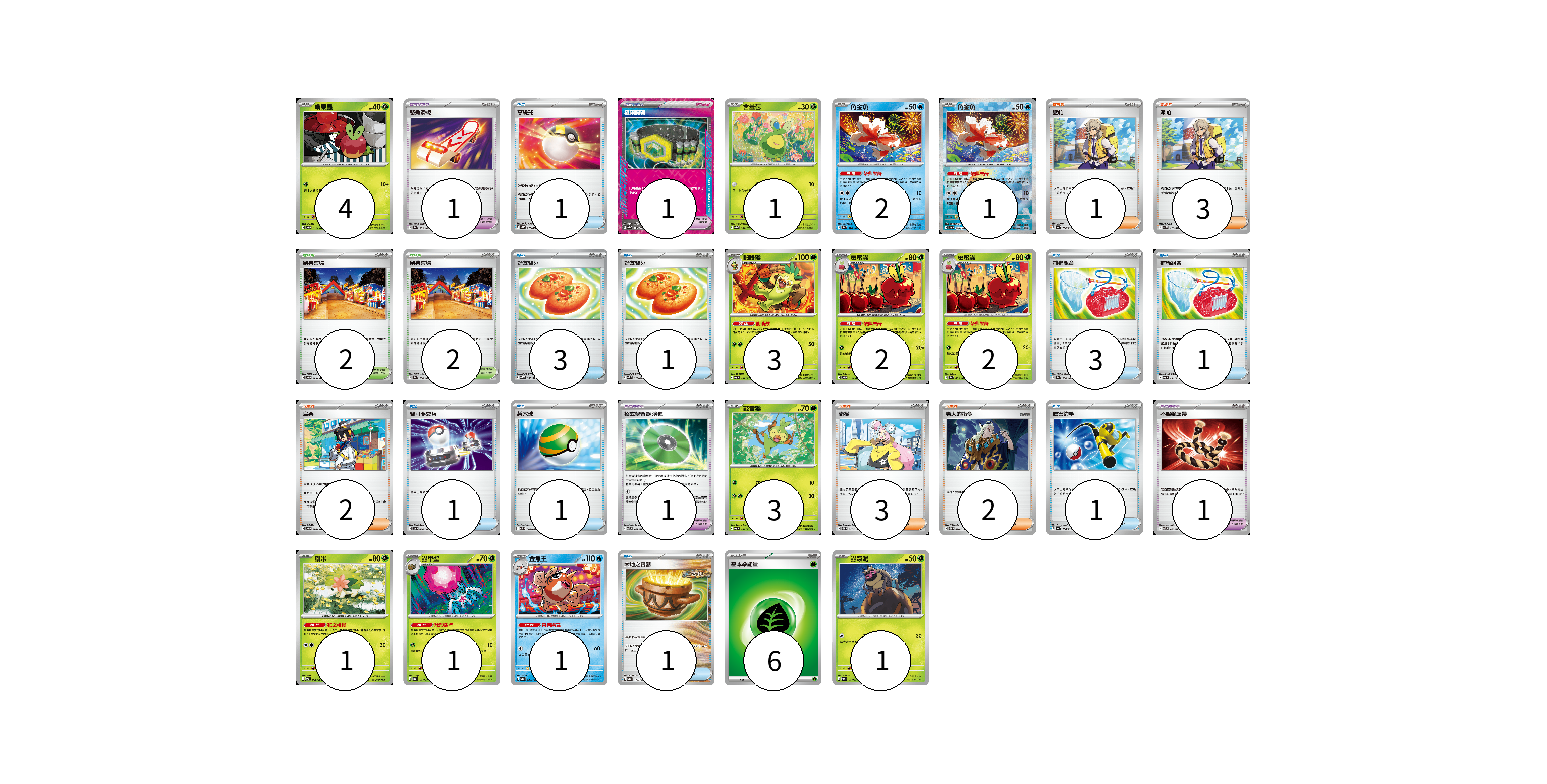 牌組構築方案 以此牌組為基礎新構築牌組 顯示卡面 顯示列表 寶可夢卡(22) 4 1 2 1 3 2 2 3 1 1 1 1 寶可夢道具(4) 1 1 1 1 物品卡(13) 1 3 1 3 1 1 1 1 1 支援者卡(11) 1 3 2 3 2 競技場卡(4) 2 2 能量卡(6) 6 寶可夢卡(22) 卡牌名稱 張數 卡牌名稱 張數 啃果蟲 SV6 011/101 04 含羞苞 SV8a 001/187 01 角金魚 SV8a 028/187 02 角金魚 SV8a 028/187 01 啪咚猴 SV6 009/101 03 裹蜜蟲 SV6 012/101 02 裹蜜蟲 SV8a 009/187 02 敲音猴 SV6 008/101 03 謝米 SV9a 006/063 01 蟲甲聖 SV8a 014/187 01 金魚王 SV8a 029/187 01 蟲滾泥 SV5M 014/071 01 寶可夢道具(4) 卡牌名稱 張數 卡牌名稱 張數 緊急滑板 SV8a 153/187 01 極限腰帶 SV8a 159/187 01 招式學習器 演進 SVTL 017/021 01 不服輸頭帶 SVTL 016/021 01 物品卡(13) 卡牌名稱 張數 卡牌名稱 張數 高級球 SVHK 013/022 01 好友寶芬 SV5K 063/071 03 好友寶芬 SVK 015/042 01 捕蟲組合 SV8a 150/187 03 捕蟲組合 SV6 094/101 01 寶可夢交替 SV5a 056/066 01 巢穴球 SVB 001/028 01 厲害釣竿 SV4a 158/190 01 大地之容器 SV8a 143/187 01 支援者卡(11) 卡牌名稱 張數 卡牌名稱 張數 派帕 SV4a 180/190 01 派帕 SV1V 076/078 03 烏栗 SV6 096/101 02 奇樹 SVTM 017/022 03 老大的指令 SVTM 020/022 02 競技場卡(4) 卡牌名稱 張數 卡牌名稱 張數 祭典會場 SV6 099/101 02 祭典會場 SV8a 180/187 02 能量卡(6) 卡牌名稱 張數 卡牌名稱 張數 基本【草】能量 SVF GRA 06 以此牌組為基礎新構築牌組 牌組編碼 LIkRDn-RdArud-kmzYJu copy 列印牌組單 牌組編碼已複製 分享至SNS
