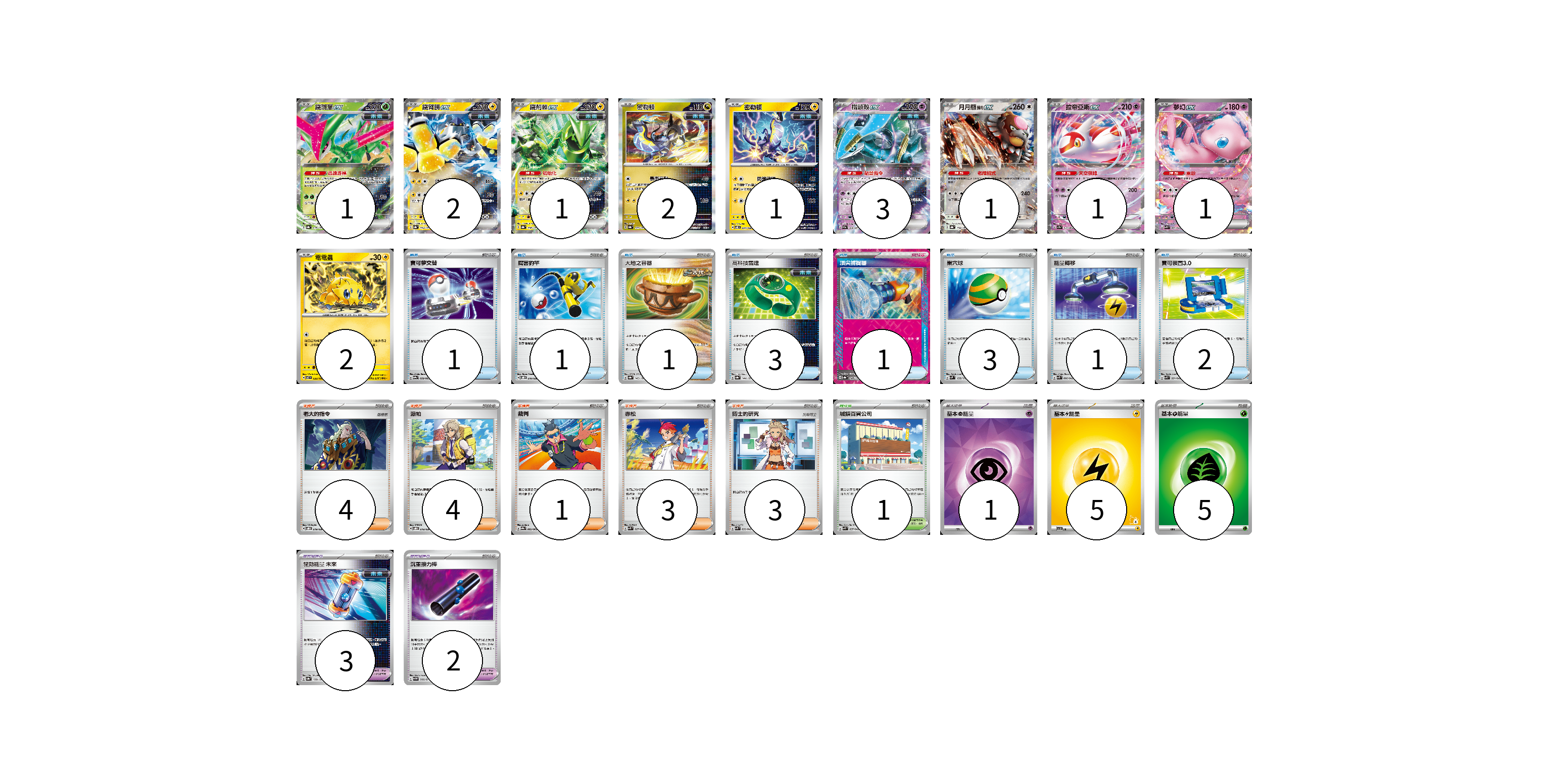 牌組構築方案 以此牌組為基礎新構築牌組 顯示卡面 顯示列表 寶可夢卡(15) 1 2 1 2 1 3 1 1 1 2 寶可夢道具(5) 3 2 物品卡(13) 1 1 1 3 1 3 1 2 支援者卡(15) 4 4 1 3 3 競技場卡(1) 1 能量卡(11) 1 5 5 寶可夢卡(15) 卡牌名稱 張數 卡牌名稱 張數 鐵斑葉ex SV8a 016/187 01 鐵臂膀ex SV8a 054/187 02 鐵荊棘ex SV8a 056/187 01 密勒頓 SV8a 123/187 02 密勒頓 SV8 044/106 01 鐵頭殼ex SV5M 036/071 03 月月熊 赫月ex SV8a 134/187 01 拉帝亞斯ex SV7a 019/064 01 夢幻ex SVK 001/042 01 電電蟲 SV7 032/102 02 寶可夢道具(5) 卡牌名稱 張數 卡牌名稱 張數 驅勁能量 未來 SV8a 158/187 03 沉重接力棒 SV5M 066/071 02 物品卡(13) 卡牌名稱 張數 卡牌名稱 張數 寶可夢交替 SV9a 058/063 01 厲害釣竿 SVOD 010/020 01 大地之容器 SV8a 143/187 01 高科技雷達 SV8a 144/187 03 頂尖捕捉器 SV8a 148/187 01 巢穴球 SVM 133/175 03 能量轉移 SVK 008/042 01 寶可裝置3.0 SVK 021/042 02 支援者卡(15) 卡牌名稱 張數 卡牌名稱 張數 老大的指令 SVOD 019/020 04 派帕 SVOD 018/020 04 裁判 SV9a 062/063 01 赤松 SVK 027/042 03 博士的研究 SVK 032/042 03 競技場卡(1) 卡牌名稱 張數 卡牌名稱 張數 城鎮百貨公司 SVK 037/042 01 能量卡(11) 卡牌名稱 張數 卡牌名稱 張數 基本【超】能量 SVOD PSY 01 基本【雷】能量 SVI LIG 05 基本【草】能量 SVF GRA 05 以此牌組為基礎新構築牌組 牌組編碼 LKORuT-OCmBDH-qjmwCc copy 列印牌組單 牌組編碼已複製 分享至SNS