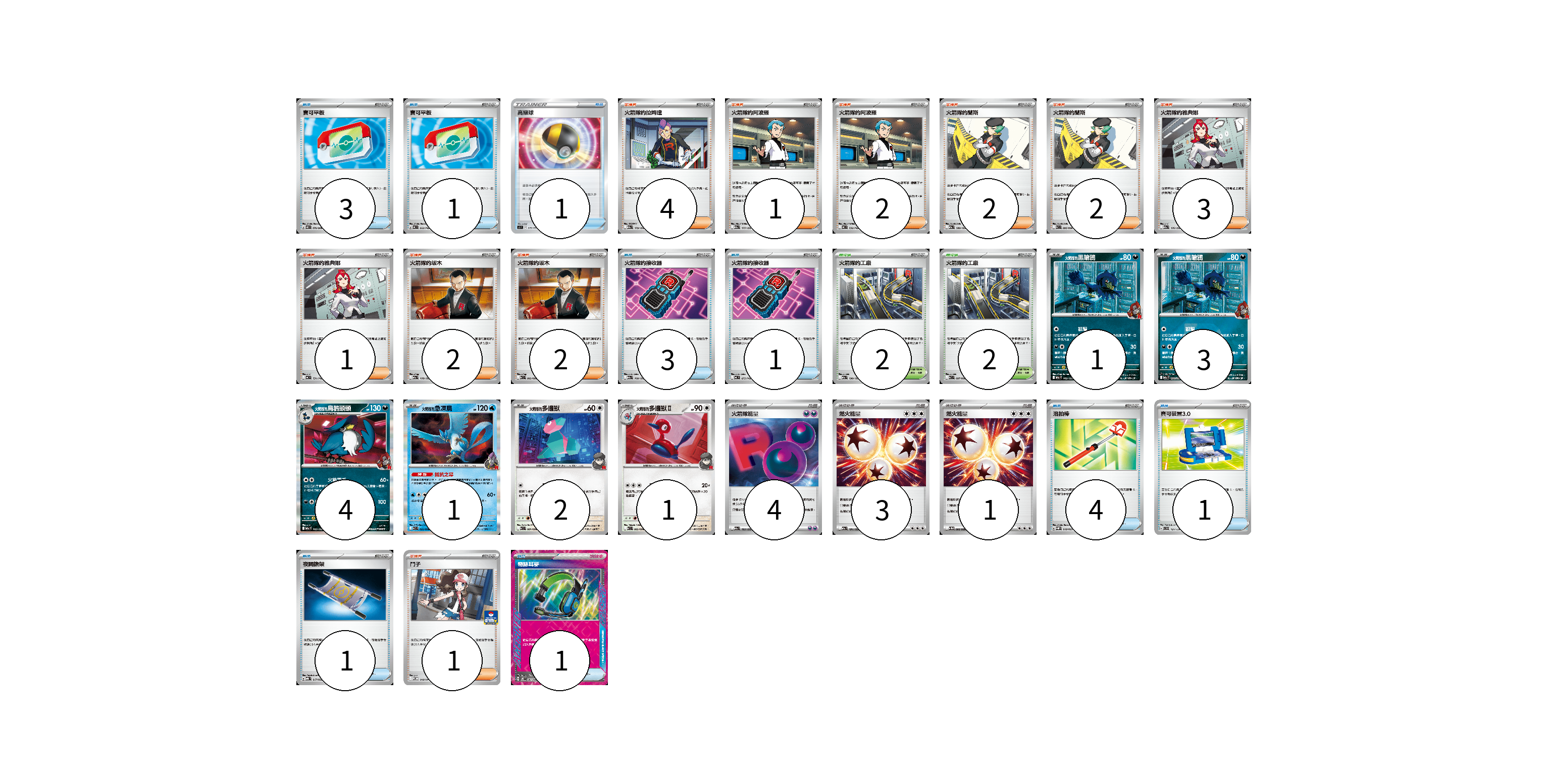 牌組構築方案 以此牌組為基礎新構築牌組 顯示卡面 顯示列表 寶可夢卡(12) 1 3 4 1 2 1 物品卡(16) 3 1 1 3 1 4 1 1 1 支援者卡(20) 4 1 2 2 2 3 1 2 2 1 競技場卡(4) 2 2 能量卡(8) 4 3 1 寶可夢卡(12) 卡牌名稱 張數 卡牌名稱 張數 <火箭隊的>黑暗鴉 M2a 102/193 01 <火箭隊的>黑暗鴉 M2a 102/193 03 火箭隊的烏鴉頭頭 M2a 103/193 04 <火箭隊的>急凍鳥 SV10 022/098 01 <火箭隊的>多邊獸 SV10 081/098 02 <火箭隊的>多邊獸Ⅱ SV10 082/098 01 物品卡(16) 卡牌名稱 張數 卡牌名稱 張數 寶可平板 M3 070/080 03 寶可平板 MC 662/742 01 高級球 SI 375/414 01 火箭隊的接收器 M2a 160/193 03 火箭隊的接收器 MC 675/742 01 洛拍棒 SVQP 018/023 04 寶可裝置3.0 SVD 121/139 01 夜間擔架 MBG 017/022 01 奇跡耳麥 SV8 097/106 01 支援者卡(20) 卡牌名稱 張數 卡牌名稱 張數 火箭隊的拉姆達 M2a 179/193 04 火箭隊的阿波羅 M2a 177/193 01 火箭隊的阿波羅 MC 732/742 02 火箭隊的蘭斯 M2a 180/193 02 火箭隊的蘭斯 SV10 095/098 02 火箭隊的雅典娜 M2a 176/193 03 火箭隊的雅典娜 MC 731/742 01 火箭隊的坂木 M2a 178/193 02 火箭隊的坂木 SV10 093/098 02 鬥子 M-P 048/M-P 01 競技場卡(4) 卡牌名稱 張數 卡牌名稱 張數 火箭隊的工廠 M2a 190/193 02 火箭隊的工廠 SV10 097/098 02 能量卡(8) 卡牌名稱 張數 卡牌名稱 張數 火箭隊能量 M2a 193/193 04 燃火能量 M2a 191/193 03 燃火能量 SV11W 086/086 01 以此牌組為基礎新構築牌組 牌組編碼 LTaQTv-HpArwp-YSTQWm copy 列印牌組單 牌組編碼已複製 分享至SNS