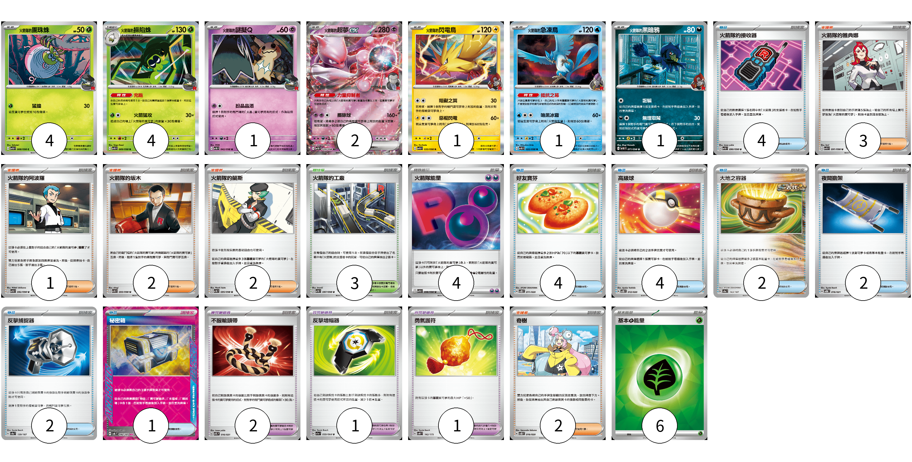牌組構築方案 以此牌組為基礎新構築牌組 顯示卡面 顯示列表 寶可夢卡(14) 4 4 1 2 1 1 1 寶可夢道具(4) 2 1 1 物品卡(19) 4 4 4 2 2 2 1 支援者卡(10) 3 1 2 2 2 競技場卡(3) 3 能量卡(10) 4 6 寶可夢卡(14) 卡牌名稱 張數 卡牌名稱 張數 <火箭隊的>團珠蛛 SV10 008/098 04 <火箭隊的>操陷蛛 SV10 009/098 04 <火箭隊的>謎擬Q SV10 042/098 01 <火箭隊的>超夢ex SV10 039/098 02 <火箭隊的>閃電鳥 SV10 033/098 01 <火箭隊的>急凍鳥 SV10 022/098 01 <火箭隊的>黑暗鴉 SV10 071/098 01 寶可夢道具(4) 卡牌名稱 張數 卡牌名稱 張數 不服輸頭帶 SVTL 016/021 02 反擊增幅器 SV7a 059/064 01 勇氣護符 SVM 142/175 01 物品卡(19) 卡牌名稱 張數 卡牌名稱 張數 火箭隊的接收器 SV10 090/098 04 好友寶芬 SVOD 011/020 04 高級球 SVOD 012/020 04 大地之容器 SV8a 143/187 02 夜間擔架 SVOM 016/021 02 反擊捕捉器 SV8a 139/187 02 秘密箱 SV6 092/101 01 支援者卡(10) 卡牌名稱 張數 卡牌名稱 張數 火箭隊的雅典娜 SV10 091/098 03 火箭隊的阿波羅 SV10 092/098 01 火箭隊的坂木 SV10 093/098 02 火箭隊的蘭斯 SV10 095/098 02 奇樹 SVOD 016/020 02 競技場卡(3) 卡牌名稱 張數 卡牌名稱 張數 火箭隊的工廠 SV10 097/098 03 能量卡(10) 卡牌名稱 張數 卡牌名稱 張數 火箭隊能量 SV10 098/098 04 基本【草】能量 SVK GRA 06 以此牌組為基礎新構築牌組 牌組編碼 LVTIHb-UPZUbs-VgaPOy copy 列印牌組單 牌組編碼已複製 分享至SNS