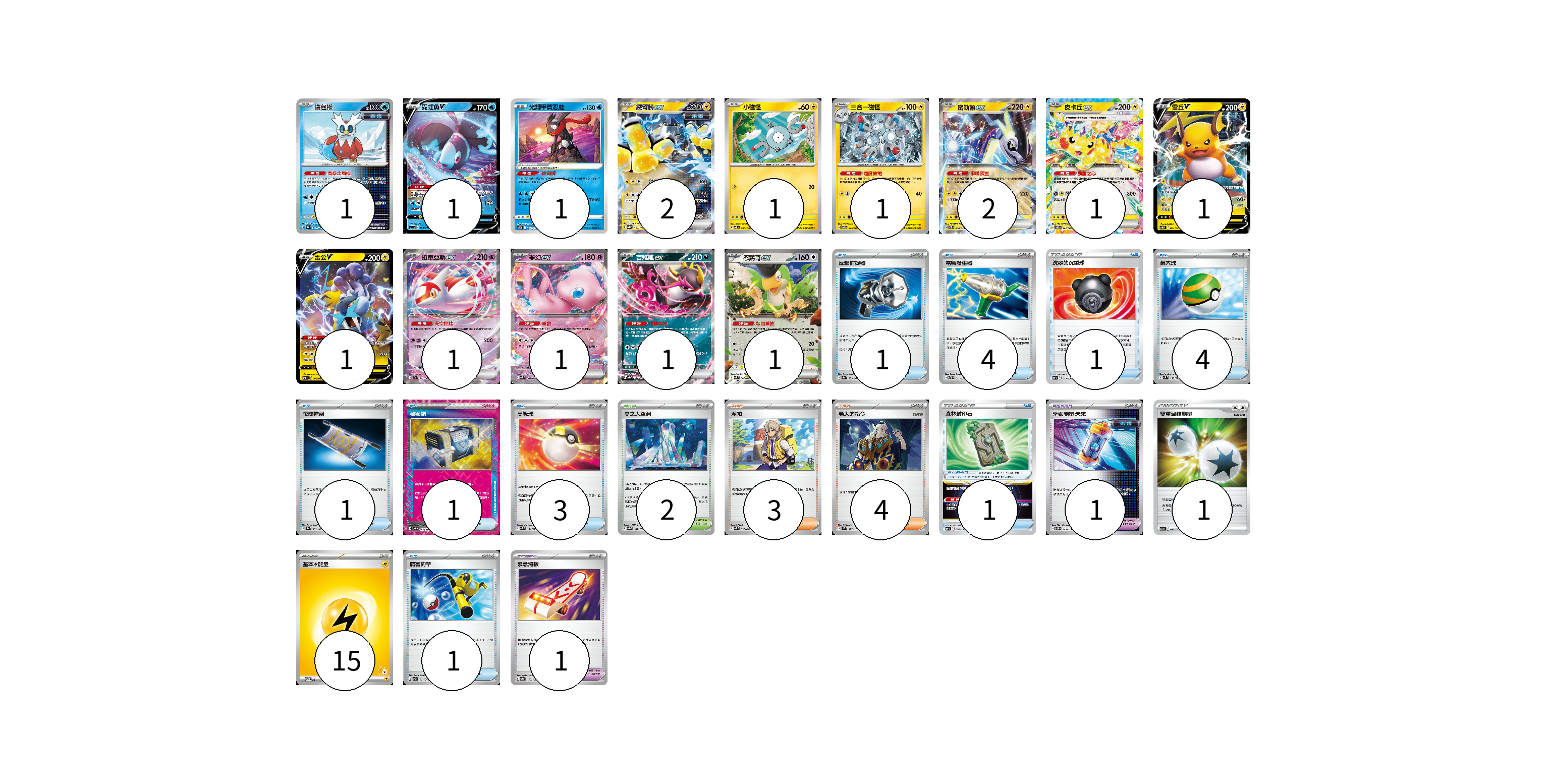 牌組構築方案 以此牌組為基礎新構築牌組 顯示卡面 顯示列表 寶可夢卡(16) 1 1 1 2 1 1 2 1 1 1 1 1 1 1 寶可夢道具(2) 1 1 物品卡(17) 1 4 1 4 1 1 3 1 1 支援者卡(7) 3 4 競技場卡(2) 2 能量卡(16) 1 15 寶可夢卡(16) 卡牌名稱 張數 卡牌名稱 張數 鐵包袱 SV8a 047/187 01 霓虹魚V SVHK 004/022 01 光輝甲賀忍蛙 SVTG 002/019 01 鐵臂膀ex SV8a 054/187 02 小磁怪 SV8 034/106 01 三合一磁怪 SV8 035/106 01 密勒頓ex SVTR 008/021 02 皮卡丘ex SV8 033/106 01 雷丘V SVTR 003/021 01 雷公V SVTR 005/021 01 拉帝亞斯ex SV7a 019/064 01 夢幻ex SVK 001/042 01 吉雉雞ex SV8a 104/187 01 怒鸚哥ex SVK 006/042 01 寶可夢道具(2) 卡牌名稱 張數 卡牌名稱 張數 驅勁能量 未來 SV5M 065/071 01 緊急滑板 SV8a 153/187 01 物品卡(17) 卡牌名稱 張數 卡牌名稱 張數 反擊捕捉器 SV8a 139/187 01 電氣發生器 SVTR 011/021 04 洗翠的沉重球 SVF 019/038 01 巢穴球 SVM 133/175 04 夜間擔架 SV8a 151/187 01 秘密箱 SV6 092/101 01 高級球 SVM 134/175 03 森林封印石 SVF 024/038 01 厲害釣竿 SVK 011/042 01 支援者卡(7) 卡牌名稱 張數 卡牌名稱 張數 派帕 SVK 035/042 03 老大的指令 SVM 172/175 04 競技場卡(2) 卡牌名稱 張數 卡牌名稱 張數 零之大空洞 SV8a 182/187 02 能量卡(16) 卡牌名稱 張數 卡牌名稱 張數 雙重渦輪能量 SVTM 022/022 01 基本【雷】能量 SVI LIG 15 以此牌組為基礎新構築牌組 牌組編碼 LWJtJx-TVFHhZ-XDeCYw copy 列印牌組單 牌組編碼已複製 分享至SNS