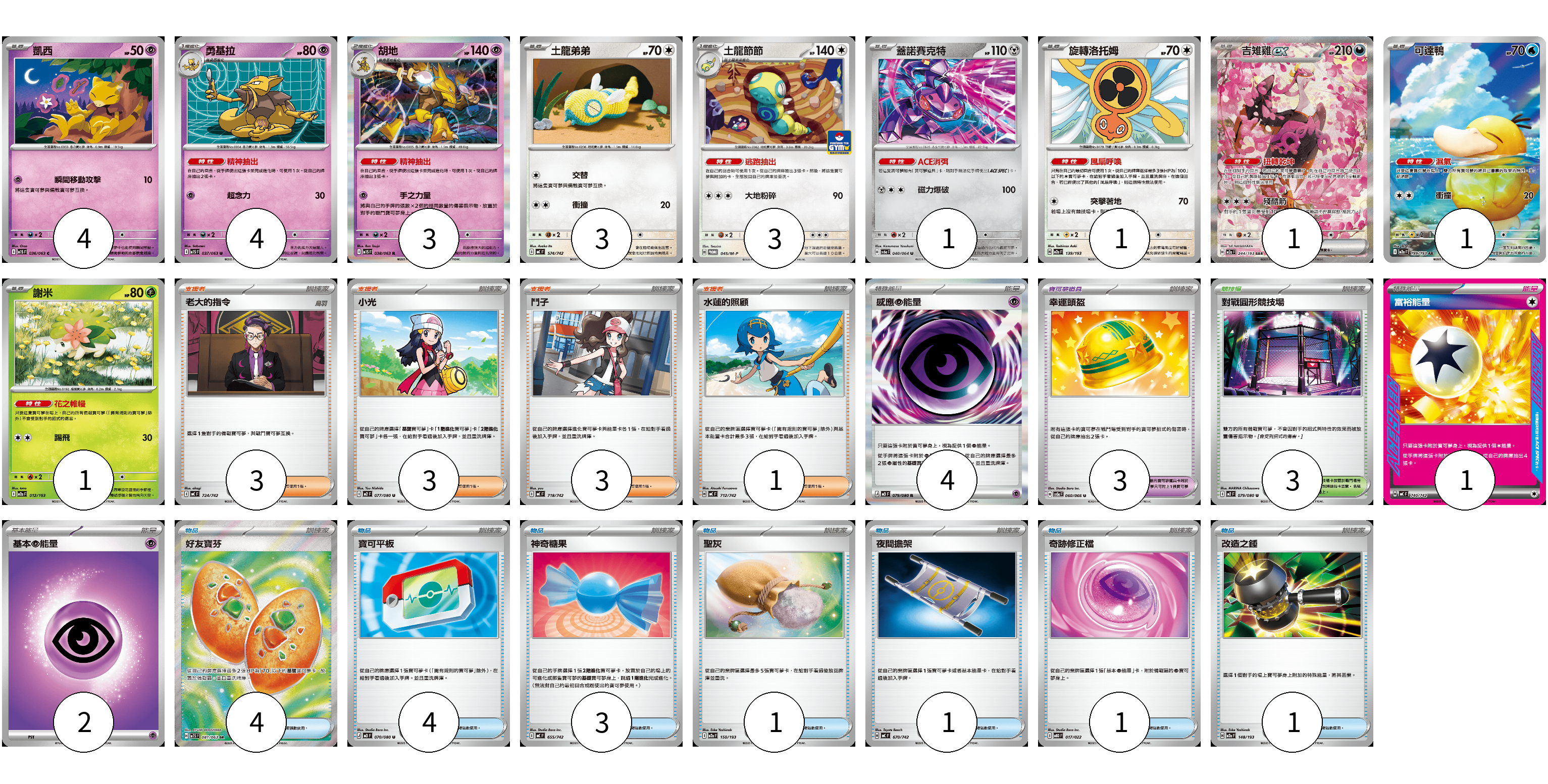 牌組構築方案 以此牌組為基礎新構築牌組 顯示卡面 顯示列表 寶可夢卡(22) 4 4 3 3 3 1 1 1 1 1 寶可夢道具(3) 3 物品卡(15) 4 4 3 1 1 1 1 支援者卡(10) 3 3 3 1 競技場卡(3) 3 能量卡(7) 4 1 2 寶可夢卡(22) 卡牌名稱 張數 卡牌名稱 張數 凱西 M1S 036/063 04 勇基拉 M1S 037/063 04 胡地 M1S 038/063 03 土龍弟弟 MC 574/742 03 土龍節節 M-P 045/M-P 03 蓋諾賽克特 SV6a 040/064 01 旋轉洛托姆 M2a 139/193 01 吉雉雞ex M2a 244/193 01 可達鴨 M2a 199/193 01 謝米 M2a 012/193 01 寶可夢道具(3) 卡牌名稱 張數 卡牌名稱 張數 幸運頭盔 SV5a 060/066 03 物品卡(15) 卡牌名稱 張數 卡牌名稱 張數 好友寶芬 M1S 081/063 04 寶可平板 M3 070/080 04 神奇糖果 MC 655/742 03 聖灰 M2a 150/193 01 夜間擔架 MC 670/742 01 奇跡修正檔 MBD 017/022 01 改造之錘 M2a 148/193 01 支援者卡(10) 卡牌名稱 張數 卡牌名稱 張數 老大的指令 MC 724/742 03 小光 M2 077/080 03 鬥子 MC 718/742 03 水蓮的照顧 MC 712/742 01 競技場卡(3) 卡牌名稱 張數 卡牌名稱 張數 對戰圓形競技場 M2 079/080 03 能量卡(7) 卡牌名稱 張數 卡牌名稱 張數 感應【超】能量 M3 079/080 04 富裕能量 MC 740/742 01 基本【超】能量 MC PSY 02 以此牌組為基礎新構築牌組 牌組編碼 LWzJgy-QjpMFe-xAwkrA copy 列印牌組單 牌組編碼已複製 分享至SNS