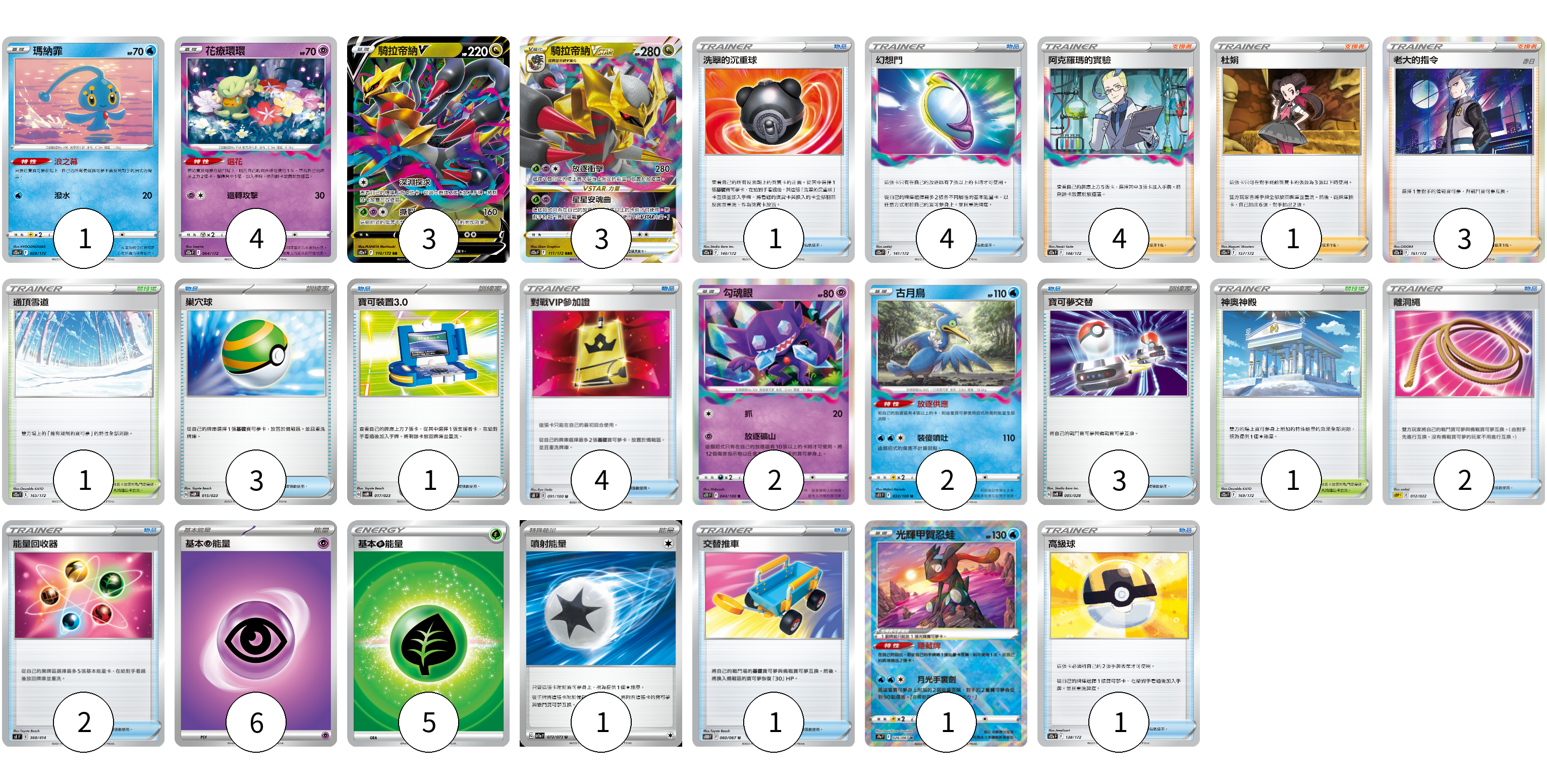 牌組構築方案 以此牌組為基礎新構築牌組 顯示卡面 顯示列表 寶可夢卡(16) 1 4 3 3 2 2 1 物品卡(22) 1 4 3 1 4 3 2 2 1 1 支援者卡(8) 4 1 3 競技場卡(2) 1 1 能量卡(12) 6 5 1 寶可夢卡(16) 卡牌名稱 張數 卡牌名稱 張數 瑪納霏 S12a 029/172 01 花療環環 S12a 064/172 04 騎拉帝納V S12a 110/172 03 騎拉帝納VSTAR S12a 111/172 03 勾魂眼 S11 044/100 02 古月鳥 S11 033/100 02 光輝甲賀忍蛙 S9a 026/067 01 物品卡(22) 卡牌名稱 張數 卡牌名稱 張數 洗翠的沉重球 S12a 140/172 01 幻想門 S12a 141/172 04 巢穴球 SVAM 015/023 03 寶可裝置3.0 SVAM 017/023 01 對戰VIP參加證 S8 091/100 04 寶可夢交替 SVB 005/028 03 離洞繩 SDP 012/022 02 能量回收器 SI 368/414 02 交替推車 S10D 060/067 01 高級球 S12a 138/172 01 支援者卡(8) 卡牌名稱 張數 卡牌名稱 張數 阿克羅瑪的實驗 S12a 148/172 04 杜娟 S12a 157/172 01 老大的指令(赤日) S12a 161/172 03 競技場卡(2) 卡牌名稱 張數 卡牌名稱 張數 通頂雪道 S12a 165/172 01 神奧神殿 S12a 169/172 01 能量卡(12) 卡牌名稱 張數 卡牌名稱 張數 基本【超】能量 SVAW PSY 06 基本【草】能量 SI GRA 05 噴射能量 SV1a 072/073 01 以此牌組為基礎新構築牌組 牌組編碼 LalrAp-uSUTyP-UpwmCr copy 列印牌組單 牌組編碼已複製 分享至SNS