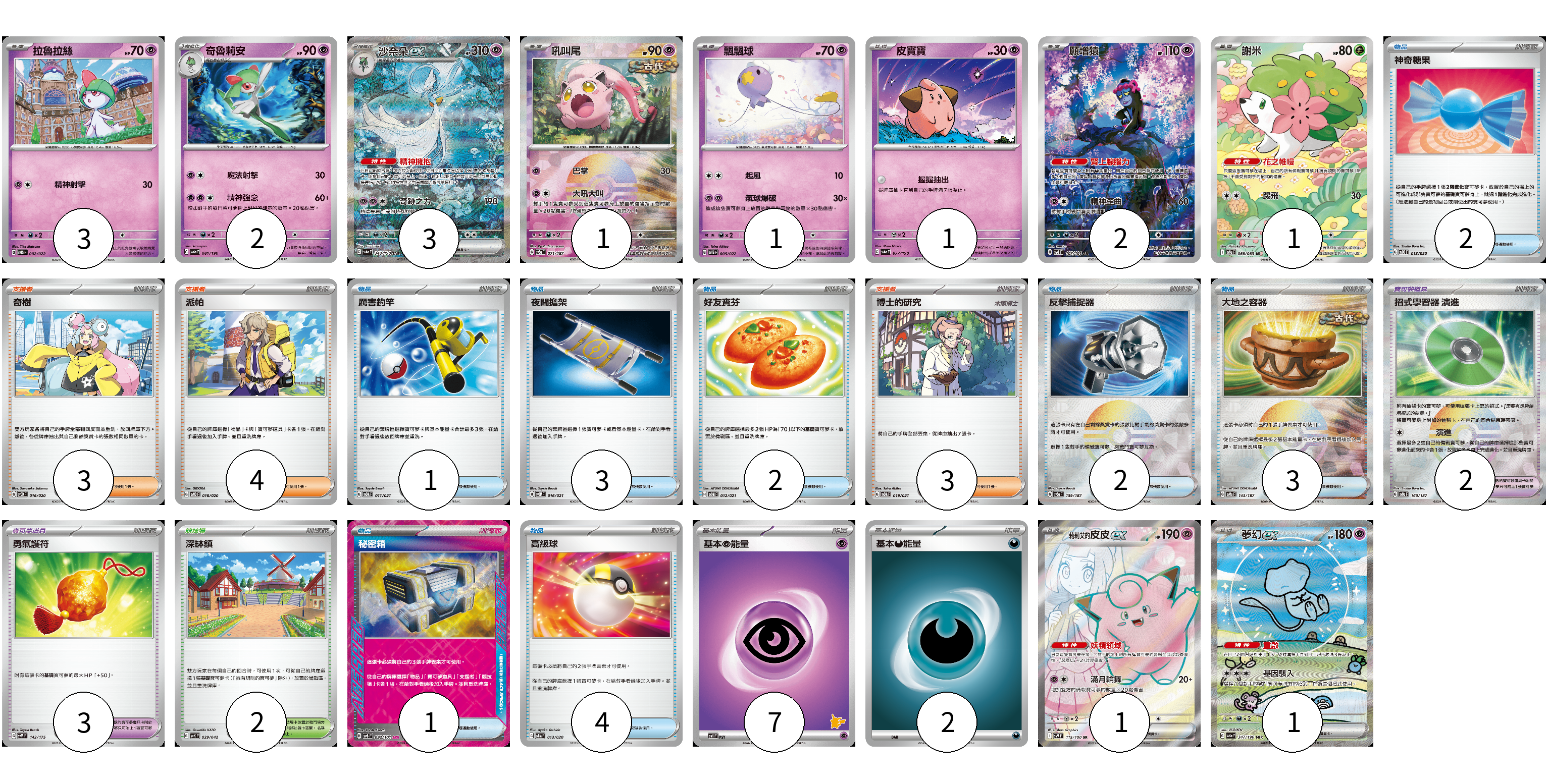 牌組構築方案 以此牌組為基礎新構築牌組 顯示卡面 顯示列表 寶可夢卡(16) 3 2 3 1 1 1 2 1 1 1 寶可夢道具(5) 2 3 物品卡(18) 2 1 3 2 2 3 1 4 支援者卡(10) 3 4 3 競技場卡(2) 2 能量卡(9) 7 2 寶可夢卡(16) 卡牌名稱 張數 卡牌名稱 張數 拉魯拉絲 SVTS 002/022 03 奇魯莉安 SV4a 081/190 02 沙奈朵ex SV4a 348/190 03 吼叫尾 SV8a 071/187 01 飄飄球 SVTS 005/022 01 皮寶寶 SV4a 077/190 01 願增猿 SV6 107/101 02 謝米 SV9a 066/063 01 莉莉艾的皮皮ex SV9 115/100 01 夢幻ex SV4a 347/190 01 寶可夢道具(5) 卡牌名稱 張數 卡牌名稱 張數 招式學習器 演進 SV8a 160/187 02 勇氣護符 SVM 142/175 03 物品卡(18) 卡牌名稱 張數 卡牌名稱 張數 神奇糖果 SVOD 013/020 02 厲害釣竿 SVOM 011/021 01 夜間擔架 SVOM 016/021 03 好友寶芬 SVOM 012/021 02 反擊捕捉器 SV8a 139/187 02 大地之容器 SV8a 143/187 03 秘密箱 SV6 092/101 01 高級球 SVEM 013/020 04 支援者卡(10) 卡牌名稱 張數 卡牌名稱 張數 奇樹 SVOD 016/020 03 派帕 SVOD 018/020 04 博士的研究 SVOM 019/021 03 競技場卡(2) 卡牌名稱 張數 卡牌名稱 張數 深缽鎮 SVK 039/042 02 能量卡(9) 卡牌名稱 張數 卡牌名稱 張數 基本【超】能量 SVI PSY 07 基本【惡】能量 SVF DAR 02 以此牌組為基礎新構築牌組 牌組編碼 LdnCeU-xWeenZ-hNErMu copy 列印牌組單 牌組編碼已複製 分享至SNS