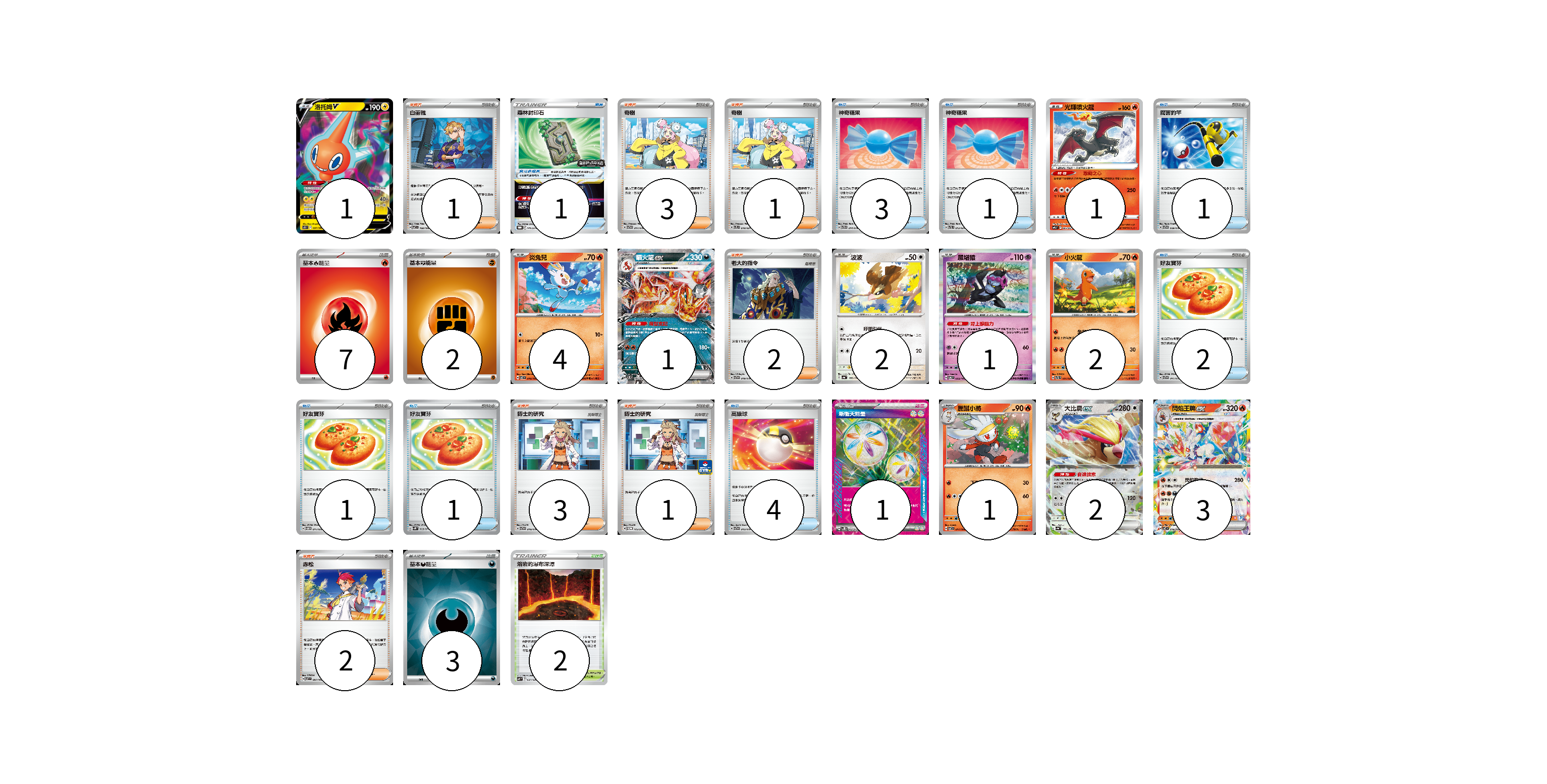 牌組構築方案 以此牌組為基礎新構築牌組 顯示卡面 顯示列表 寶可夢卡(18) 1 1 4 1 2 1 2 1 2 3 寶可夢道具(2) 1 1 物品卡(13) 3 1 1 2 1 1 4 支援者卡(12) 1 3 2 3 1 2 競技場卡(2) 2 能量卡(13) 7 2 1 3 寶可夢卡(18) 卡牌名稱 張數 卡牌名稱 張數 洛托姆V S11 037/100 01 光輝噴火龍 SVTL 003/021 01 炎兔兒 SV7 016/102 04 噴火龍ex SVTL 006/021 01 波波 SV4a 137/190 02 願增猿 SV6 055/101 01 小火龍 SVTL 001/021 02 騰蹴小將 SV7 017/102 01 大比鳥ex SV4a 139/190 02 閃焰王牌ex SV7 018/102 03 寶可夢道具(2) 卡牌名稱 張數 卡牌名稱 張數 森林封印石 SV-P 141/SV-P 01 奇樹 SVTL 018/021 01 物品卡(13) 卡牌名稱 張數 卡牌名稱 張數 神奇糖果 SVTG 014/019 03 神奇糖果 SVTL 013/021 01 厲害釣竿 SVTG 009/019 01 好友寶芬 SVTG 011/019 02 好友寶芬 SVTM 011/022 01 好友寶芬 SV5K 063/071 01 高級球 SVTG 013/019 04 支援者卡(12) 卡牌名稱 張數 卡牌名稱 張數 白蕾雅 SV7 100/102 01 奇樹 SVTG 017/019 03 老大的指令 SVTG 019/019 02 博士的研究 SVTG 018/019 03 博士的研究 SV-P 113/SV-P 01 赤松 SV7 097/102 02 競技場卡(2) 卡牌名稱 張數 卡牌名稱 張數 熔岩的瀑布深潭 SVF 037/038 02 能量卡(13) 卡牌名稱 張數 卡牌名稱 張數 基本【火】能量 SVTL FIR 07 基本【鬥】能量 SVB FIG 02 新衝天能量 SV5K 071/071 01 基本【惡】能量 SVK DAR 03 以此牌組為基礎新構築牌組 牌組編碼 LdwspD-itOXKS-llnSbA copy 列印牌組單 牌組編碼已複製 分享至SNS