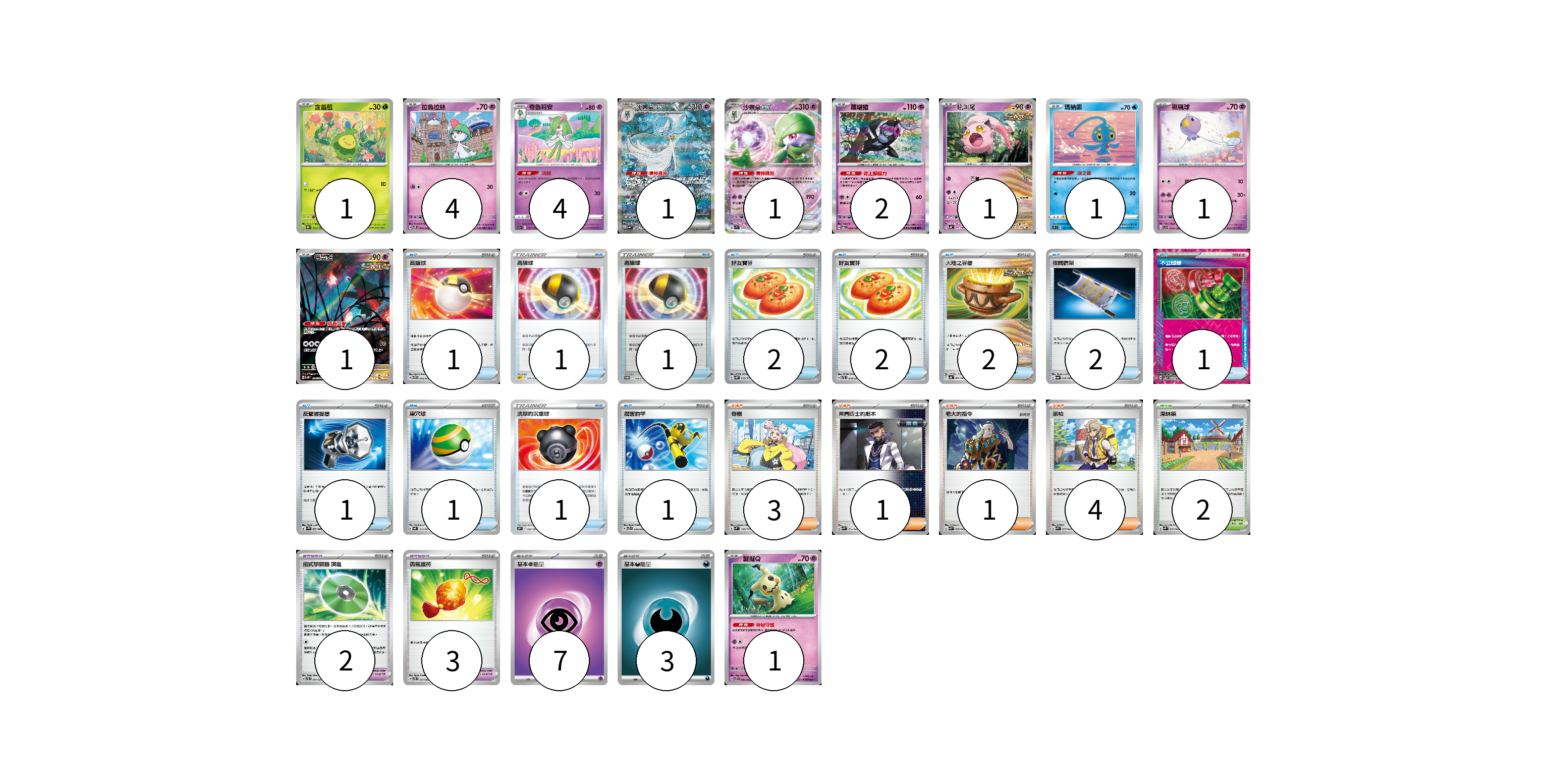 牌組構築方案 以此牌組為基礎新構築牌組 顯示卡面 顯示列表 寶可夢卡(18) 1 4 4 1 1 2 1 1 1 1 1 寶可夢道具(5) 2 3 物品卡(16) 1 1 1 2 2 2 2 1 1 1 1 1 支援者卡(9) 3 1 1 4 競技場卡(2) 2 能量卡(10) 7 3 寶可夢卡(18) 卡牌名稱 張數 卡牌名稱 張數 含羞苞 SV8a 001/187 01 拉魯拉絲 SVTS 002/022 04 奇魯莉安 S11a 037/068 04 沙奈朵ex SV4a 348/190 01 沙奈朵ex SV1S 028/078 01 願增猿 SV6 055/101 02 吼叫尾 SV4K 032/066 01 瑪納霏 S9 031/100 01 飄飄球 SVD 052/139 01 振翼髮 SV5K 076/071 01 謎擬Q SVTS 006/022 01 寶可夢道具(5) 卡牌名稱 張數 卡牌名稱 張數 招式學習器 演進 SVTL 017/021 02 勇氣護符 SVTS 017/022 03 物品卡(16) 卡牌名稱 張數 卡牌名稱 張數 高級球 SVTG 013/019 01 高級球 SDP 015/022 01 高級球 S-P 148/S-P 01 好友寶芬 SV5K 063/071 02 好友寶芬 SVTL 010/021 02 大地之容器 SV4K 060/066 02 夜間擔架 SV6a 056/064 02 不公印章 SV5a 053/066 01 反擊捕捉器 SV4M 059/066 01 巢穴球 SVAL 012/021 01 洗翠的沉重球 S10P 062/067 01 厲害釣竿 SVTS 010/022 01 支援者卡(9) 卡牌名稱 張數 卡牌名稱 張數 奇樹 SVM 160/175 03 弗圖博士的劇本 SVK 034/042 01 老大的指令 SVK 036/042 01 派帕 SVK 035/042 04 競技場卡(2) 卡牌名稱 張數 卡牌名稱 張數 深缽鎮 SVK 039/042 02 能量卡(10) 卡牌名稱 張數 卡牌名稱 張數 基本超能量 sv-p PSY 07 基本惡能量 sv-p DAR 03 以此牌組為基礎新構築牌組 牌組編碼 LfHlDT-lBMeNu-RLFWvF copy 列印牌組單 牌組編碼已複製 分享至SNS