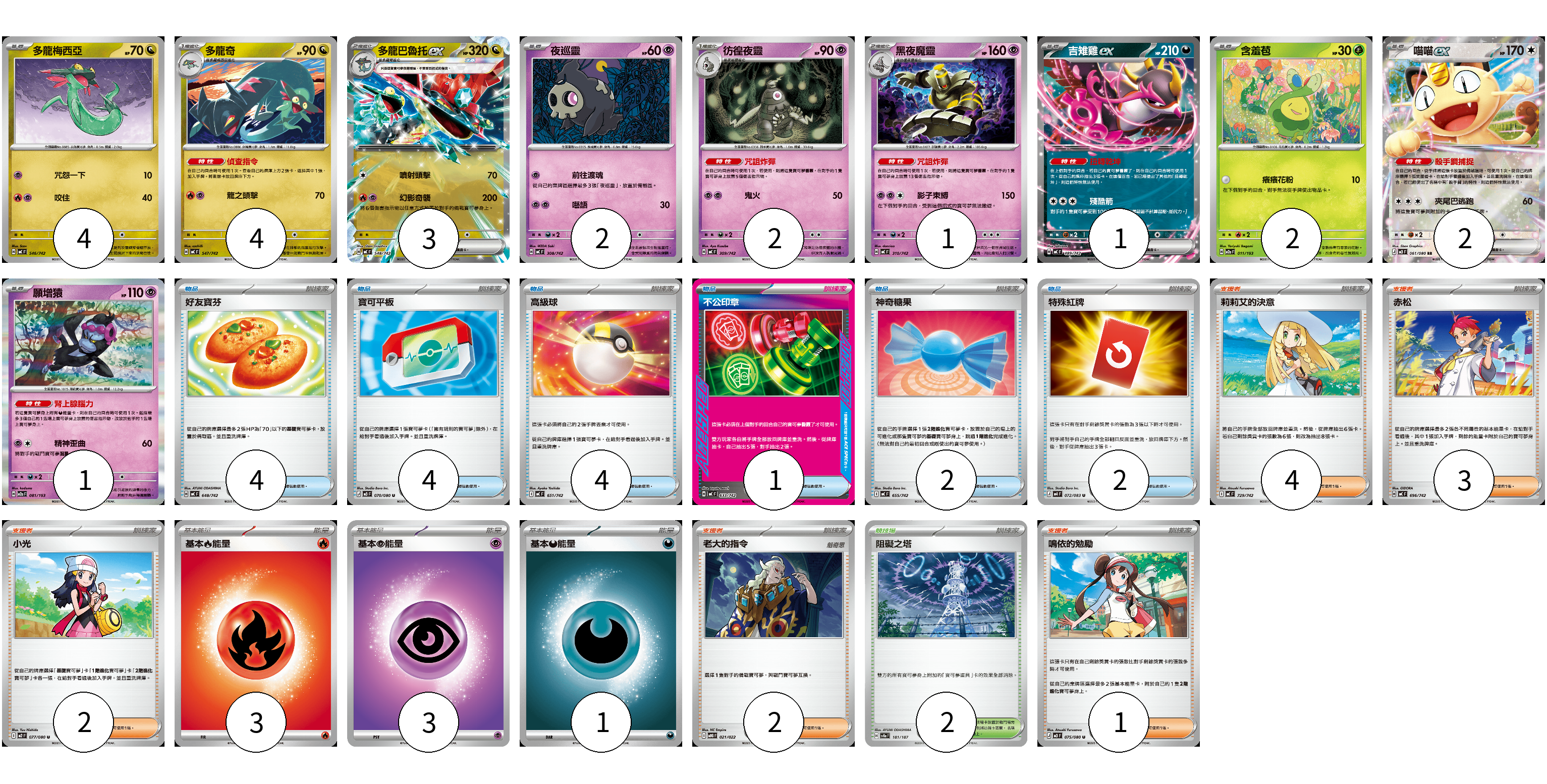 牌組構築方案 以此牌組為基礎新構築牌組 顯示卡面 顯示列表 寶可夢卡(22) 4 4 3 2 2 1 1 2 2 1 物品卡(17) 4 4 4 1 2 2 支援者卡(12) 4 3 2 2 1 競技場卡(2) 2 能量卡(7) 3 3 1 寶可夢卡(22) 卡牌名稱 張數 卡牌名稱 張數 多龍梅西亞 MC 546/742 04 多龍奇 MC 547/742 04 多龍巴魯托ex MC 548/742 03 夜巡靈 MC 308/742 02 彷徨夜靈 MC 309/742 02 黑夜魔靈 MC 310/742 01 吉雉雞ex MC 489/742 01 含羞苞 M2a 011/193 02 喵喵ex M3 061/080 02 願增猿 M2a 081/193 01 物品卡(17) 卡牌名稱 張數 卡牌名稱 張數 好友寶芬 MC 648/742 04 寶可平板 M3 070/080 04 高級球 MC 651/742 04 不公印章 MC 633/742 01 神奇糖果 MC 655/742 02 特殊紅牌 M4 072/083 02 支援者卡(12) 卡牌名稱 張數 卡牌名稱 張數 莉莉艾的決意 MC 729/742 04 赤松 MC 696/742 03 小光 M2 077/080 02 老大的指令 MBG 021/022 02 鳴依的勉勵 M3 075/080 01 競技場卡(2) 卡牌名稱 張數 卡牌名稱 張數 阻礙之塔 SV8a 181/187 02 能量卡(7) 卡牌名稱 張數 卡牌名稱 張數 基本【火】能量 MC FIR 03 基本【超】能量 M-P PSY 03 基本【惡】能量 M-P DAR 01 以此牌組為基礎新構築牌組 牌組編碼 LhDotl-NTIGgB-Tcyycw copy 列印牌組單 牌組編碼已複製 分享至SNS