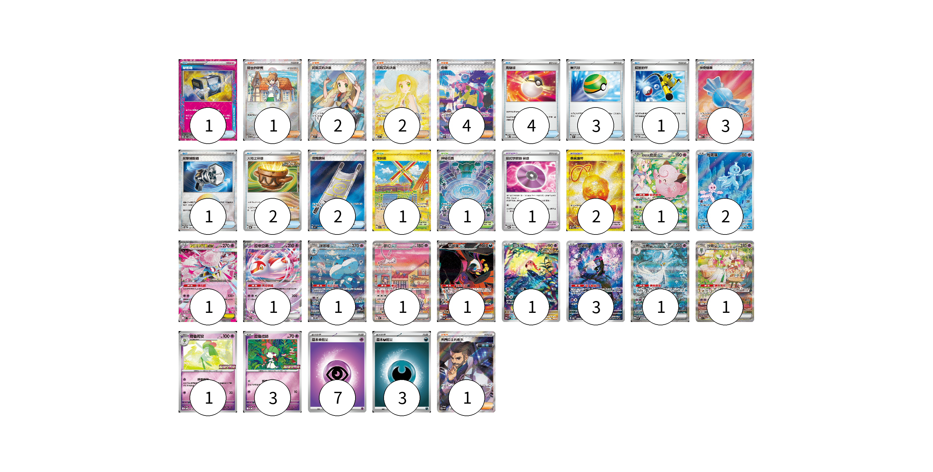 牌組構築方案 以此牌組為基礎新構築牌組 顯示卡面 顯示列表 寶可夢卡(18) 1 2 1 1 1 1 1 1 3 1 1 1 3 寶可夢道具(3) 1 2 物品卡(17) 1 4 3 1 3 1 2 2 支援者卡(10) 1 2 2 4 1 競技場卡(2) 1 1 能量卡(10) 7 3 寶可夢卡(18) 卡牌名稱 張數 卡牌名稱 張數 莉莉艾的皮皮ex SV9 126/100 01 輕飄飄 SV11W 124/086 02 超級蒂安希ex MBD 006/022 01 拉帝亞斯ex M2a 075/193 01 胖嘟嘟ex SV11W 170/086 01 夢幻ex SV2a 205/165 01 吉雉雞ex SV6a 089/064 01 吼叫尾 SV4K 071/066 01 願增猿 SV6 107/101 03 沙奈朵ex SV4a 348/190 01 沙奈朵ex SV1S 101/078 01 奇魯莉安 M-P 006/M-P 01 拉魯拉絲 M-P 005/M-P 03 寶可夢道具(3) 卡牌名稱 張數 卡牌名稱 張數 招式學習器 衰退 SV8a 161/187 01 勇氣護符 SV7 134/102 02 物品卡(17) 卡牌名稱 張數 卡牌名稱 張數 秘密箱 SV6 092/101 01 高級球 MBD 014/022 04 巢穴球 SVK 016/042 03 厲害釣竿 SVOD 010/020 01 神奇糖果 M1S 082/063 03 反擊捕捉器 SV8a 139/187 01 大地之容器 SV8a 143/187 02 夜間擔架 M1L 083/063 02 支援者卡(10) 卡牌名稱 張數 卡牌名稱 張數 博士的研究 SV11B 084/086 01 莉莉艾的決意 M1L 086/063 02 莉莉艾的決意 M1L 091/063 02 奇樹 SV4a 350/190 04 弗圖博士的劇本 SV4M 086/066 01 競技場卡(2) 卡牌名稱 張數 卡牌名稱 張數 深缽鎮 SV3 140/108 01 神秘花園 M1S 086/063 01 能量卡(10) 卡牌名稱 張數 卡牌名稱 張數 基本【超】能量 M-P PSY 07 基本【惡】能量 M-P DAR 03 以此牌組為基礎新構築牌組 牌組編碼 LiRLWq-MDkkeY-ColwPd copy 列印牌組單 牌組編碼已複製 分享至SNS