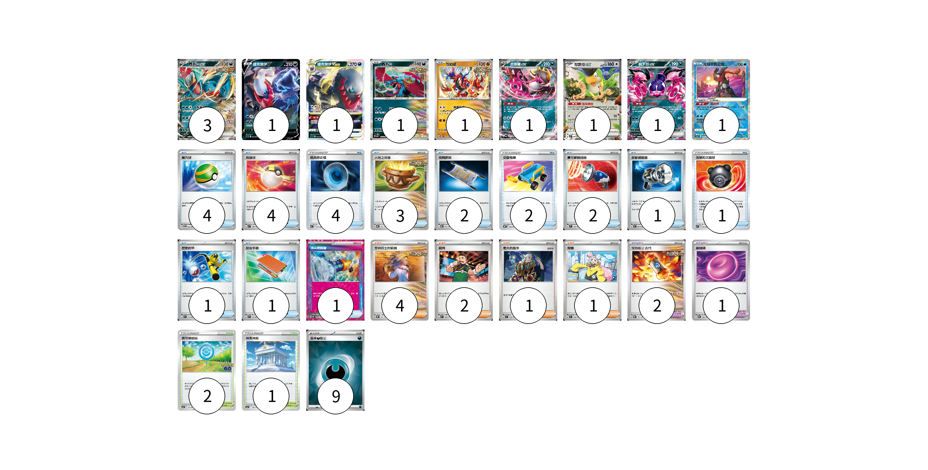 牌組構築方案 以此牌組為基礎新構築牌組 顯示卡面 顯示列表 寶可夢卡(11) 3 1 1 1 1 1 1 1 1 寶可夢道具(3) 2 1 物品卡(26) 4 4 4 3 2 2 2 1 1 1 1 1 支援者卡(8) 4 2 1 1 競技場卡(3) 2 1 能量卡(9) 9 寶可夢卡(11) 卡牌名稱 張數 卡牌名稱 張數 轟鳴月ex SV4K 054/066 03 達克萊伊V SLD 007/020 01 達克萊伊VSTAR SLD 008/020 01 轟鳴月 SV5K 051/071 01 故勒頓 SV8 069/106 01 吉雉雞ex SV6a 038/064 01 怒鸚哥ex SVK 006/042 01 桃歹郎ex SV6a 039/064 01 光輝甲賀忍蛙 S12a 033/172 01 寶可夢道具(3) 卡牌名稱 張數 卡牌名稱 張數 驅勁能量 古代 SV8a 157/187 02 鎖鏈糬 SV8a 154/187 01 物品卡(26) 卡牌名稱 張數 卡牌名稱 張數 巢穴球 SVTR 013/021 04 高級球 SVM 134/175 04 暗黑修正檔 SVF 014/038 04 大地之容器 SV8a 143/187 03 夜間擔架 SV8a 151/187 02 交替推車 SVTR 009/021 02 寶可夢捕捉器 SVM 137/175 02 反擊捕捉器 SVK 009/042 01 洗翠的沉重球 SVF 019/038 01 厲害釣竿 SVK 011/042 01 朋友手冊 SVK 014/042 01 頂尖捕捉器 SV8a 148/187 01 支援者卡(8) 卡牌名稱 張數 卡牌名稱 張數 奧琳博士的氣魄 SV8a 167/187 04 裁判 SVM 154/175 02 老大的指令 SVM 172/175 01 奇樹 SVM 160/175 01 競技場卡(3) 卡牌名稱 張數 卡牌名稱 張數 寶可補給站 S10b 071/071 02 神奧神殿 S12a 169/172 01 能量卡(9) 卡牌名稱 張數 卡牌名稱 張數 基本【惡】能量 SVK DAR 09 以此牌組為基礎新構築牌組 牌組編碼 LiarRF-bfhosb-cKIPdB copy 列印牌組單 牌組編碼已複製 分享至SNS