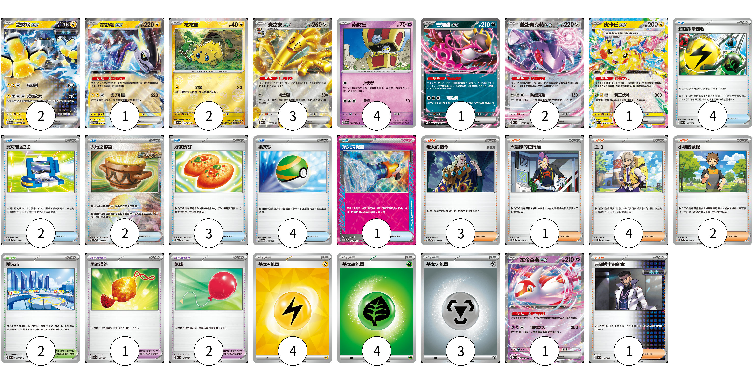 牌組構築方案 以此牌組為基礎新構築牌組 顯示卡面 顯示列表 寶可夢卡(17) 2 1 2 3 4 1 2 1 1 寶可夢道具(3) 1 2 物品卡(16) 4 2 2 3 4 1 支援者卡(11) 3 1 4 2 1 競技場卡(2) 2 能量卡(11) 4 4 3 寶可夢卡(17) 卡牌名稱 張數 卡牌名稱 張數 鐵臂膀ex SV8a 054/187 02 密勒頓ex SVTR 008/021 01 電電蟲 SV11W 030/086 02 賽富豪ex SV8a 117/187 03 索財靈 SV7a 024/064 04 吉雉雞ex SVOD 004/020 01 蓋諾賽克特ex M2a 119/193 02 皮卡丘ex M2a 044/193 01 拉帝亞斯ex M2a 075/193 01 寶可夢道具(3) 卡牌名稱 張數 卡牌名稱 張數 勇氣護符 SVM 142/175 01 氣球 M2a 165/193 02 物品卡(16) 卡牌名稱 張數 卡牌名稱 張數 超級能量回收 SV8a 141/187 04 寶可裝置3.0 SVK 021/042 02 大地之容器 SV8a 143/187 02 好友寶芬 MBG 011/022 03 巢穴球 SVTG 012/019 04 頂尖捕捉器 SV8a 148/187 01 支援者卡(11) 卡牌名稱 張數 卡牌名稱 張數 老大的指令 SVOD 019/020 03 火箭隊的拉姆達 SV10 094/098 01 派帕 SVK 035/042 04 小剛的發掘 SV9 096/100 02 弗圖博士的劇本 SVK 034/042 01 競技場卡(2) 卡牌名稱 張數 卡牌名稱 張數 釀光市 SV9 098/100 02 能量卡(11) 卡牌名稱 張數 卡牌名稱 張數 基本【雷】能量 SVQP LIG 04 基本【草】能量 M-P GRA 04 基本【鋼】能量 M-P MET 03 以此牌組為基礎新構築牌組 牌組編碼 LqMnZt-xvZKYQ-vgaPny copy 列印牌組單 牌組編碼已複製 分享至SNS