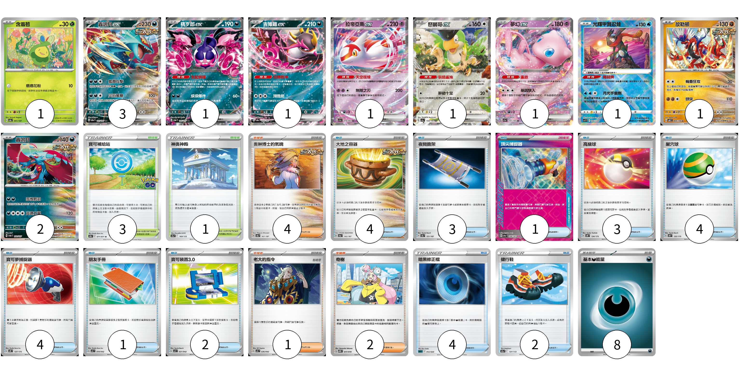 牌組構築方案 以此牌組為基礎新構築牌組 顯示卡面 顯示列表 寶可夢卡(13) 1 3 1 1 1 1 1 1 1 2 物品卡(28) 4 3 1 3 4 4 1 2 4 2 支援者卡(7) 4 1 2 競技場卡(4) 3 1 能量卡(8) 8 寶可夢卡(13) 卡牌名稱 張數 卡牌名稱 張數 含羞苞 SV8a 001/187 01 轟鳴月ex SV8a 101/187 03 桃歹郎ex SV8a 105/187 01 吉雉雞ex SV8a 104/187 01 拉帝亞斯ex SV7a 019/064 01 怒鸚哥ex SV4a 154/190 01 夢幻ex SV2a 151/165 01 光輝甲賀忍蛙 SVF 004/038 01 故勒頓 SV8 069/106 01 轟鳴月 SV8a 100/187 02 物品卡(28) 卡牌名稱 張數 卡牌名稱 張數 大地之容器 SV8a 143/187 04 夜間擔架 SV8a 151/187 03 頂尖捕捉器 SV8a 148/187 01 高級球 SVM 134/175 03 巢穴球 SVM 133/175 04 寶可夢捕捉器 SVM 137/175 04 朋友手冊 SVK 014/042 01 寶可裝置3.0 SVK 021/042 02 暗黑修正檔 SLD 012/020 04 健行鞋 S12a 137/172 02 支援者卡(7) 卡牌名稱 張數 卡牌名稱 張數 奧琳博士的氣魄 SV8a 167/187 04 老大的指令 SVK 036/042 01 奇樹 SVTG 017/019 02 競技場卡(4) 卡牌名稱 張數 卡牌名稱 張數 寶可補給站 S10b 071/071 03 神奧神殿 S12a 169/172 01 能量卡(8) 卡牌名稱 張數 卡牌名稱 張數 基本【惡】能量 SVD DAR 08 以此牌組為基礎新構築牌組 牌組編碼 LtuULi-LPzLuE-dvBnFQ copy 列印牌組單 牌組編碼已複製 分享至SNS