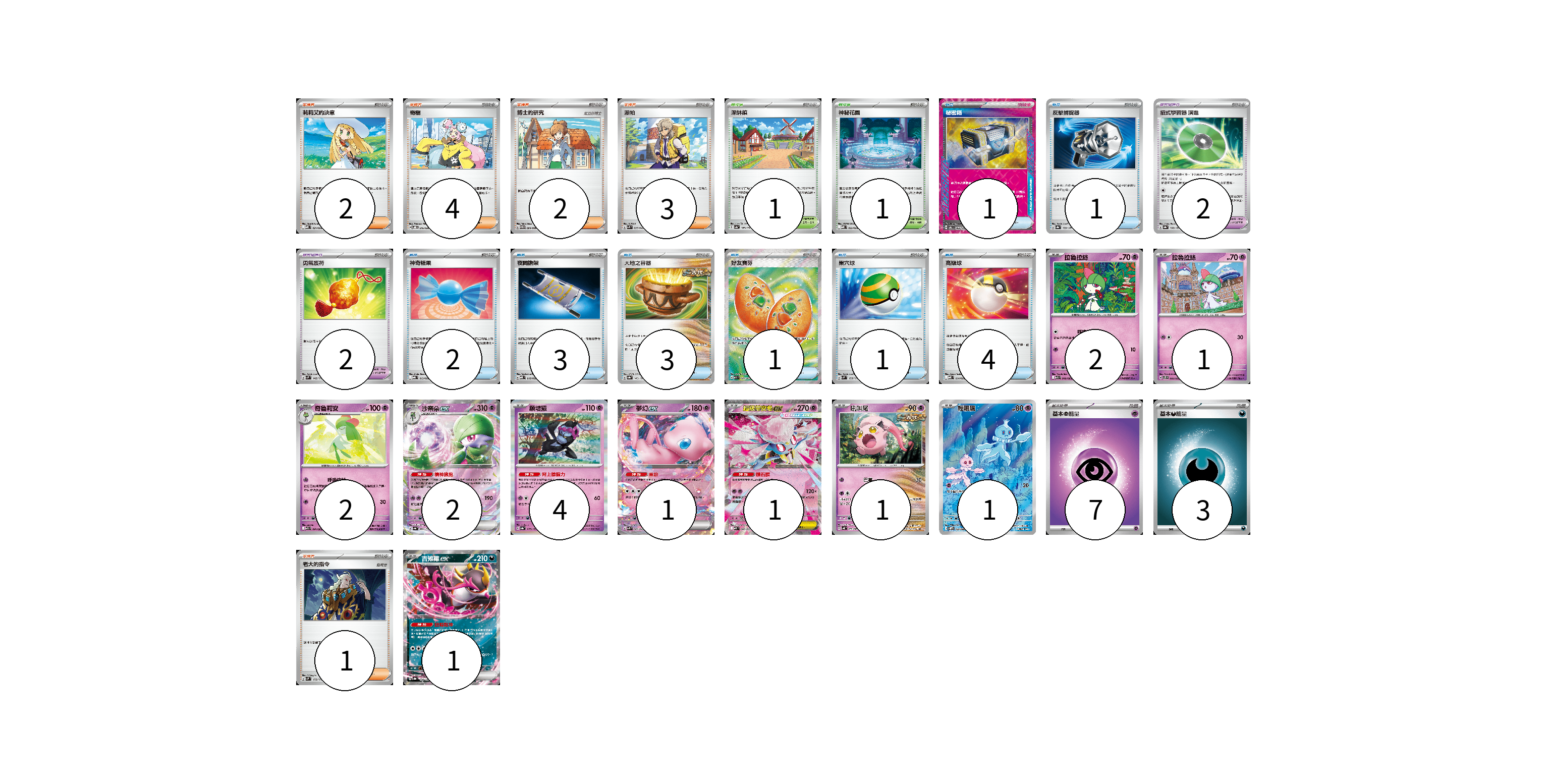 牌組構築方案 以此牌組為基礎新構築牌組 顯示卡面 顯示列表 寶可夢卡(16) 2 1 2 2 4 1 1 1 1 1 寶可夢道具(4) 2 2 物品卡(16) 1 1 2 3 3 1 1 4 支援者卡(12) 2 4 2 3 1 競技場卡(2) 1 1 能量卡(10) 7 3 寶可夢卡(16) 卡牌名稱 張數 卡牌名稱 張數 拉魯拉絲 M1S 040/063 02 拉魯拉絲 SVTS 002/022 01 奇魯莉安 M1S 041/063 02 沙奈朵ex SV4a 082/190 02 願增猿 SV8a 075/187 04 夢幻ex SVK 001/042 01 超級蒂安希ex MBD 006/022 01 吼叫尾 SV4K 032/066 01 輕飄飄 SV11W 124/086 01 吉雉雞ex SV8a 104/187 01 寶可夢道具(4) 卡牌名稱 張數 卡牌名稱 張數 招式學習器 演進 SV8a 160/187 02 勇氣護符 SVM 142/175 02 物品卡(16) 卡牌名稱 張數 卡牌名稱 張數 秘密箱 SV6 092/101 01 反擊捕捉器 SV8a 139/187 01 神奇糖果 MBG 013/022 02 夜間擔架 MBD 016/022 03 大地之容器 SV8a 143/187 03 好友寶芬 M1S 081/063 01 巢穴球 SVM 133/175 01 高級球 MBD 014/022 04 支援者卡(12) 卡牌名稱 張數 卡牌名稱 張數 莉莉艾的決意 MBD 021/022 02 奇樹 SVOD 016/020 04 博士的研究 SV11B 084/086 02 派帕 SVK 035/042 03 老大的指令 SVM 172/175 01 競技場卡(2) 卡牌名稱 張數 卡牌名稱 張數 深缽鎮 SV4a 185/190 01 神秘花園 MBD 022/022 01 能量卡(10) 卡牌名稱 張數 卡牌名稱 張數 基本【超】能量 MBD PSY 07 基本【惡】能量 MBG DAR 03 以此牌組為基礎新構築牌組 牌組編碼 LxFoiu-WrSiuK-iCaIsf copy 列印牌組單 牌組編碼已複製 分享至SNS