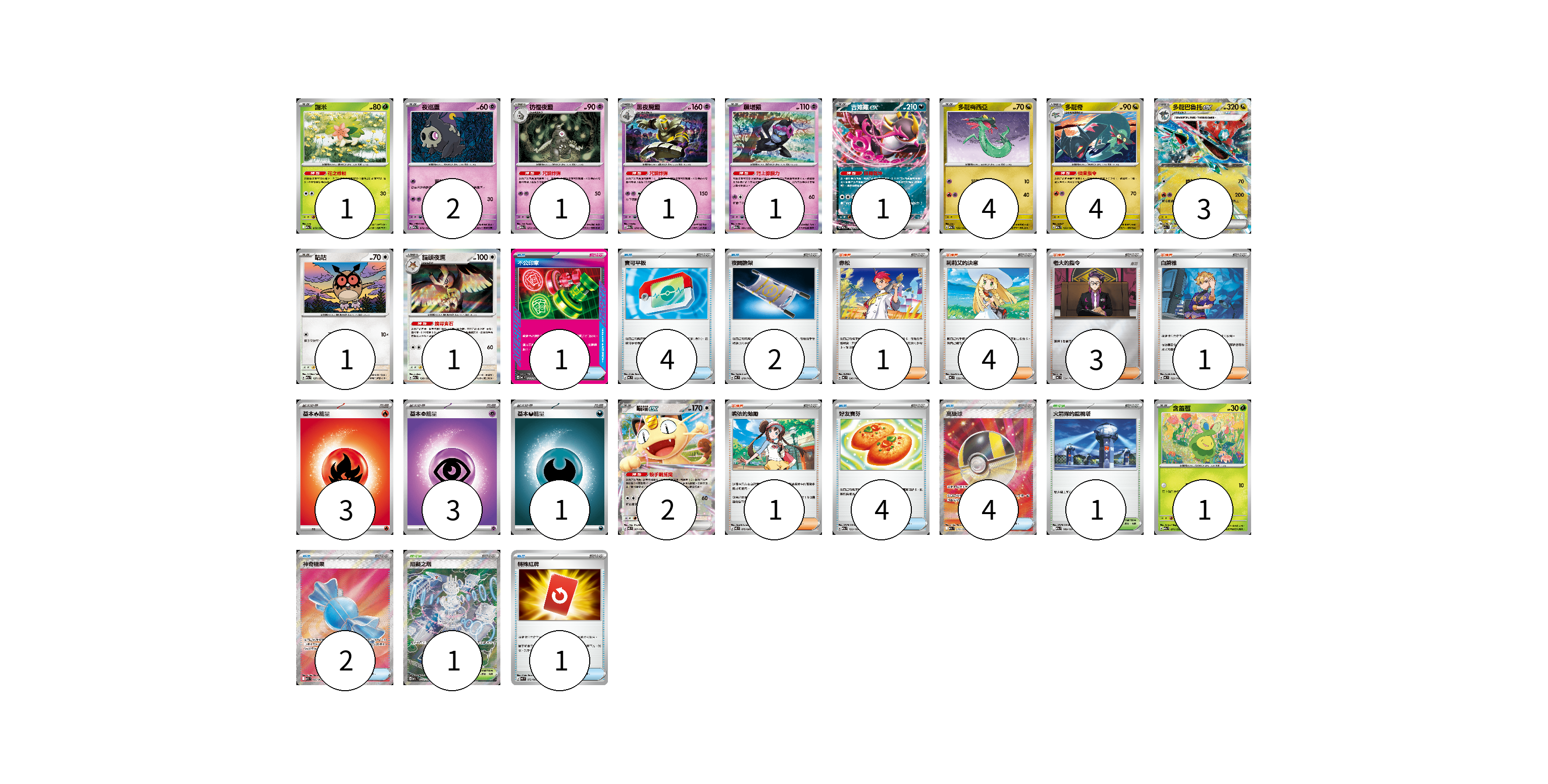 牌組構築方案 以此牌組為基礎新構築牌組 顯示卡面 顯示列表 寶可夢卡(23) 1 2 1 1 1 1 4 4 3 1 1 2 1 物品卡(18) 1 4 2 4 4 2 1 支援者卡(10) 1 4 3 1 1 競技場卡(2) 1 1 能量卡(7) 3 3 1 寶可夢卡(23) 卡牌名稱 張數 卡牌名稱 張數 謝米 M2a 012/193 01 夜巡靈 M2a 072/193 02 彷徨夜靈 M2a 073/193 01 黑夜魔靈 M2a 074/193 01 願增猿 M2a 081/193 01 吉雉雞ex M2a 114/193 01 多龍梅西亞 M2a 132/193 04 多龍奇 M2a 133/193 04 多龍巴魯托ex M2a 134/193 03 咕咕 M2a 137/193 01 貓頭夜鷹 M2a 138/193 01 喵喵ex M3 061/080 02 含羞苞 M2a 011/193 01 物品卡(18) 卡牌名稱 張數 卡牌名稱 張數 不公印章 MC 633/742 01 寶可平板 MC 662/742 04 夜間擔架 MC 670/742 02 好友寶芬 M2a 153/193 04 高級球 M2a 216/193 04 神奇糖果 M1S 082/063 02 特殊紅牌 M4 072/083 01 支援者卡(10) 卡牌名稱 張數 卡牌名稱 張數 赤松 MC 696/742 01 莉莉艾的決意 MC 729/742 04 老大的指令 MC 724/742 03 白蕾雅 MC 722/742 01 鳴依的勉勵 M3 075/080 01 競技場卡(2) 卡牌名稱 張數 卡牌名稱 張數 火箭隊的監視塔 M2a 189/193 01 阻礙之塔 M2a 222/193 01 能量卡(7) 卡牌名稱 張數 卡牌名稱 張數 基本【火】能量 MC FIR 03 基本【超】能量 MC PSY 03 基本【惡】能量 MC DAR 01 以此牌組為基礎新構築牌組 牌組編碼 LxLteb-uDeThd-jDNikb copy 列印牌組單 牌組編碼已複製 分享至SNS