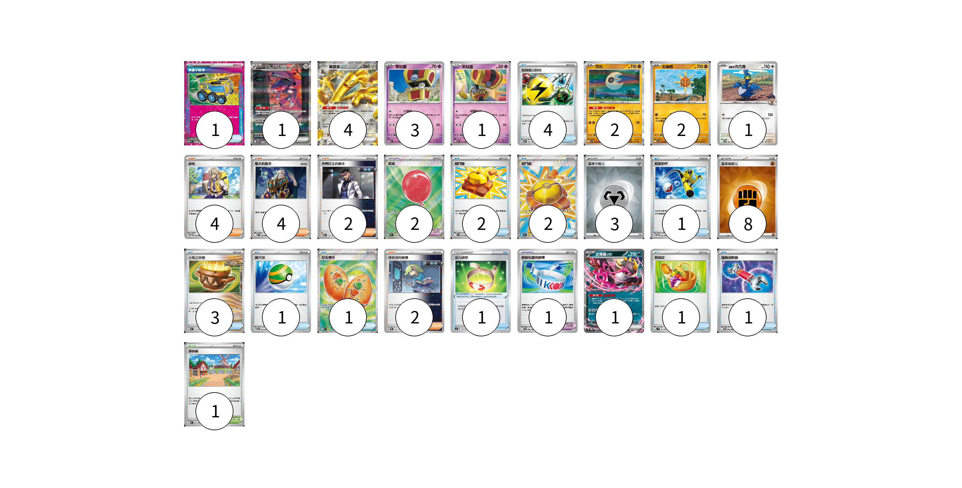 牌組構築方案 以此牌組為基礎新構築牌組 顯示卡面 顯示列表 寶可夢卡(15) 1 4 3 1 2 2 1 1 寶可夢道具(4) 2 1 1 物品卡(17) 1 4 2 2 1 3 1 1 1 1 支援者卡(12) 4 4 2 2 競技場卡(1) 1 能量卡(11) 3 8 寶可夢卡(15) 卡牌名稱 張數 卡牌名稱 張數 蓋諾賽克特ex SV11B 172/086 01 賽富豪ex SV8a 117/187 04 索財靈 SV7a 024/064 03 索財靈 SV3a 020/062 01 月石 M1L 026/063 02 太陽岩 M1L 027/063 02 赫普的古月鳥 SV9 087/100 01 吉雉雞ex SVOD 004/020 01 寶可夢道具(4) 卡牌名稱 張數 卡牌名稱 張數 氣球 M1L 084/063 02 活力頭帶 SC1a 143/154 01 赫普的講究頭帶 SV9 092/100 01 物品卡(17) 卡牌名稱 張數 卡牌名稱 張數 貴重手推車 SVK 020/042 01 超級能量回收 SV8a 141/187 04 戰鬥鑼 M1L 059/063 02 戰鬥鑼 M1L 082/063 02 厲害釣竿 SVOM 011/021 01 大地之容器 SVK 012/042 03 巢穴球 SVTR 013/021 01 好友寶芬 M1S 081/063 01 野餐籃 SV1V 071/078 01 道具拆除器 SV11W 080/086 01 支援者卡(12) 卡牌名稱 張數 卡牌名稱 張數 派帕 SVOD 018/020 04 老大的指令 MBD 020/022 04 弗圖博士的劇本 SV8a 175/187 02 暗碼迷的解讀 SV8a 165/187 02 競技場卡(1) 卡牌名稱 張數 卡牌名稱 張數 深缽鎮 SVK 039/042 01 能量卡(11) 卡牌名稱 張數 卡牌名稱 張數 基本【鋼】能量 SVOD MET 03 基本【鬥】能量 SVM FIG 08 以此牌組為基礎新構築牌組 牌組編碼 LxZIpD-gfvEXV-CXqSxV copy 列印牌組單 牌組編碼已複製 分享至SNS