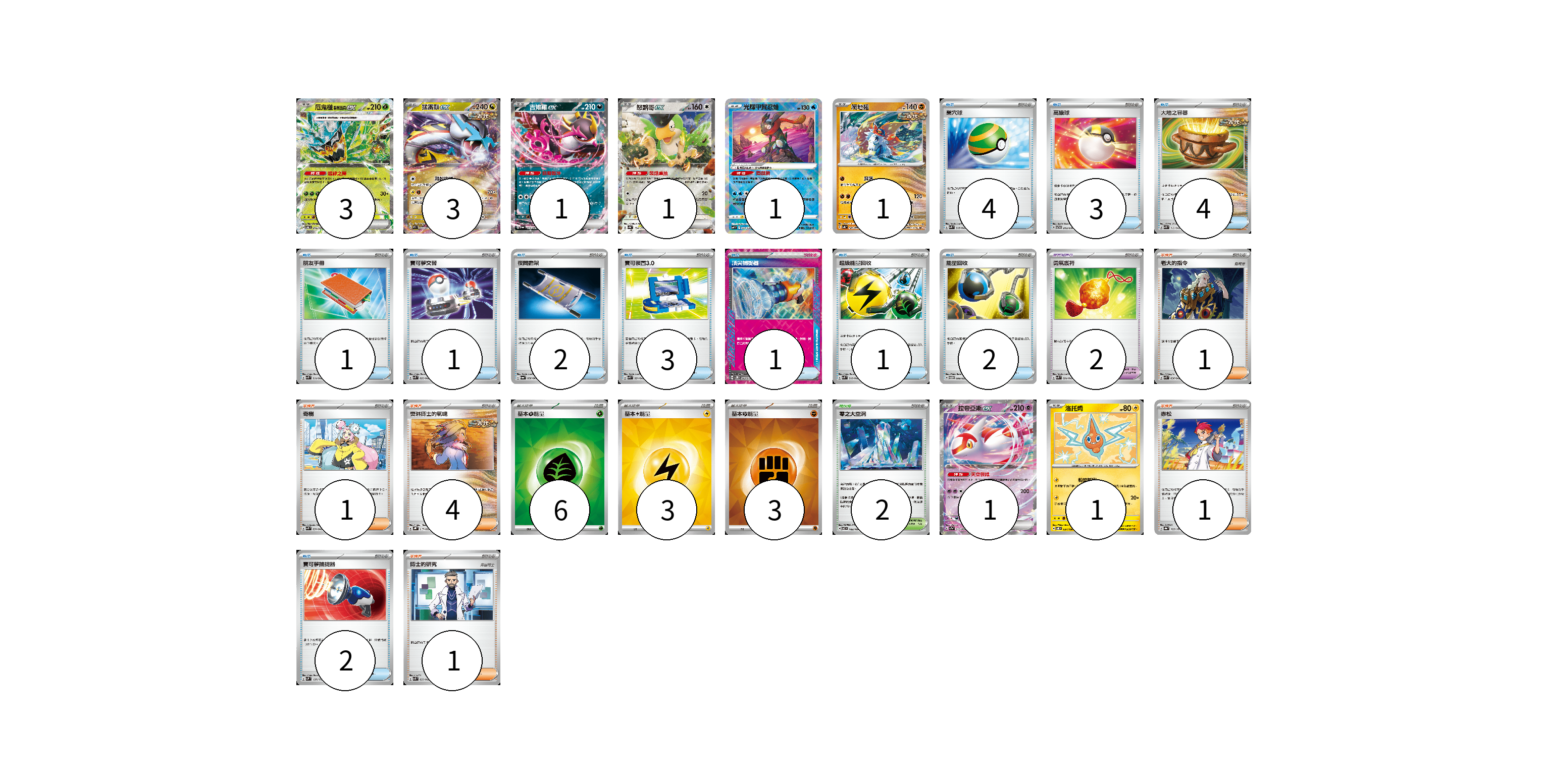 牌組構築方案 以此牌組為基礎新構築牌組 顯示卡面 顯示列表 寶可夢卡(12) 3 3 1 1 1 1 1 1 寶可夢道具(2) 2 物品卡(24) 4 3 4 1 1 2 3 1 1 2 2 支援者卡(8) 1 1 4 1 1 競技場卡(2) 2 能量卡(12) 6 3 3 寶可夢卡(12) 卡牌名稱 張數 卡牌名稱 張數 厄鬼椪 碧草面具ex SV6 016/101 03 猛雷鼓ex SV5K 053/071 03 吉雉雞ex SV6a 038/064 01 怒鸚哥ex SV4a 154/190 01 光輝甲賀忍蛙 SVF 004/038 01 爬地翅 SV4K 041/066 01 拉帝亞斯ex SV7a 019/064 01 洛托姆 SV8 037/106 01 寶可夢道具(2) 卡牌名稱 張數 卡牌名稱 張數 勇氣護符 SVK 024/042 02 物品卡(24) 卡牌名稱 張數 卡牌名稱 張數 巢穴球 SVK 016/042 04 高級球 SVTG 013/019 03 大地之容器 SVK 012/042 04 朋友手冊 SVK 014/042 01 寶可夢交替 SVK 022/042 01 夜間擔架 SV6a 056/064 02 寶可裝置3.0 SVK 021/042 03 頂尖捕捉器 SV5M 062/071 01 超級能量回收 SVK 010/042 01 能量回收 SVTM 009/022 02 寶可夢捕捉器 SVM 137/175 02 支援者卡(8) 卡牌名稱 張數 卡牌名稱 張數 老大的指令 SVK 036/042 01 奇樹 SVK 031/042 01 奧琳博士的氣魄 SVHK 017/022 04 赤松 SV8a 163/187 01 博士的研究 SVK 033/042 01 競技場卡(2) 卡牌名稱 張數 卡牌名稱 張數 零之大空洞 SV7 102/102 02 能量卡(12) 卡牌名稱 張數 卡牌名稱 張數 基本【草】能量 SVK GRA 06 基本【雷】能量 SVK LIG 03 基本【鬥】能量 SVK FIG 03 以此牌組為基礎新構築牌組 牌組編碼 MBrAVL-AoWMIq-BIXVta copy 列印牌組單 牌組編碼已複製 分享至SNS