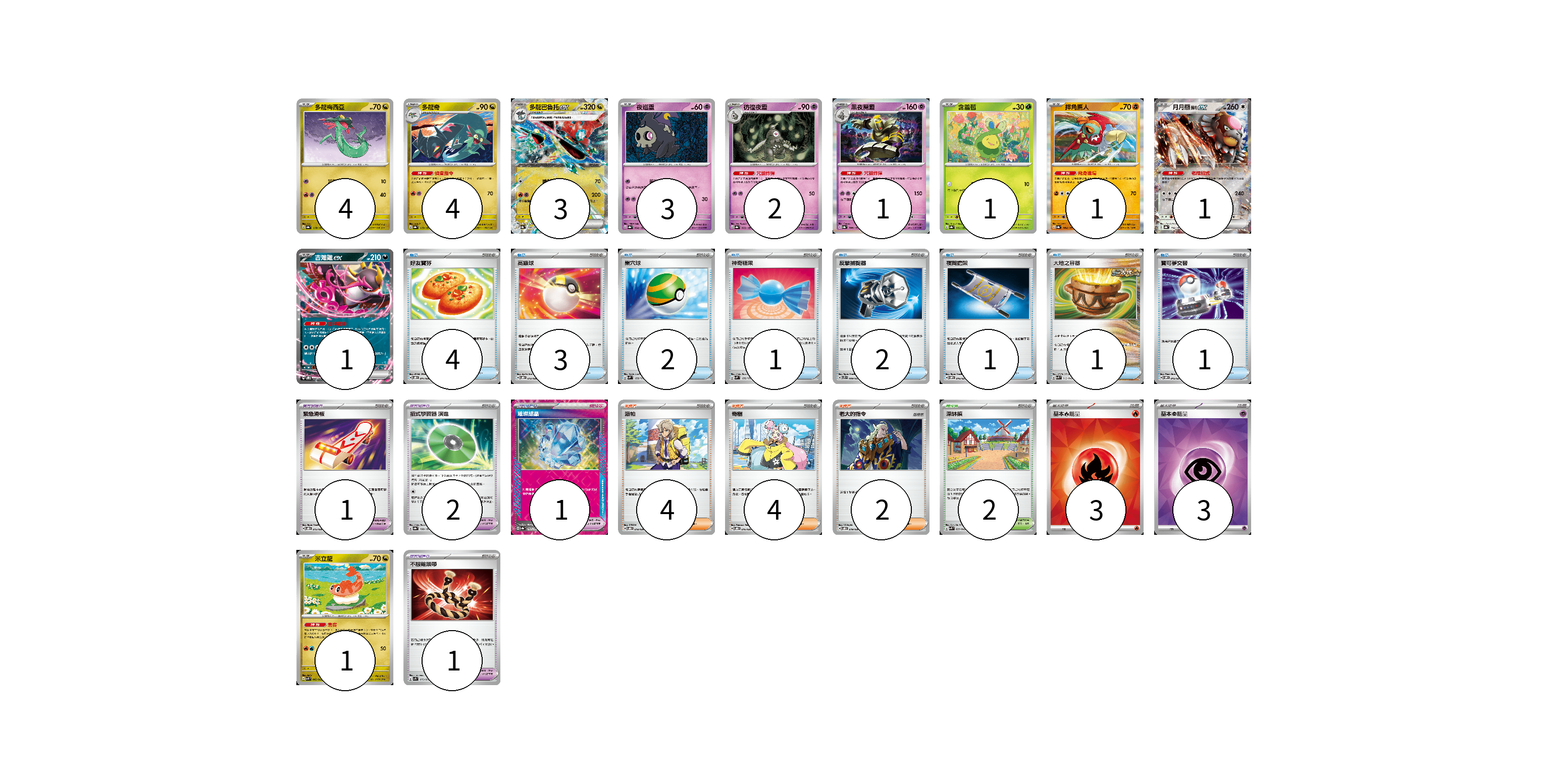 牌組構築方案 以此牌組為基礎新構築牌組 顯示卡面 顯示列表 寶可夢卡(22) 4 4 3 3 2 1 1 1 1 1 1 寶可夢道具(5) 1 2 1 1 物品卡(15) 4 3 2 1 2 1 1 1 支援者卡(10) 4 4 2 競技場卡(2) 2 能量卡(6) 3 3 寶可夢卡(22) 卡牌名稱 張數 卡牌名稱 張數 多龍梅西亞 SV8a 118/187 04 多龍奇 SV8a 119/187 04 多龍巴魯托ex SV8a 120/187 03 夜巡靈 SV8a 064/187 03 彷徨夜靈 SV8a 065/187 02 黑夜魔靈 SV8a 066/187 01 含羞苞 SV8a 001/187 01 摔角鷹人 SV8a 084/187 01 月月熊 赫月ex SV8a 134/187 01 吉雉雞ex SVOD 004/020 01 米立龍 SVK 002/042 01 寶可夢道具(5) 卡牌名稱 張數 卡牌名稱 張數 緊急滑板 SVOD 015/020 01 招式學習器 演進 SV8a 160/187 02 璀璨結晶 SV8a 152/187 01 不服輸頭帶 SV1S 073/078 01 物品卡(15) 卡牌名稱 張數 卡牌名稱 張數 好友寶芬 SVOD 011/020 04 高級球 SVOD 012/020 03 巢穴球 SVM 133/175 02 神奇糖果 SVM 135/175 01 反擊捕捉器 SVTS 009/022 02 夜間擔架 SVOM 016/021 01 大地之容器 SVK 012/042 01 寶可夢交替 SVOM 015/021 01 支援者卡(10) 卡牌名稱 張數 卡牌名稱 張數 派帕 SVOD 018/020 04 奇樹 SVOD 016/020 04 老大的指令 SVOD 019/020 02 競技場卡(2) 卡牌名稱 張數 卡牌名稱 張數 深缽鎮 SVK 039/042 02 能量卡(6) 卡牌名稱 張數 卡牌名稱 張數 基本【火】能量 SVK FIR 03 基本【超】能量 SVOD PSY 03 以此牌組為基礎新構築牌組 牌組編碼 MCEBAh-SjMaHG-roZffq copy 列印牌組單 牌組編碼已複製 分享至SNS
