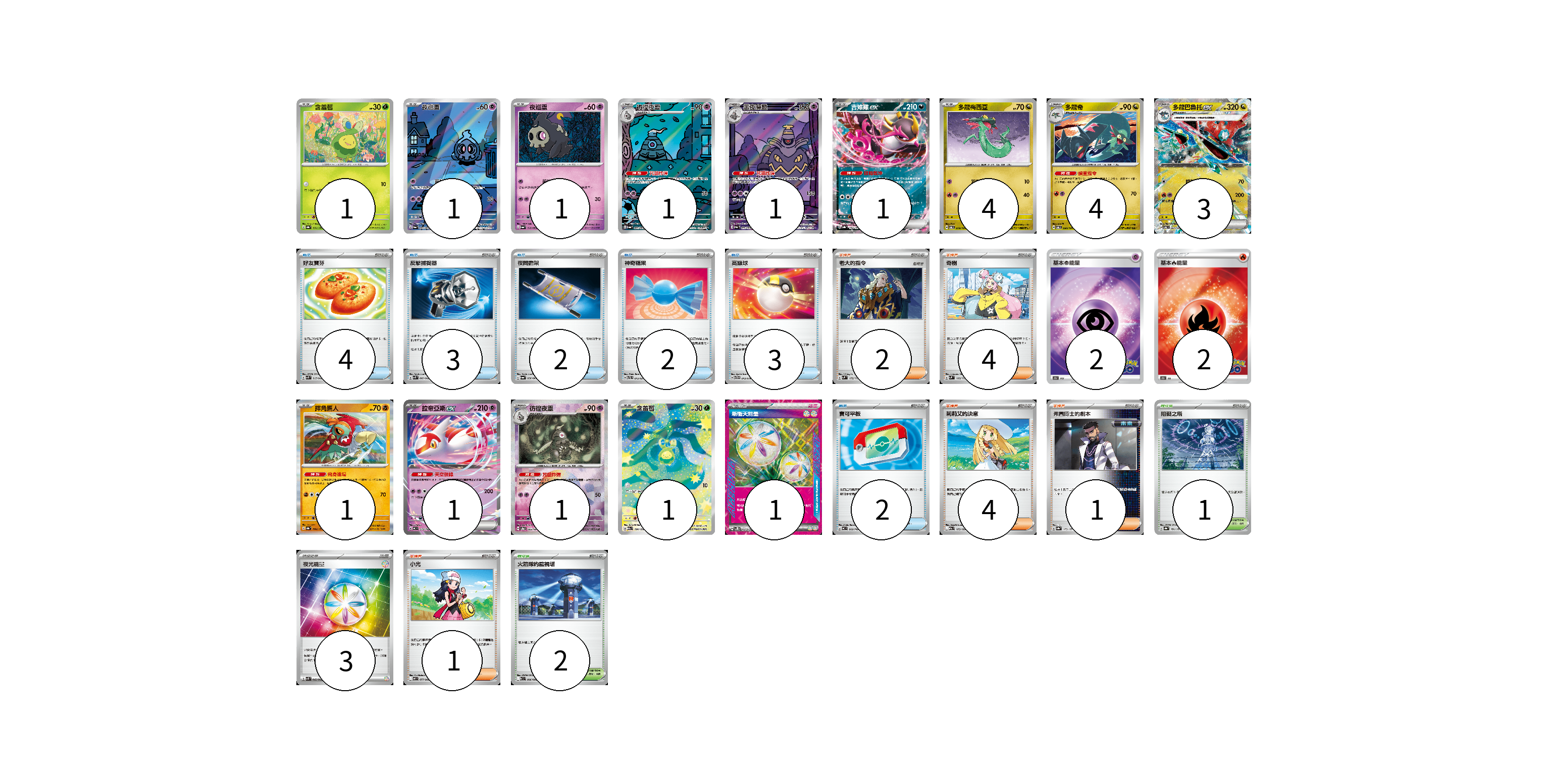 牌組構築方案 以此牌組為基礎新構築牌組 顯示卡面 顯示列表 寶可夢卡(21) 1 1 1 1 1 1 4 4 3 1 1 1 1 物品卡(16) 4 3 2 2 3 2 支援者卡(12) 2 4 4 1 1 競技場卡(3) 1 2 能量卡(8) 2 2 1 3 寶可夢卡(21) 卡牌名稱 張數 卡牌名稱 張數 含羞苞 SV8a 001/187 01 夜巡靈 SV6a 068/064 01 夜巡靈 SV6a 018/064 01 彷徨夜靈 SV6a 069/064 01 黑夜魔靈 SV6a 070/064 01 吉雉雞ex SV8a 104/187 01 多龍梅西亞 SV6 079/101 04 多龍奇 SV6 080/101 04 多龍巴魯托ex SV6 081/101 03 摔角鷹人 SV8a 084/187 01 拉帝亞斯ex MC 312/742 01 彷徨夜靈 SV8a 065/187 01 含羞苞 M2a 196/193 01 物品卡(16) 卡牌名稱 張數 卡牌名稱 張數 好友寶芬 SVK 015/042 04 反擊捕捉器 SVK 009/042 03 夜間擔架 SV6a 056/064 02 神奇糖果 SVTL 013/021 02 高級球 SVTG 013/019 03 寶可平板 MC 662/742 02 支援者卡(12) 卡牌名稱 張數 卡牌名稱 張數 老大的指令 SVM 172/175 02 奇樹 SVM 160/175 04 莉莉艾的決意 M2a 175/193 04 弗圖博士的劇本 SV8a 175/187 01 小光 M2 077/080 01 競技場卡(3) 卡牌名稱 張數 卡牌名稱 張數 阻礙之塔 SV8a 181/187 01 火箭隊的監視塔 SV10 096/098 02 能量卡(8) 卡牌名稱 張數 卡牌名稱 張數 基本超能量 S10b PSY 02 基本火能量 S10b FIR 02 新衝天能量 SV5K 071/071 01 夜光能量 SVK 042/042 03 以此牌組為基礎新構築牌組 牌組編碼 MFNBHT-IaboBx-kEhfdb copy 列印牌組單 牌組編碼已複製 分享至SNS