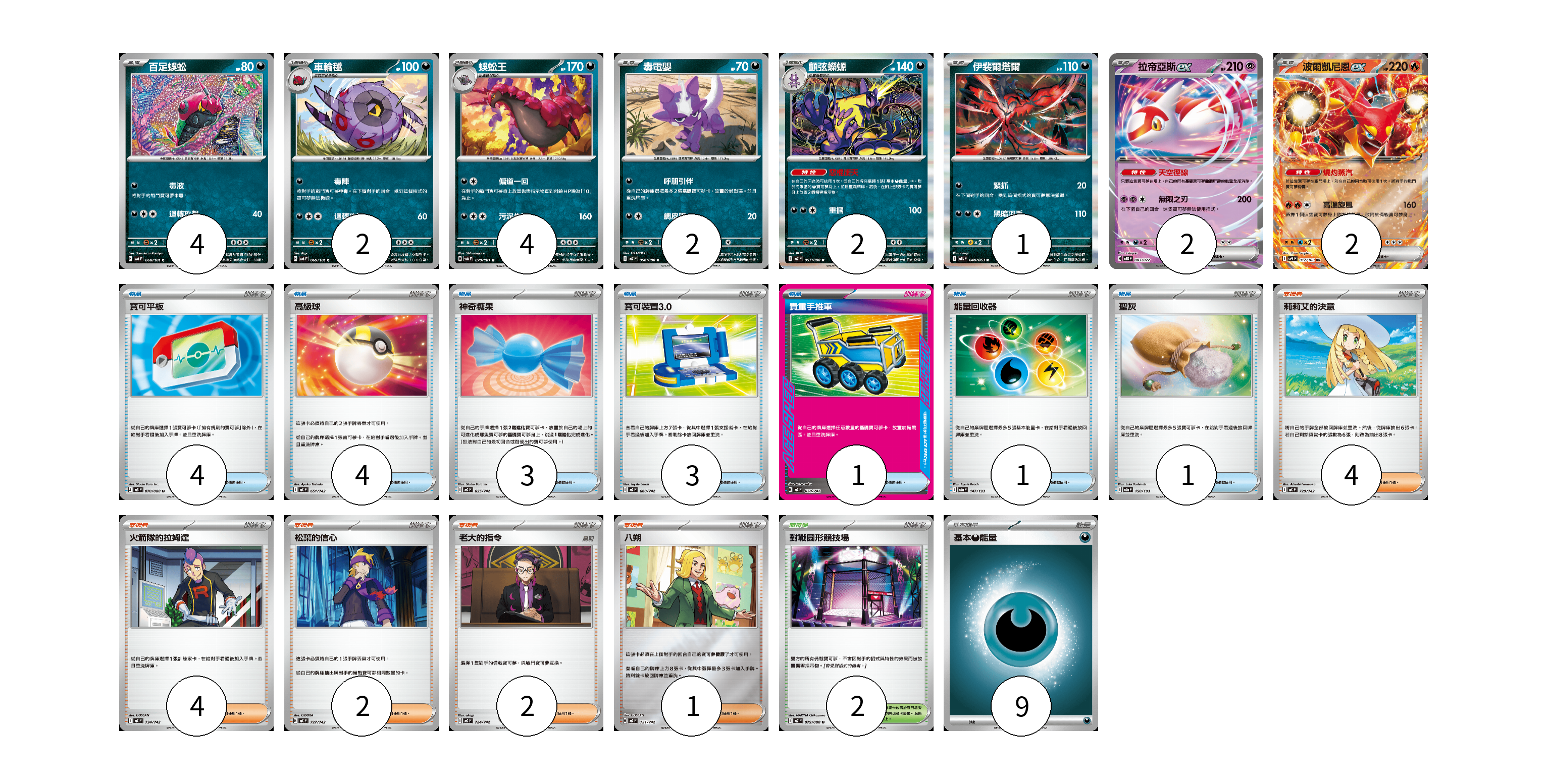 牌組構築方案 以此牌組為基礎新構築牌組 顯示卡面 顯示列表 寶可夢卡(19) 4 2 4 2 2 1 2 2 物品卡(17) 4 4 3 3 1 1 1 支援者卡(13) 4 4 2 2 1 競技場卡(2) 2 能量卡(9) 9 寶可夢卡(19) 卡牌名稱 張數 卡牌名稱 張數 百足蜈蚣 SV6 068/101 04 車輪毬 SV6 069/101 02 蜈蚣王 SV6 070/101 04 毒電嬰 M2 056/080 02 顫弦蠑螈 M2 057/080 02 伊裴爾塔爾 M1L 040/063 01 拉帝亞斯ex MBD 003/022 02 波爾凱尼恩ex SV9 017/100 02 物品卡(17) 卡牌名稱 張數 卡牌名稱 張數 寶可平板 M3 070/080 04 高級球 MC 651/742 04 神奇糖果 MC 655/742 03 寶可裝置3.0 MC 660/742 03 貴重手推車 MC 658/742 01 能量回收器 M2a 147/193 01 聖灰 M2a 150/193 01 支援者卡(13) 卡牌名稱 張數 卡牌名稱 張數 莉莉艾的決意 MC 729/742 04 火箭隊的拉姆達 MC 734/742 04 松葉的信心 MC 727/742 02 老大的指令 MC 724/742 02 八朔 MC 721/742 01 競技場卡(2) 卡牌名稱 張數 卡牌名稱 張數 對戰圓形競技場 M2 079/080 02 能量卡(9) 卡牌名稱 張數 卡牌名稱 張數 基本【惡】能量 MC DAR 09 以此牌組為基礎新構築牌組 牌組編碼 MKSaPb-sQqCBK-pFJgzL copy 列印牌組單 牌組編碼已複製 分享至SNS