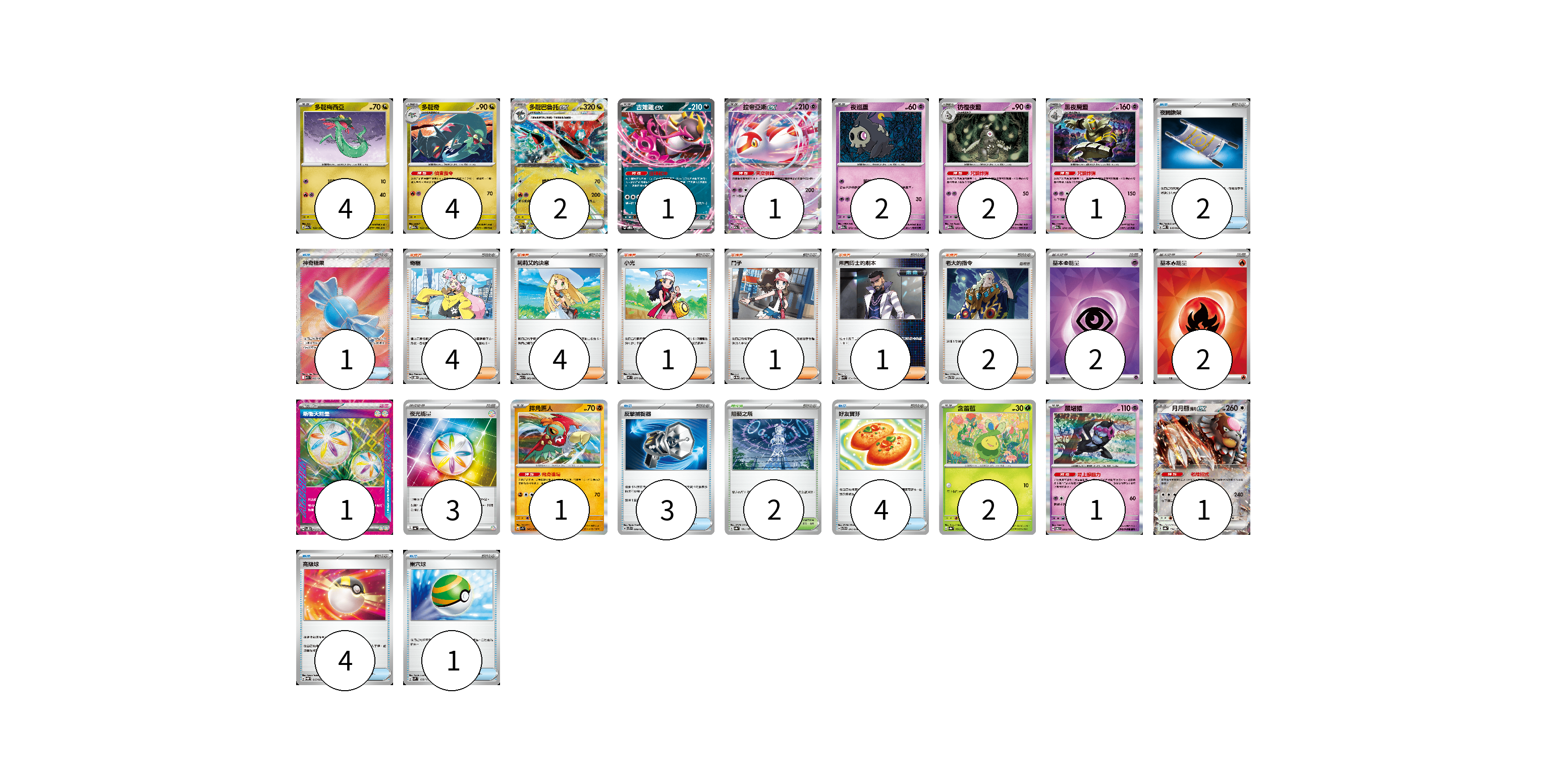 牌組構築方案 以此牌組為基礎新構築牌組 顯示卡面 顯示列表 寶可夢卡(22) 4 4 2 1 1 2 2 1 1 2 1 1 物品卡(15) 2 1 3 4 4 1 支援者卡(13) 4 4 1 1 1 2 競技場卡(2) 2 能量卡(8) 2 2 1 3 寶可夢卡(22) 卡牌名稱 張數 卡牌名稱 張數 多龍梅西亞 M2a 132/193 04 多龍奇 M2a 133/193 04 多龍巴魯托ex M2a 134/193 02 吉雉雞ex SVOD 004/020 01 拉帝亞斯ex M2a 075/193 01 夜巡靈 M2a 072/193 02 彷徨夜靈 M2a 073/193 02 黑夜魔靈 M2a 074/193 01 摔角鷹人 SV1S 045/078 01 含羞苞 SV8a 001/187 02 願增猿 SV6 055/101 01 月月熊 赫月ex SV8a 134/187 01 物品卡(15) 卡牌名稱 張數 卡牌名稱 張數 夜間擔架 MBD 016/022 02 神奇糖果 M1S 082/063 01 反擊捕捉器 SVTS 009/022 03 好友寶芬 SVTG 011/019 04 高級球 SVQP 015/023 04 巢穴球 SVM 133/175 01 支援者卡(13) 卡牌名稱 張數 卡牌名稱 張數 奇樹 SVOD 016/020 04 莉莉艾的決意 M1L 062/063 04 小光 M2 077/080 01 鬥子 SV11W 085/086 01 弗圖博士的劇本 SVK 034/042 01 老大的指令 SVTH 017/018 02 競技場卡(2) 卡牌名稱 張數 卡牌名稱 張數 阻礙之塔 SV8a 181/187 02 能量卡(8) 卡牌名稱 張數 卡牌名稱 張數 基本【超】能量 SVM PSY 02 基本【火】能量 SVK FIR 02 新衝天能量 SV5K 071/071 01 夜光能量 SV4a 190/190 03 以此牌組為基礎新構築牌組 牌組編碼 MKsQEQ-NTYfSt-fLIbro copy 列印牌組單 牌組編碼已複製 分享至SNS