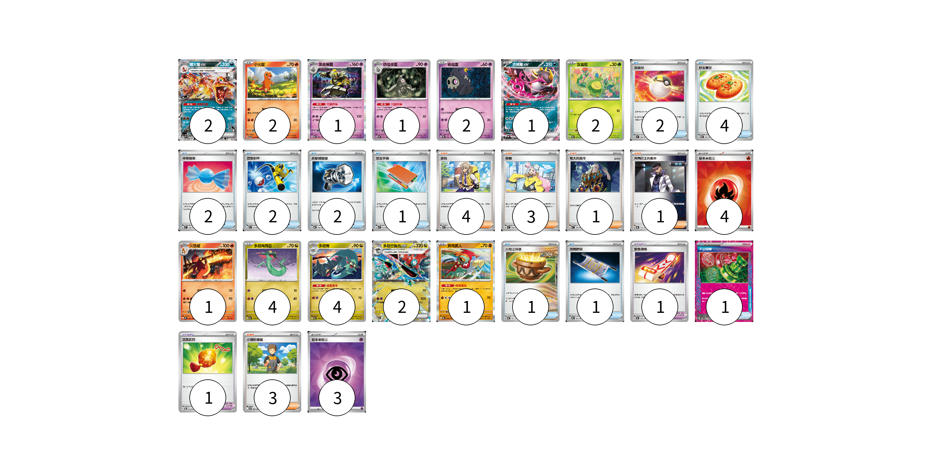 牌組構築方案 以此牌組為基礎新構築牌組 顯示卡面 顯示列表 寶可夢卡(23) 2 2 1 1 2 1 2 1 4 4 2 1 寶可夢道具(2) 1 1 物品卡(16) 2 4 2 2 2 1 1 1 1 支援者卡(12) 4 3 1 1 3 能量卡(7) 4 3 寶可夢卡(23) 卡牌名稱 張數 卡牌名稱 張數 噴火龍ex SV4a 115/190 02 小火龍 SVTL 001/021 02 黑夜魔靈 SV8a 066/187 01 彷徨夜靈 SV8a 065/187 01 夜巡靈 SV8a 064/187 02 吉雉雞ex SV8a 104/187 01 含羞苞 SV8a 001/187 02 火恐龍 SV2a 005/165 01 多龍梅西亞 SV8a 118/187 04 多龍奇 SV8a 119/187 04 多龍巴魯托ex SV8a 120/187 02 摔角鷹人 SV8a 084/187 01 寶可夢道具(2) 卡牌名稱 張數 卡牌名稱 張數 緊急滑板 SV8a 153/187 01 勇氣護符 SVEM 016/020 01 物品卡(16) 卡牌名稱 張數 卡牌名稱 張數 高級球 SVM 134/175 02 好友寶芬 SV8a 147/187 04 神奇糖果 SVM 135/175 02 厲害釣竿 SVK 011/042 02 反擊捕捉器 SV8a 139/187 02 朋友手冊 SVK 014/042 01 大地之容器 SV8a 143/187 01 夜間擔架 SV8a 151/187 01 不公印章 SV5a 053/066 01 支援者卡(12) 卡牌名稱 張數 卡牌名稱 張數 派帕 SVK 035/042 04 奇樹 SVM 160/175 03 老大的指令 SVM 172/175 01 弗圖博士的劇本 SV8a 175/187 01 小剛的發掘 SV9 096/100 03 能量卡(7) 卡牌名稱 張數 卡牌名稱 張數 基本【火】能量 SVK FIR 04 基本【超】能量 SVK PSY 03 以此牌組為基礎新構築牌組 牌組編碼 MOaXWS-mWVaid-alufzy copy 列印牌組單 牌組編碼已複製 分享至SNS