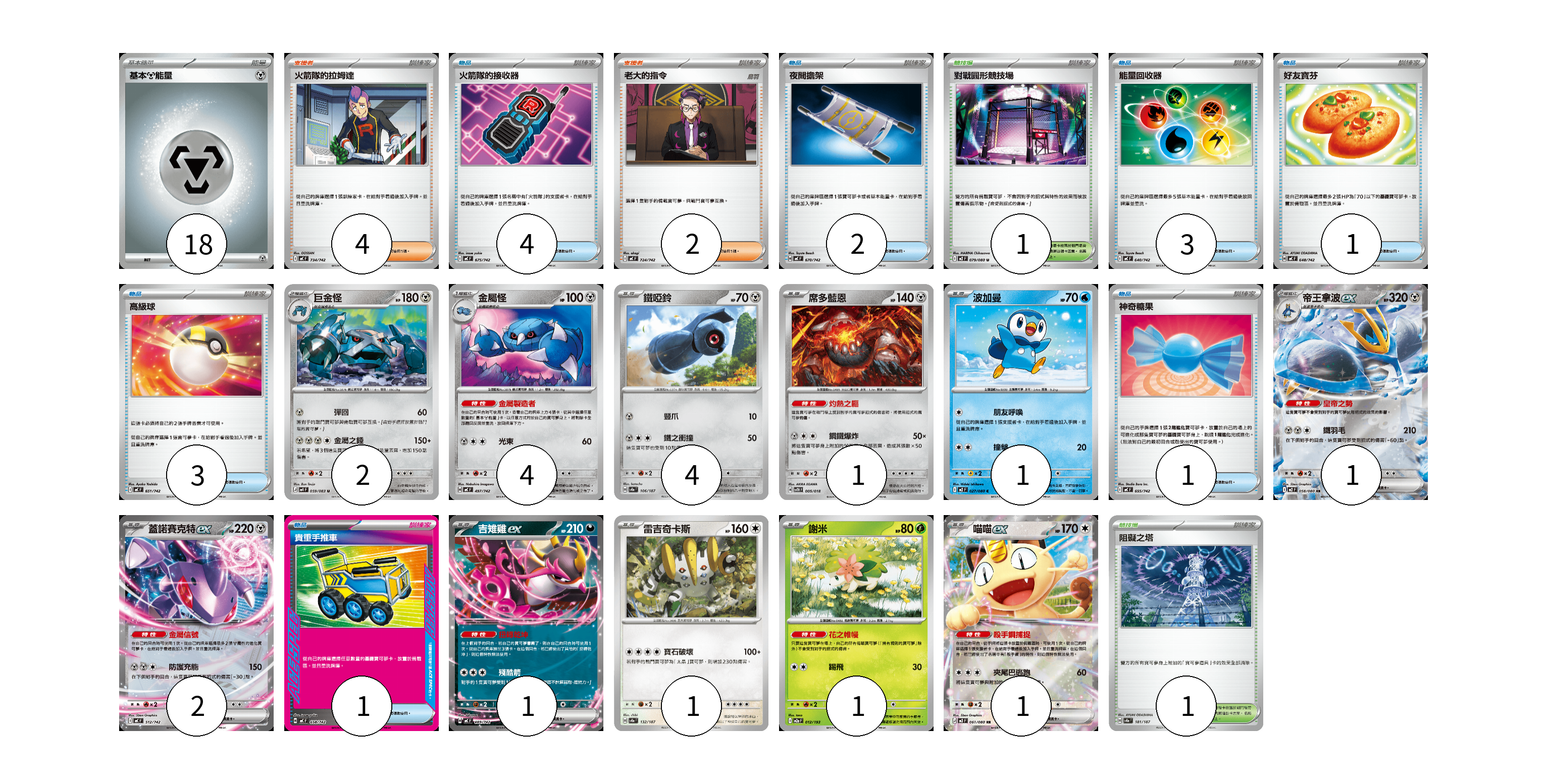 牌組構築方案 以此牌組為基礎新構築牌組 顯示卡面 顯示列表 寶可夢卡(19) 2 4 4 1 1 1 2 1 1 1 1 物品卡(15) 4 2 3 1 3 1 1 支援者卡(6) 4 2 競技場卡(2) 1 1 能量卡(18) 18 寶可夢卡(19) 卡牌名稱 張數 卡牌名稱 張數 巨金怪 M4 059/083 02 金屬怪 MC 497/742 04 鐵啞鈴 SV8a 106/187 04 席多藍恩 SVTH 005/018 01 波加曼 M2 027/080 01 帝王拿波ex M2 058/080 01 蓋諾賽克特ex MC 512/742 02 吉雉雞ex MC 489/742 01 雷吉奇卡斯 SV8a 132/187 01 謝米 M2a 012/193 01 喵喵ex M3 061/080 01 物品卡(15) 卡牌名稱 張數 卡牌名稱 張數 火箭隊的接收器 MC 675/742 04 夜間擔架 MC 670/742 02 能量回收器 MC 640/742 03 好友寶芬 MC 648/742 01 高級球 MC 651/742 03 神奇糖果 MC 655/742 01 貴重手推車 MC 658/742 01 支援者卡(6) 卡牌名稱 張數 卡牌名稱 張數 火箭隊的拉姆達 MC 734/742 04 老大的指令 MC 724/742 02 競技場卡(2) 卡牌名稱 張數 卡牌名稱 張數 對戰圓形競技場 M2 079/080 01 阻礙之塔 SV8a 181/187 01 能量卡(18) 卡牌名稱 張數 卡牌名稱 張數 基本【鋼】能量 MC MET 18 以此牌組為基礎新構築牌組 牌組編碼 MRHbxC-mkMDqc-TWbcSP copy 列印牌組單 牌組編碼已複製 分享至SNS