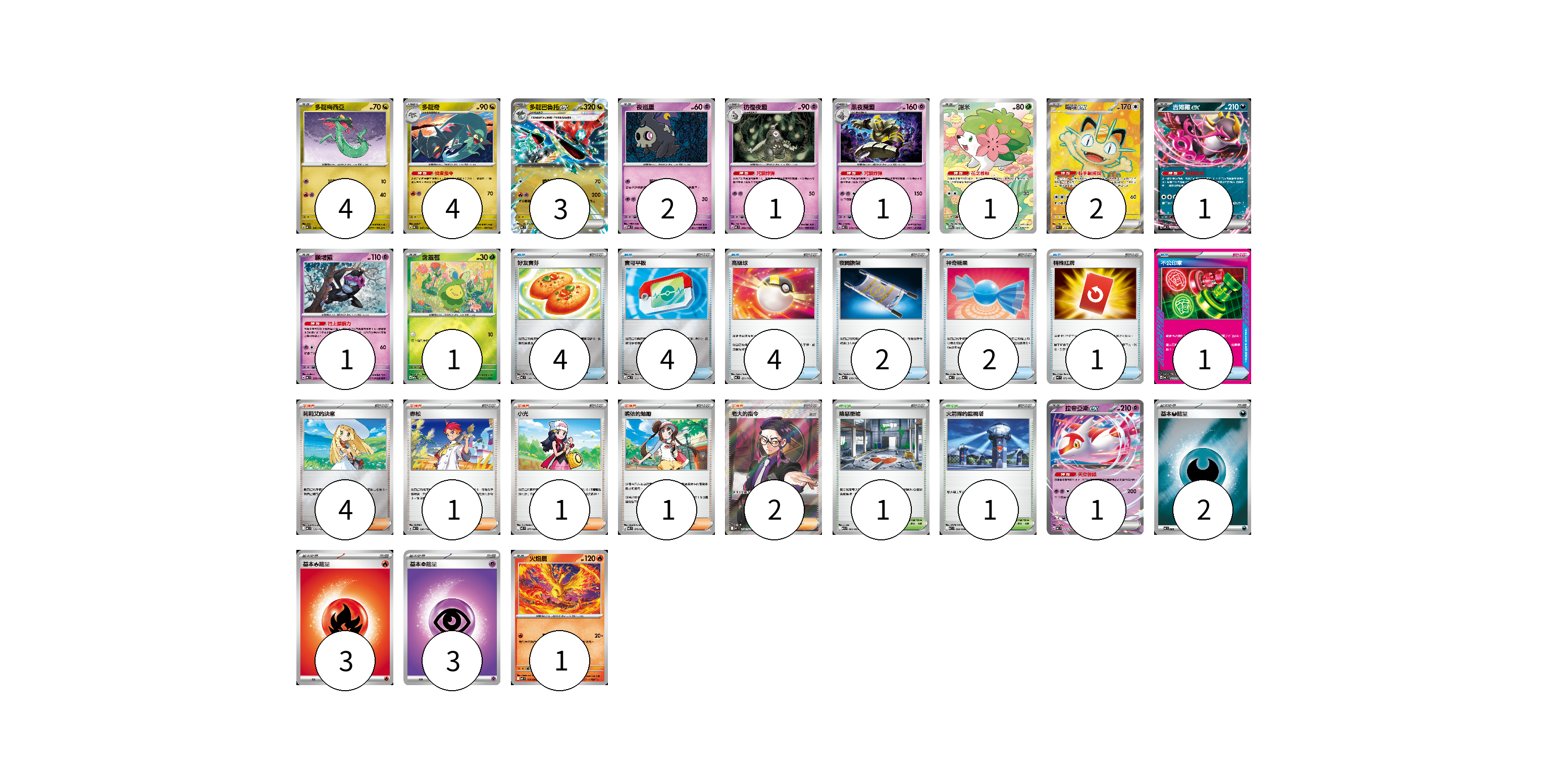 牌組構築方案 以此牌組為基礎新構築牌組 顯示卡面 顯示列表 寶可夢卡(23) 4 4 3 2 1 1 1 2 1 1 1 1 1 物品卡(18) 4 4 4 2 2 1 1 支援者卡(9) 4 1 1 1 2 競技場卡(2) 1 1 能量卡(8) 2 3 3 寶可夢卡(23) 卡牌名稱 張數 卡牌名稱 張數 多龍梅西亞 MC 546/742 04 多龍奇 MC 547/742 04 多龍巴魯托ex MC 548/742 03 夜巡靈 MC 308/742 02 彷徨夜靈 MC 309/742 01 黑夜魔靈 MC 310/742 01 謝米 SV9a 066/063 01 喵喵ex M3 100/080 02 吉雉雞ex MC 489/742 01 願增猿 MC 358/742 01 含羞苞 M2a 011/193 01 拉帝亞斯ex MC 312/742 01 火焰鳥 M2 014/080 01 物品卡(18) 卡牌名稱 張數 卡牌名稱 張數 好友寶芬 MC 648/742 04 寶可平板 MC 662/742 04 高級球 MC 651/742 04 夜間擔架 MC 670/742 02 神奇糖果 MC 655/742 02 特殊紅牌 M4 072/083 01 不公印章 MC 633/742 01 支援者卡(9) 卡牌名稱 張數 卡牌名稱 張數 莉莉艾的決意 MC 729/742 04 赤松 MC 696/742 01 小光 M2 077/080 01 鳴依的勉勵 M3 075/080 01 老大的指令(烏羽) MC 760/742 02 競技場卡(2) 卡牌名稱 張數 卡牌名稱 張數 險惡廢墟 M1L 063/063 01 火箭隊的監視塔 SV10 096/098 01 能量卡(8) 卡牌名稱 張數 卡牌名稱 張數 基本【惡】能量 MC DAR 02 基本【火】能量 MC FIR 03 基本【超】能量 M-P PSY 03 以此牌組為基礎新構築牌組 牌組編碼 MUZGFs-xjSsTW-TipuZx copy 列印牌組單 牌組編碼已複製 分享至SNS