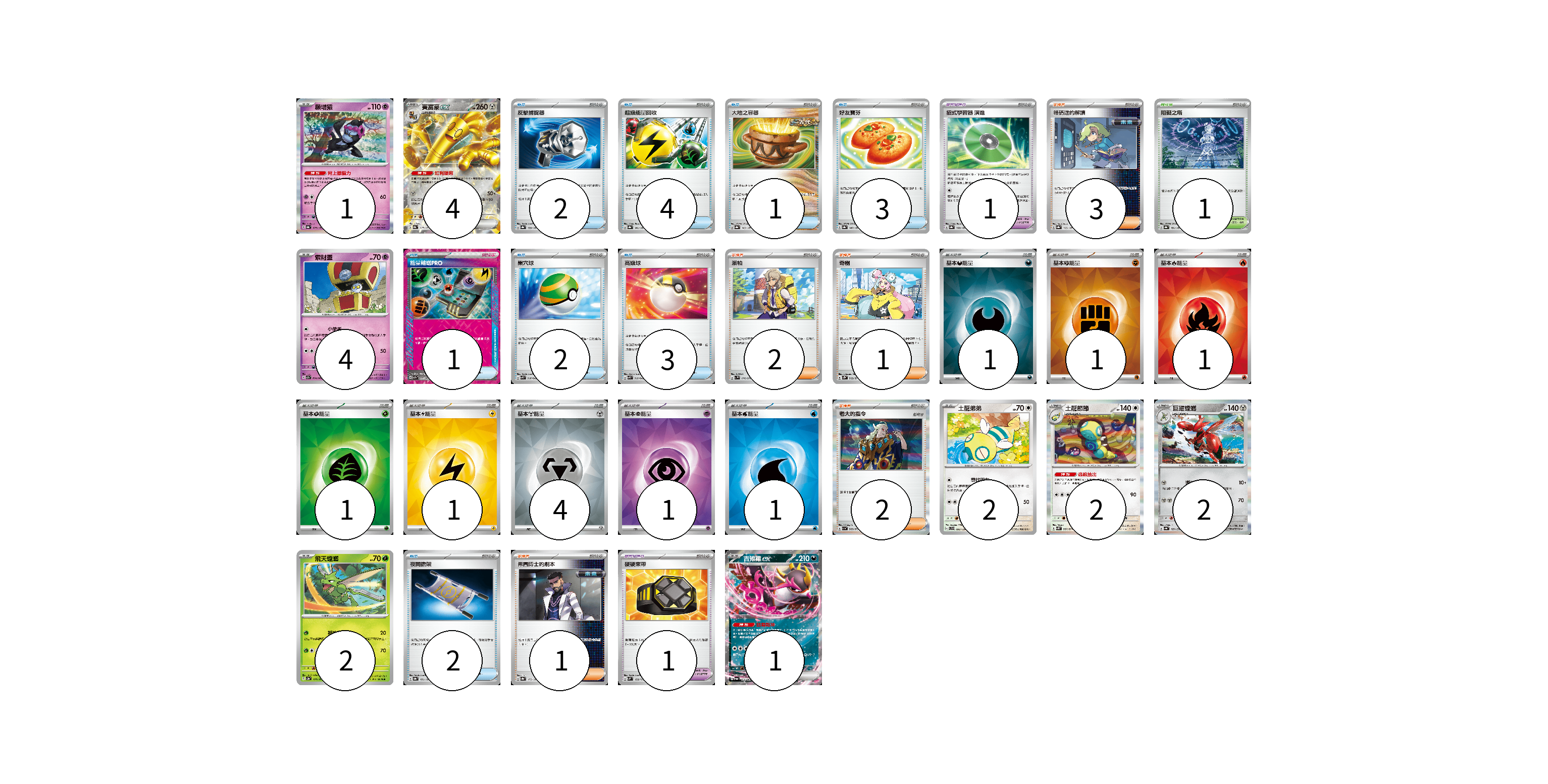 牌組構築方案 以此牌組為基礎新構築牌組 顯示卡面 顯示列表 寶可夢卡(18) 1 4 4 2 2 2 2 1 寶可夢道具(2) 1 1 物品卡(18) 2 4 1 3 1 2 3 2 支援者卡(9) 3 2 1 2 1 競技場卡(1) 1 能量卡(11) 1 1 1 1 1 4 1 1 寶可夢卡(18) 卡牌名稱 張數 卡牌名稱 張數 願增猿 SV8a 075/187 01 賽富豪ex SV8a 117/187 04 索財靈 SV7a 024/064 04 土龍弟弟 SVD 092/139 02 土龍節節 SV5K 057/071 02 巨鉗螳螂 SV4a 129/190 02 飛天螳螂 SV2a 123/165 02 吉雉雞ex SV6a 038/064 01 寶可夢道具(2) 卡牌名稱 張數 卡牌名稱 張數 招式學習器 演進 SV8a 160/187 01 硬硬束帶 SVM 139/175 01 物品卡(18) 卡牌名稱 張數 卡牌名稱 張數 反擊捕捉器 SV8a 139/187 02 超級能量回收 SV8a 141/187 04 大地之容器 SV8a 143/187 01 好友寶芬 SV8a 147/187 03 能量輸送PRO SV7a 052/064 01 巢穴球 SVK 016/042 02 高級球 SVK 018/042 03 夜間擔架 SV8a 151/187 02 支援者卡(9) 卡牌名稱 張數 卡牌名稱 張數 暗碼迷的解讀 SV8a 165/187 03 派帕 SV1V 076/078 02 奇樹 SV2D 069/071 01 老大的指令 SV1a 069/073 02 弗圖博士的劇本 SV8a 175/187 01 競技場卡(1) 卡牌名稱 張數 卡牌名稱 張數 阻礙之塔 SV8a 181/187 01 能量卡(11) 卡牌名稱 張數 卡牌名稱 張數 基本【惡】能量 SVK DAR 01 基本【鬥】能量 SVK FIG 01 基本【火】能量 SVK FIR 01 基本【草】能量 SVK GRA 01 基本【雷】能量 SVK LIG 01 基本【鋼】能量 SVK MET 04 基本【超】能量 SVK PSY 01 基本【水】能量 SVK WAT 01 以此牌組為基礎新構築牌組 牌組編碼 MXWspQ-lwWgCg-YGvrKm copy 列印牌組單 牌組編碼已複製 分享至SNS
