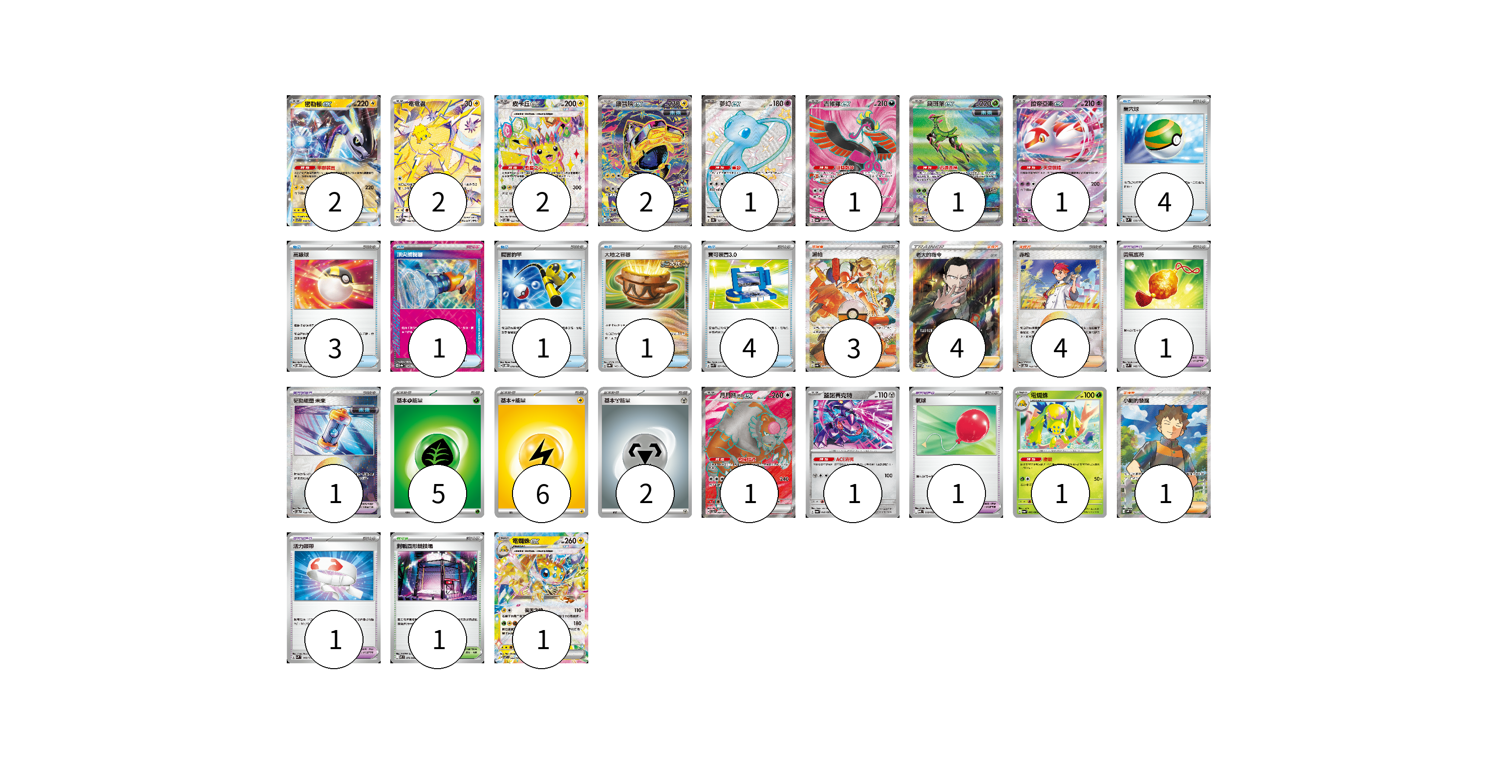 牌組構築方案 以此牌組為基礎新構築牌組 顯示卡面 顯示列表 寶可夢卡(16) 2 2 2 2 1 1 1 1 1 1 1 1 寶可夢道具(3) 1 1 1 物品卡(15) 4 3 1 1 1 4 1 支援者卡(12) 3 4 4 1 競技場卡(1) 1 能量卡(13) 5 6 2 寶可夢卡(16) 卡牌名稱 張數 卡牌名稱 張數 密勒頓ex SVTR 008/021 02 電電蟲 SV7 108/102 02 皮卡丘ex SV8 122/106 02 鐵臂膀ex SV8a 210/187 02 夢幻ex SV4a 327/190 01 吉雉雞ex SV6a 081/064 01 鐵斑葉ex SV5M 093/071 01 拉帝亞斯ex SV7a 019/064 01 月月熊 赫月 ex SV5a 084/066 01 蓋諾賽克特 SV6a 040/064 01 電蜘蛛 SV6a 002/064 01 電蜘蛛ex SV7 033/102 01 寶可夢道具(3) 卡牌名稱 張數 卡牌名稱 張數 勇氣護符 SVM 142/175 01 驅勁能量 未來 SV8a 158/187 01 活力頭帶 SVM 140/175 01 物品卡(15) 卡牌名稱 張數 卡牌名稱 張數 巢穴球 SVM 133/175 04 高級球 SVOD 012/020 03 頂尖捕捉器 SV8a 148/187 01 厲害釣竿 SVOD 010/020 01 大地之容器 SV8a 143/187 01 寶可裝置3.0 SVK 021/042 04 氣球 MBD 018/022 01 支援者卡(12) 卡牌名稱 張數 卡牌名稱 張數 派帕 SV4a 353/190 03 老大的指令(坂木) SC1b 170/153 04 赤松 SV8a 163/187 04 小剛的發掘 SV9 123/100 01 競技場卡(1) 卡牌名稱 張數 卡牌名稱 張數 對戰圓形競技場 M2 079/080 01 能量卡(13) 卡牌名稱 張數 卡牌名稱 張數 基本【草】能量 SVF GRA 05 基本【雷】能量 SVF LIG 06 基本【鋼】能量 SVF MET 02 以此牌組為基礎新構築牌組 牌組編碼 MbXxHq-fJHGvx-EGwPvM copy 列印牌組單 牌組編碼已複製 分享至SNS