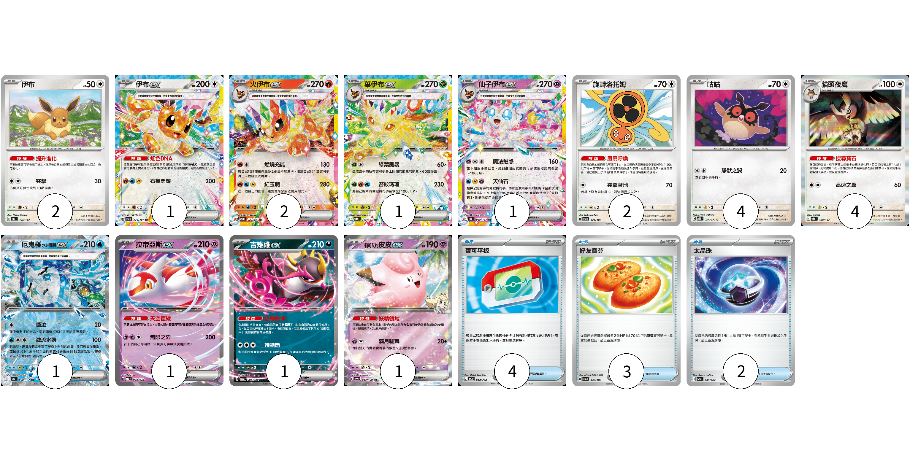 牌組構築方案 以此牌組為基礎新構築牌組 顯示卡面 顯示列表 寶可夢卡(21) 2 1 2 1 1 2 4 4 1 1 1 1 物品卡(9) 4 3 2 寶可夢卡(21) 卡牌名稱 張數 卡牌名稱 張數 伊布 SV8a 125/187 02 伊布ex SV8a 126/187 01 火伊布ex SV8a 022/187 02 葉伊布ex SV8a 003/187 01 仙子伊布ex SV8a 069/187 01 旋轉洛托姆 SV8a 131/187 02 咕咕 SV5K 054/071 04 貓頭夜鷹 SV8a 128/187 04 厄鬼椪 水井面具ex SV8a 050/187 01 拉帝亞斯ex MBD 003/022 01 吉雉雞ex SVOD 004/020 01 莉莉艾的皮皮ex SV9 033/100 01 物品卡(9) 卡牌名稱 張數 卡牌名稱 張數 寶可平板 MC 662/742 04 好友寶芬 SV8a 147/187 03 太晶珠 SV8a 145/187 02 以此牌組為基礎新構築牌組 牌組編碼 MbgTZS-nwRTJI-gyadWH copy 列印牌組單 牌組編碼已複製 分享至SNS