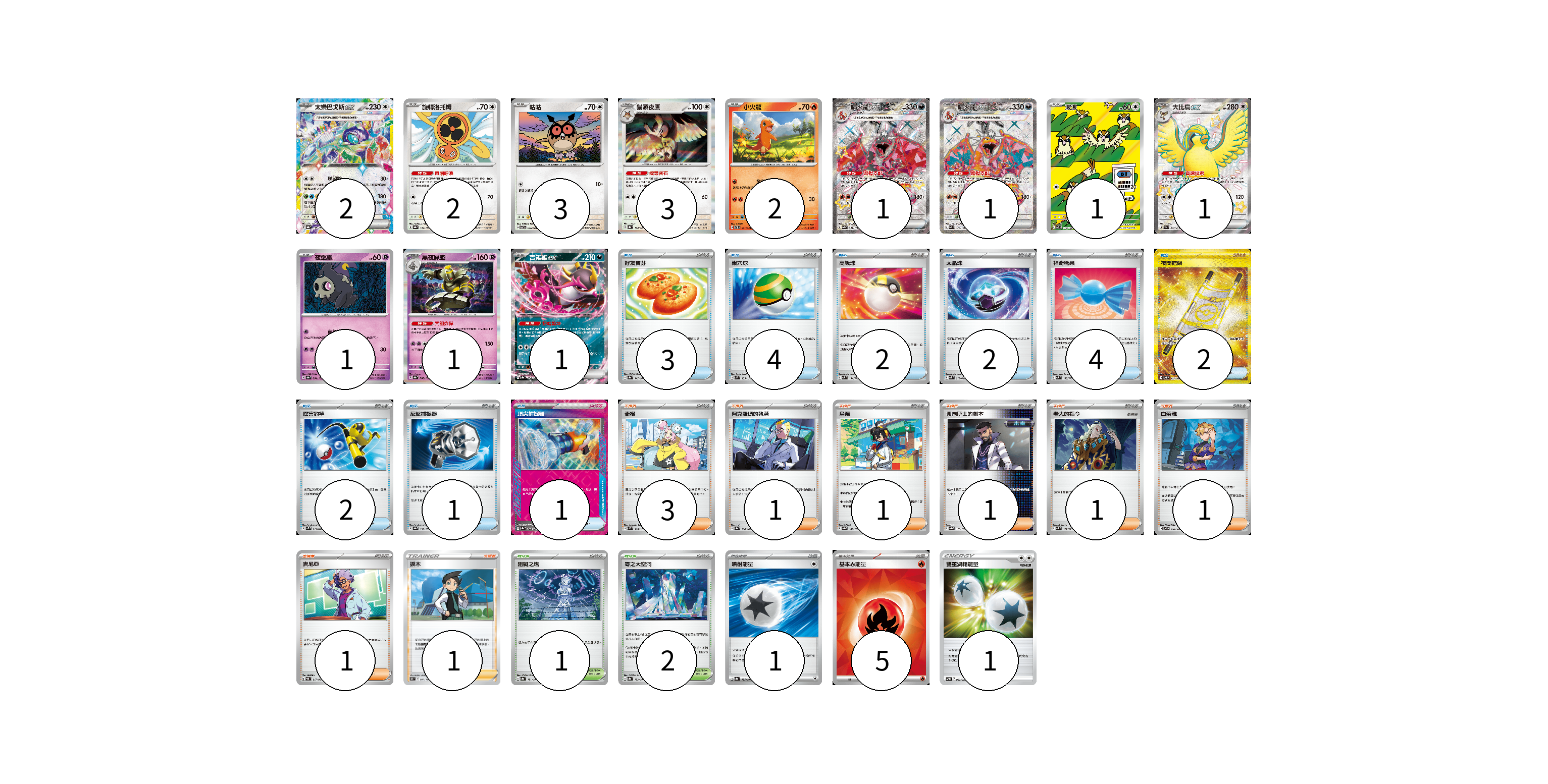 牌組構築方案 以此牌組為基礎新構築牌組 顯示卡面 顯示列表 寶可夢卡(19) 2 2 3 3 2 1 1 1 1 1 1 1 物品卡(21) 3 4 2 2 4 2 2 1 1 支援者卡(10) 3 1 1 1 1 1 1 1 競技場卡(3) 1 2 能量卡(7) 1 5 1 寶可夢卡(19) 卡牌名稱 張數 卡牌名稱 張數 太樂巴戈斯ex SV8a 136/187 02 旋轉洛托姆 SV8a 131/187 02 咕咕 SV7 076/102 03 貓頭夜鷹 SV8a 128/187 03 小火龍 SVTL 001/021 02 噴火龍ex SV4a 331/190 01 噴火龍ex SV3 125/108 01 波波 SV3 118/108 01 大比鳥ex SV4a 335/190 01 夜巡靈 SV8a 064/187 01 黑夜魔靈 SV8a 066/187 01 吉雉雞ex SV8a 104/187 01 物品卡(21) 卡牌名稱 張數 卡牌名稱 張數 好友寶芬 SV8a 147/187 03 巢穴球 SVM 133/175 04 高級球 SVM 134/175 02 太晶珠 SVK 013/042 02 神奇糖果 SVM 135/175 04 夜間擔架 SV8 137/106 02 厲害釣竿 SVK 011/042 02 反擊捕捉器 SV8a 139/187 01 頂尖捕捉器 SV8a 148/187 01 支援者卡(10) 卡牌名稱 張數 卡牌名稱 張數 奇樹 SVM 160/175 03 阿克羅瑪的執著 SV8a 164/187 01 烏栗 SV8a 169/187 01 弗圖博士的劇本 SV8a 175/187 01 老大的指令 SVM 172/175 01 白蕾雅 SV7 100/102 01 吉尼亞 SVAL 017/021 01 捩木 S11 097/100 01 競技場卡(3) 卡牌名稱 張數 卡牌名稱 張數 阻礙之塔 SV8a 181/187 01 零之大空洞 SV8a 182/187 02 能量卡(7) 卡牌名稱 張數 卡牌名稱 張數 噴射能量 SV8a 185/187 01 基本【火】能量 SVK FIR 05 雙重渦輪能量 SVTM 022/022 01 以此牌組為基礎新構築牌組 牌組編碼 McYLvR-zUvSHj-tTOOTx copy 列印牌組單 牌組編碼已複製 分享至SNS