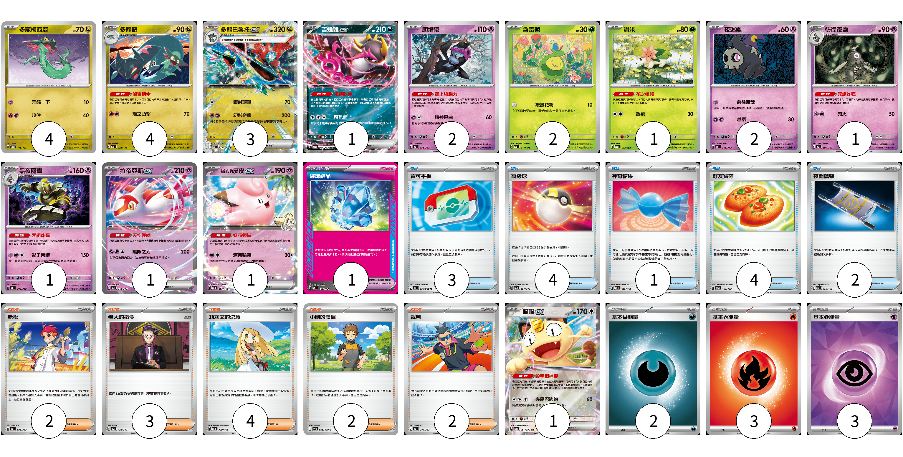 牌組構築方案 以此牌組為基礎新構築牌組 顯示卡面 顯示列表 寶可夢卡(24) 4 4 3 1 2 2 1 2 1 1 1 1 1 寶可夢道具(1) 1 物品卡(14) 3 4 1 4 2 支援者卡(13) 2 3 4 2 2 能量卡(8) 2 3 3 寶可夢卡(24) 卡牌名稱 張數 卡牌名稱 張數 多龍梅西亞 SV8a 118/187 04 多龍奇 M2a 133/193 04 多龍巴魯托ex M2a 134/193 03 吉雉雞ex M2a 114/193 01 願增猿 MC 358/742 02 含羞苞 M2a 011/193 02 謝米 M2a 012/193 01 夜巡靈 MC 308/742 02 彷徨夜靈 MC 309/742 01 黑夜魔靈 MC 310/742 01 拉帝亞斯ex MC 312/742 01 莉莉艾的皮皮ex MC 287/742 01 喵喵ex M3 061/080 01 寶可夢道具(1) 卡牌名稱 張數 卡牌名稱 張數 璀璨結晶 MC 680/742 01 物品卡(14) 卡牌名稱 張數 卡牌名稱 張數 寶可平板 M3 070/080 03 高級球 MC 651/742 04 神奇糖果 MC 655/742 01 好友寶芬 M2a 153/193 04 夜間擔架 M2a 159/193 02 支援者卡(13) 卡牌名稱 張數 卡牌名稱 張數 赤松 MC 696/742 02 老大的指令 MC 724/742 03 莉莉艾的決意 MC 729/742 04 小剛的發掘 SV9 096/100 02 裁判 MC 711/742 02 能量卡(8) 卡牌名稱 張數 卡牌名稱 張數 基本【惡】能量 MC DAR 02 基本【火】能量 MC FIR 03 基本【超】能量 SVOD PSY 03 以此牌組為基礎新構築牌組 牌組編碼 MdPApM-pPRXOE-jYwIKK copy 列印牌組單 牌組編碼已複製 分享至SNS