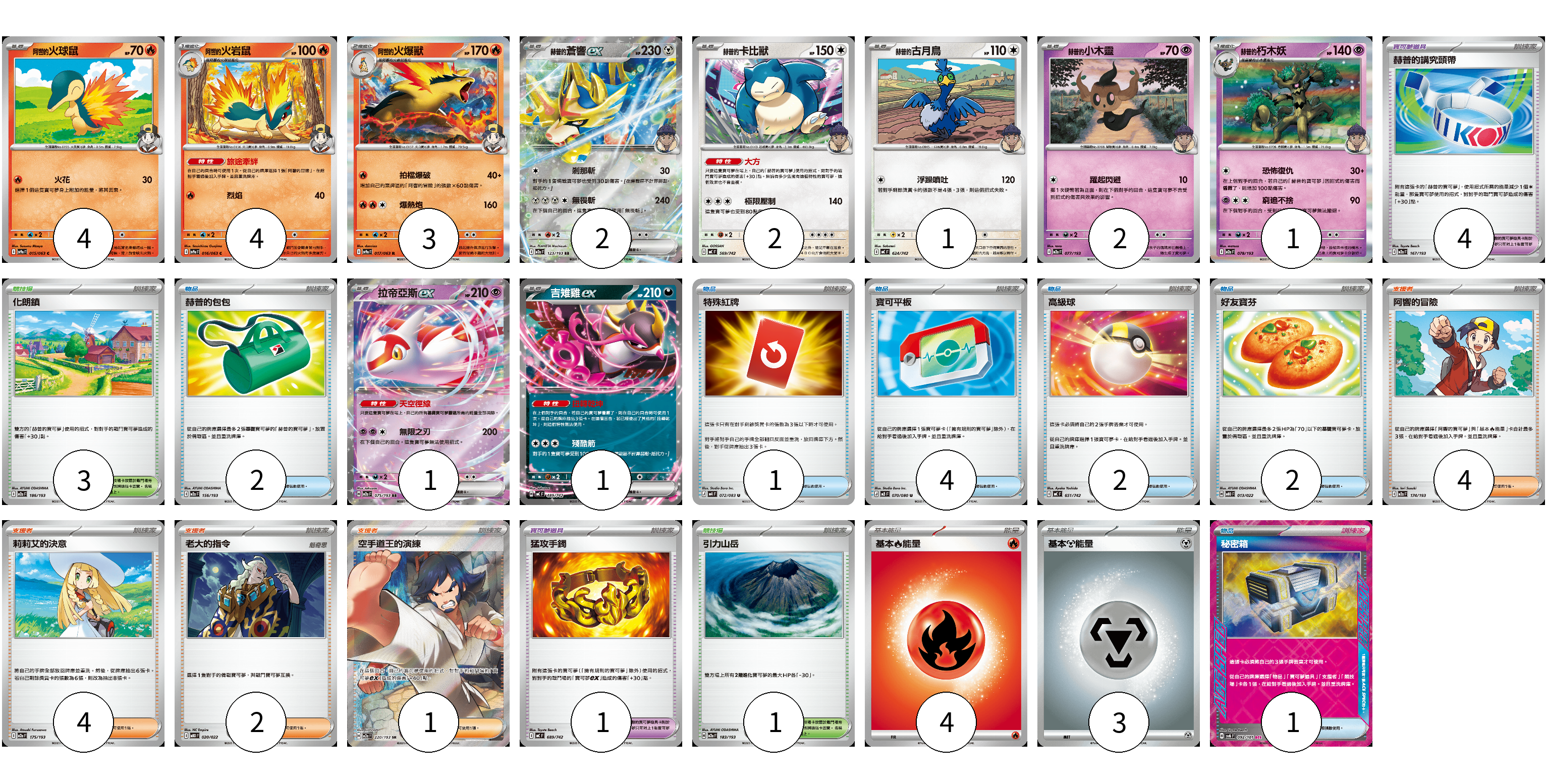 牌組構築方案 以此牌組為基礎新構築牌組 顯示卡面 顯示列表 寶可夢卡(21) 4 4 3 2 2 1 2 1 1 1 寶可夢道具(5) 4 1 物品卡(12) 2 1 4 2 2 1 支援者卡(11) 4 4 2 1 競技場卡(4) 3 1 能量卡(7) 4 3 寶可夢卡(21) 卡牌名稱 張數 卡牌名稱 張數 <阿響的>火球鼠 SV9a 015/063 04 <阿響的>火岩鼠 SV9a 016/063 04 <阿響的>火爆獸 SV9a 017/063 03 赫普的蒼響ex M2a 123/193 02 赫普的卡比獸 MC 569/742 02 赫普的古月鳥 MC 624/742 01 赫普的小木靈 M2a 077/193 02 赫普的朽木妖 M2a 078/193 01 拉帝亞斯ex M2a 075/193 01 吉雉雞ex MC 489/742 01 寶可夢道具(5) 卡牌名稱 張數 卡牌名稱 張數 赫普的講究頭帶 M2a 167/193 04 猛攻手鐲 MC 689/742 01 物品卡(12) 卡牌名稱 張數 卡牌名稱 張數 赫普的包包 M2a 156/193 02 特殊紅牌 M4 072/083 01 寶可平板 M3 070/080 04 高級球 MC 651/742 02 好友寶芬 MBD 013/022 02 秘密箱 SV6 092/101 01 支援者卡(11) 卡牌名稱 張數 卡牌名稱 張數 阿響的冒險 M2a 174/193 04 莉莉艾的決意 M2a 175/193 04 老大的指令 MBD 020/022 02 空手道王的演練 M2a 220/193 01 競技場卡(4) 卡牌名稱 張數 卡牌名稱 張數 化朗鎮 M2a 186/193 03 引力山岳 M2a 183/193 01 能量卡(7) 卡牌名稱 張數 卡牌名稱 張數 基本【火】能量 MC FIR 04 基本【鋼】能量 M-P MET 03 以此牌組為基礎新構築牌組 牌組編碼 MePlYs-OKUQoK-yDpyGR copy 列印牌組單 牌組編碼已複製 分享至SNS